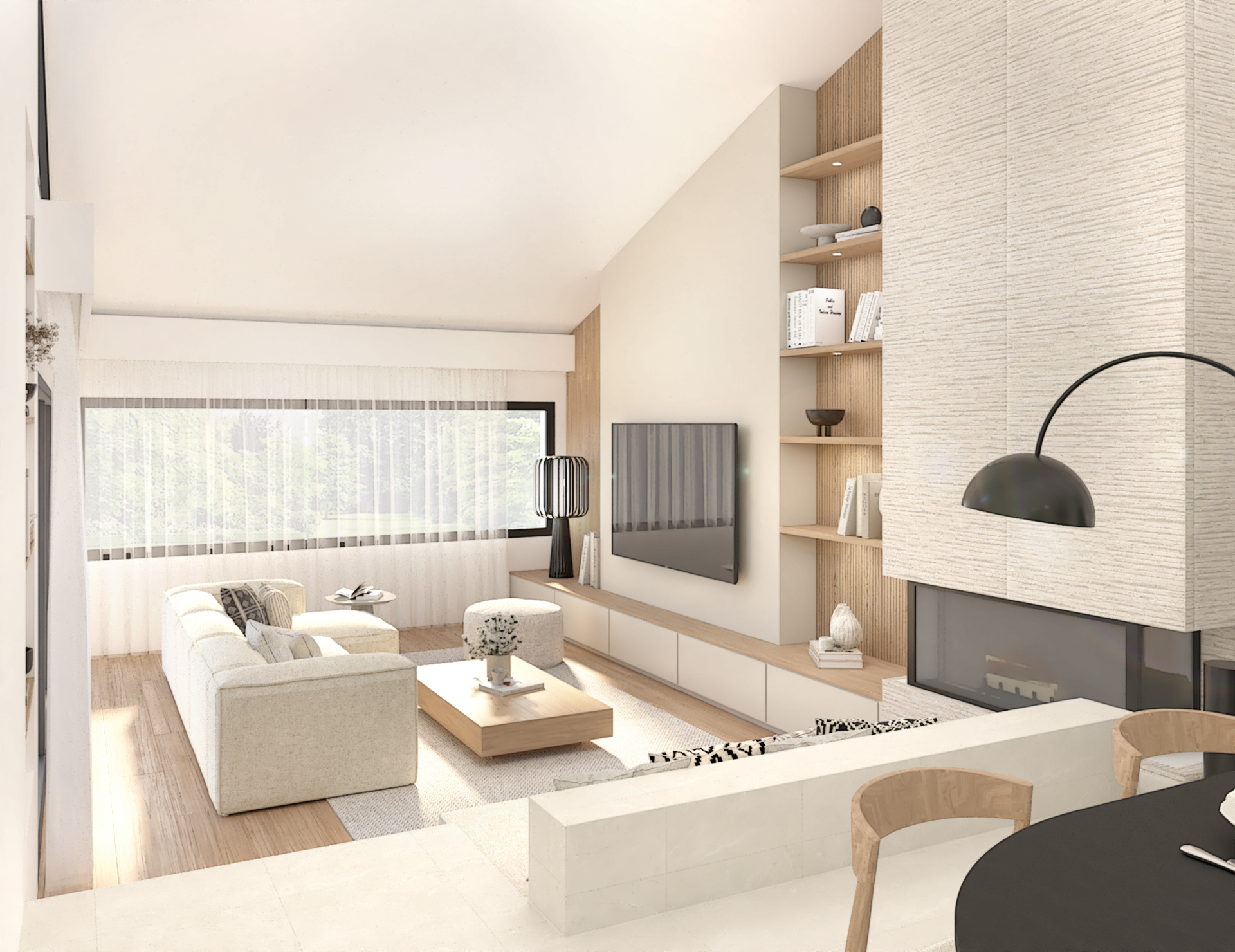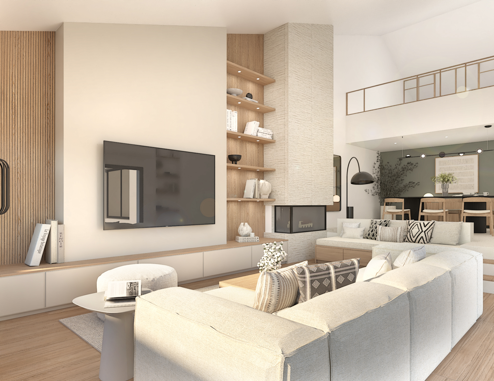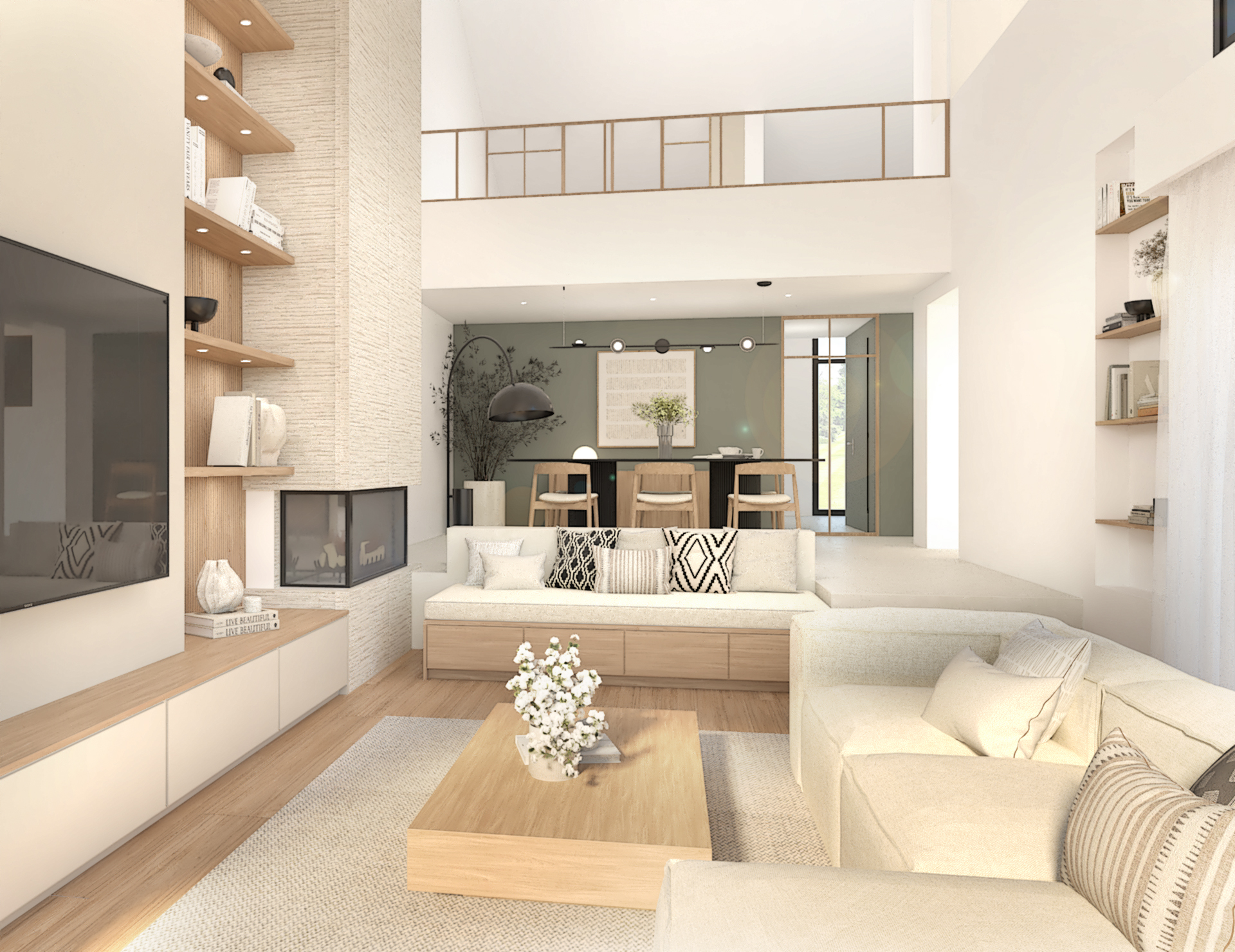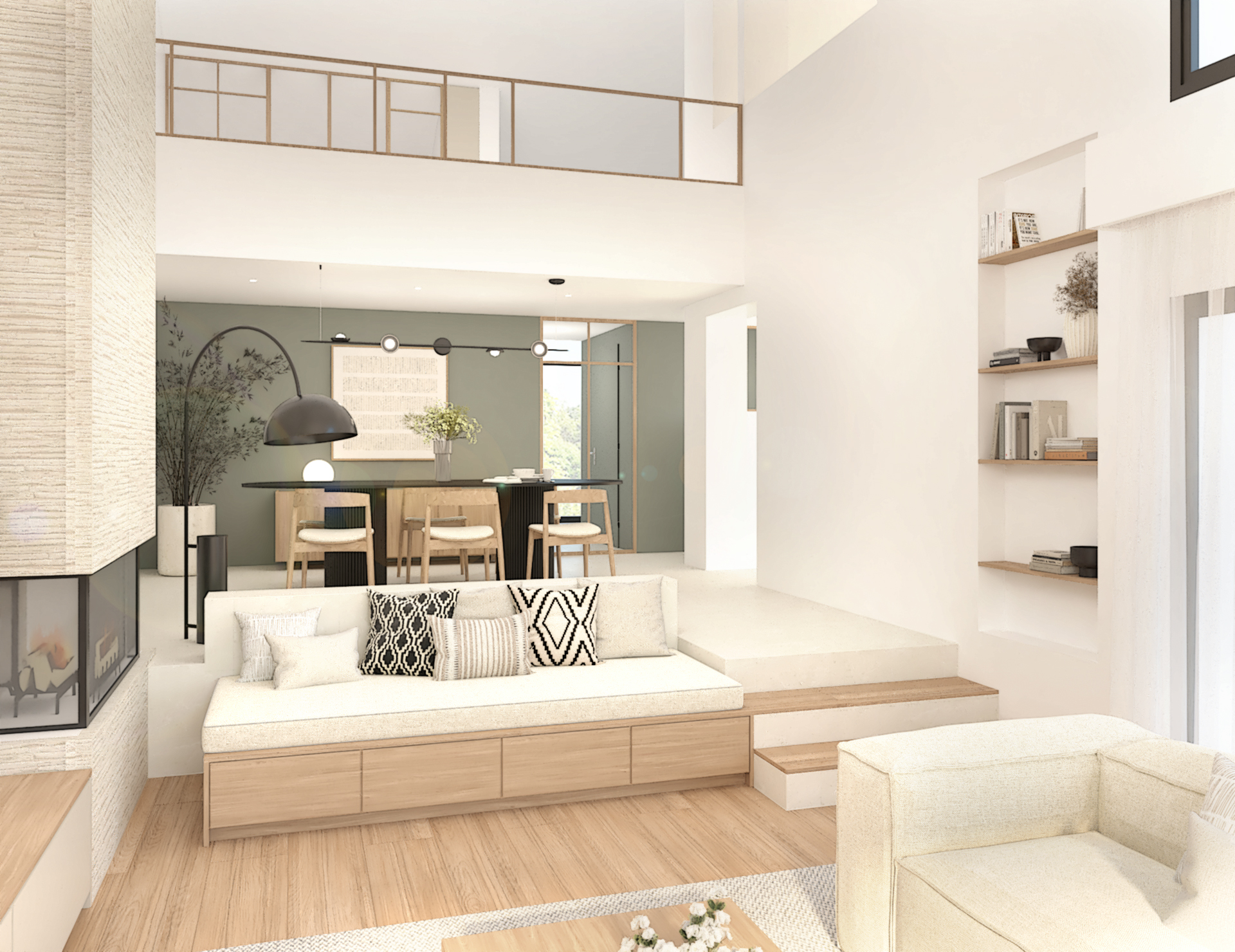 Décoration d’une maison de 150m2. L’objectif est de créer un espace aéré et fonctionnel. Les matériaux utilisés sont principalement naturels : bois, pierre naturelle (mur en pierre apparente), et textiles naturels. Cela apporte une sensation de chaleur et de bien-être. L’ensemble dégage une atmosphère calme et sereine, propice à la détente et à la convivialité.