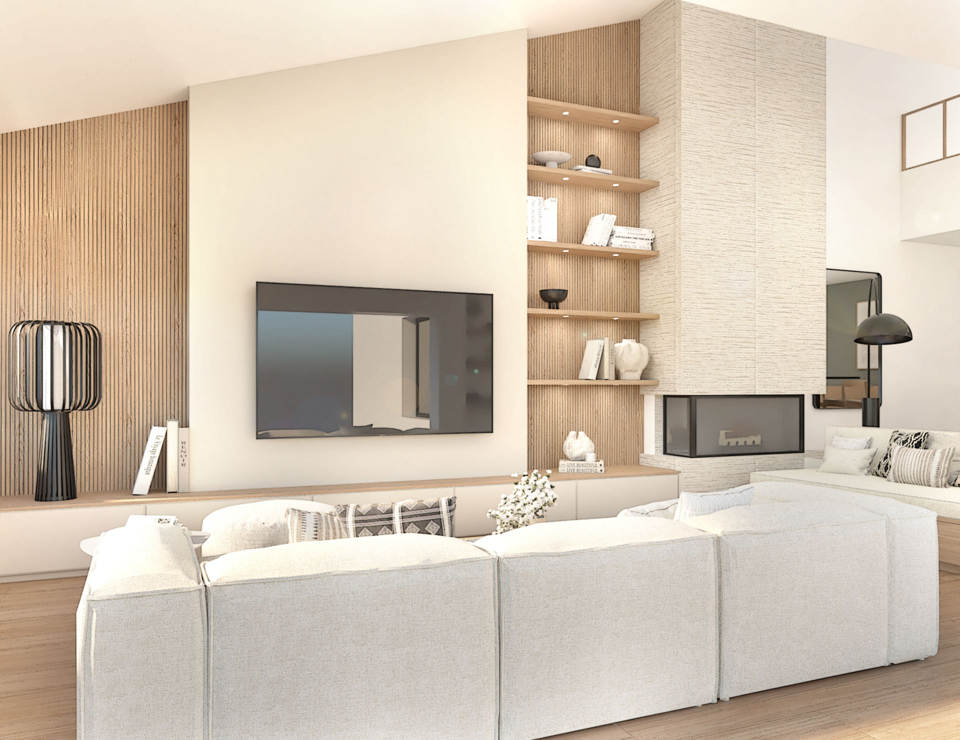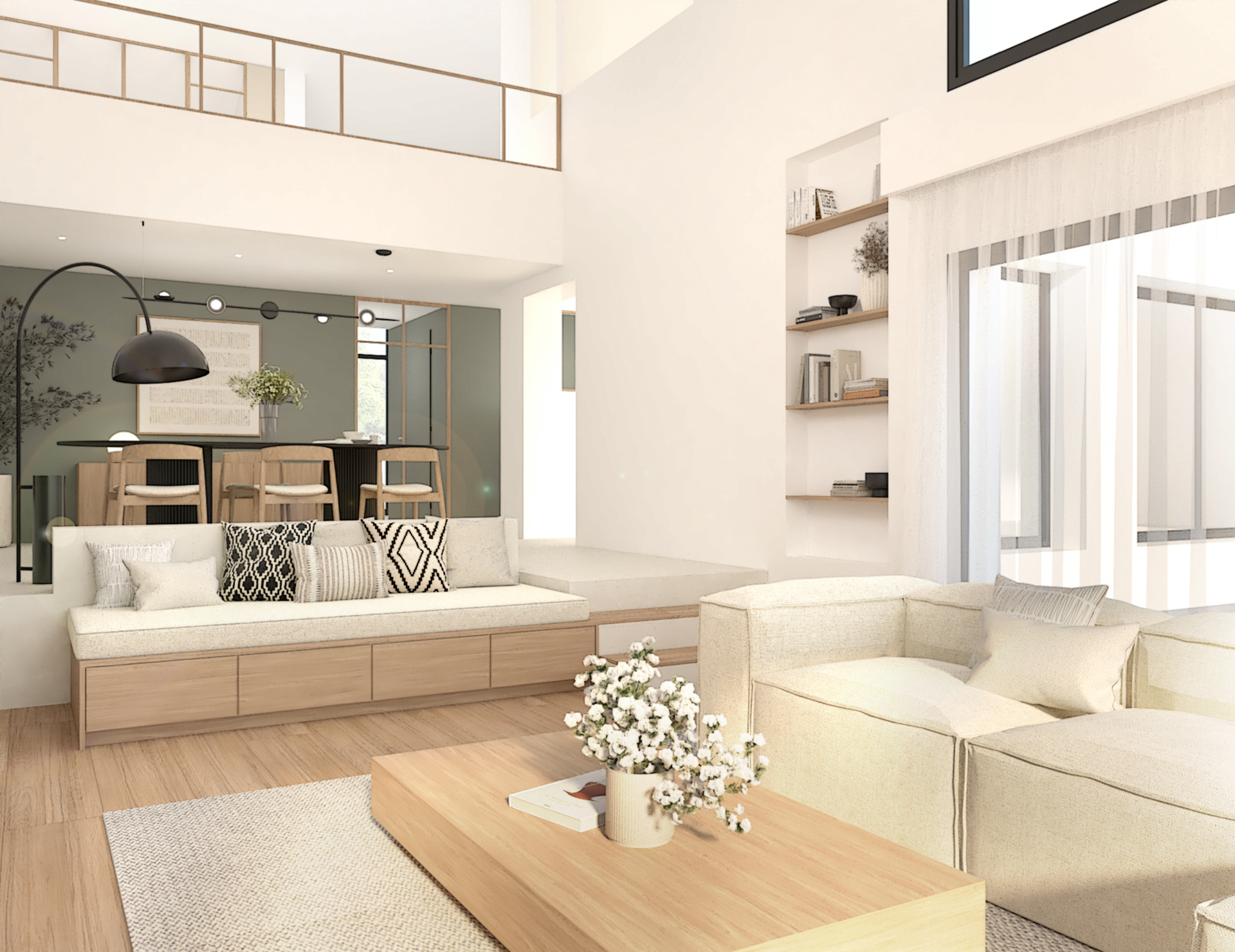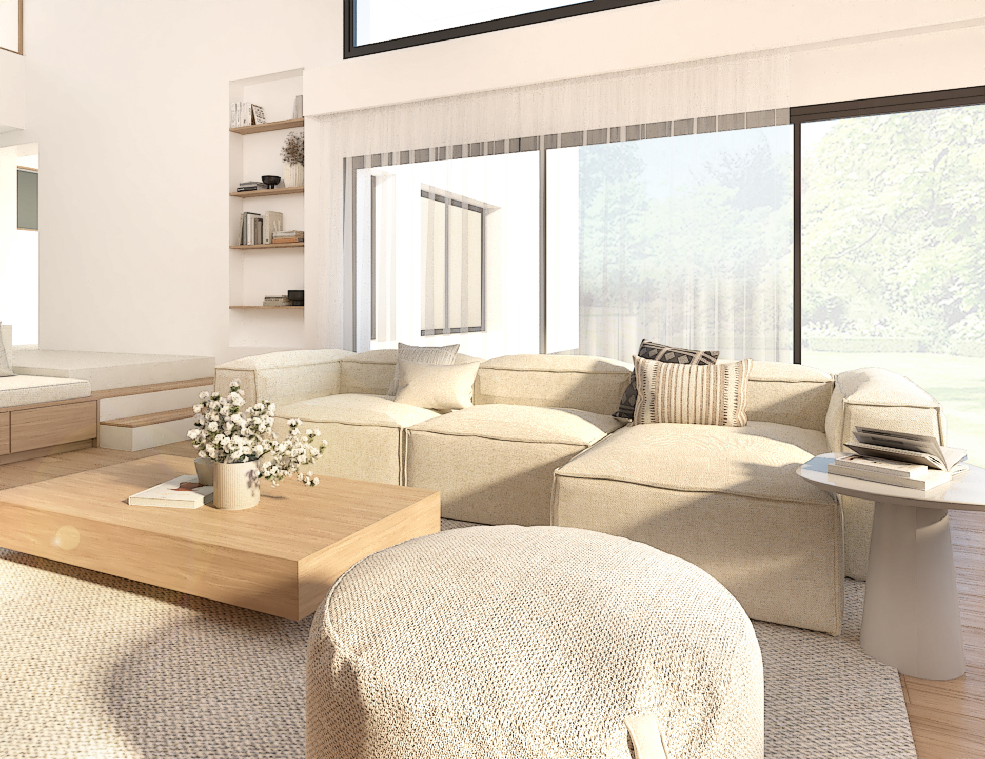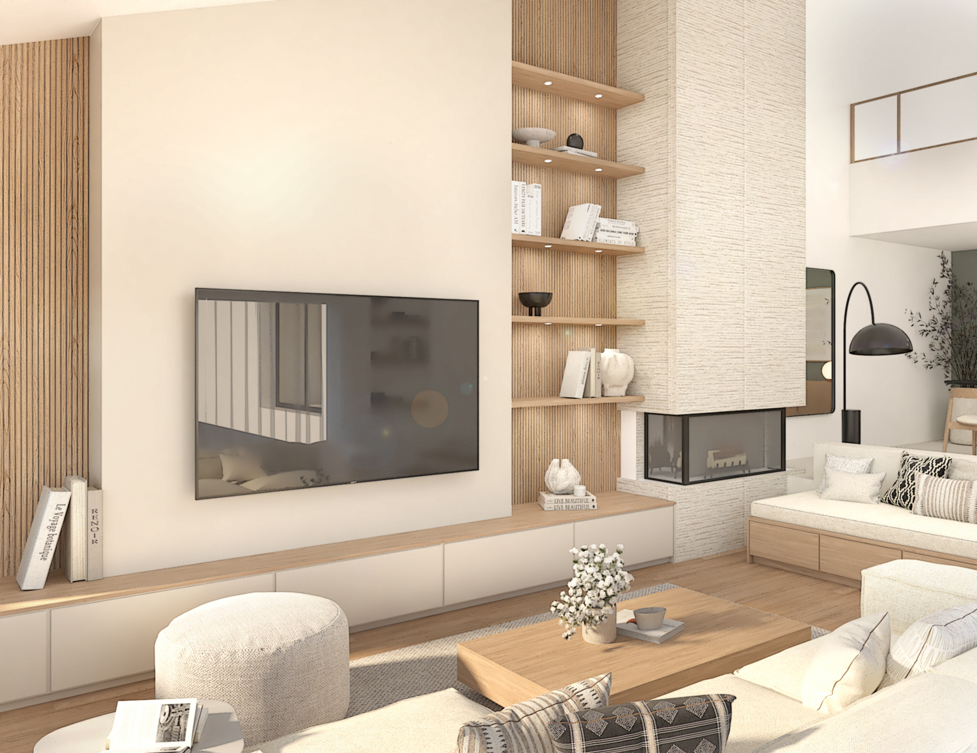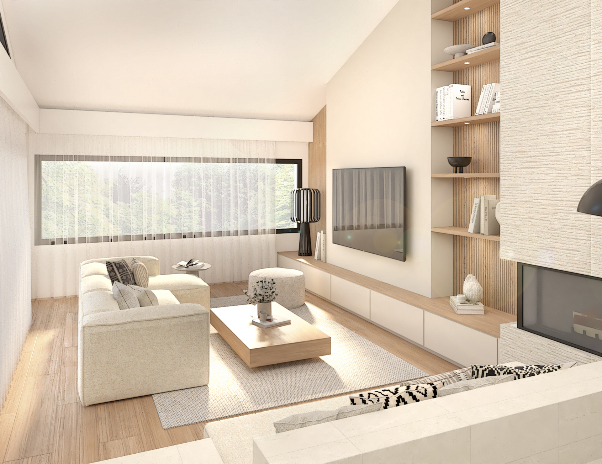 Décoration d’une maison de 150m2. L’objectif est de créer un espace aéré et fonctionnel. Les matériaux utilisés sont principalement naturels : bois, pierre naturelle (mur en pierre apparente), et textiles naturels. Cela apporte une sensation de chaleur et de bien-être. L’ensemble dégage une atmosphère calme et sereine, propice à la détente et à la convivialité.