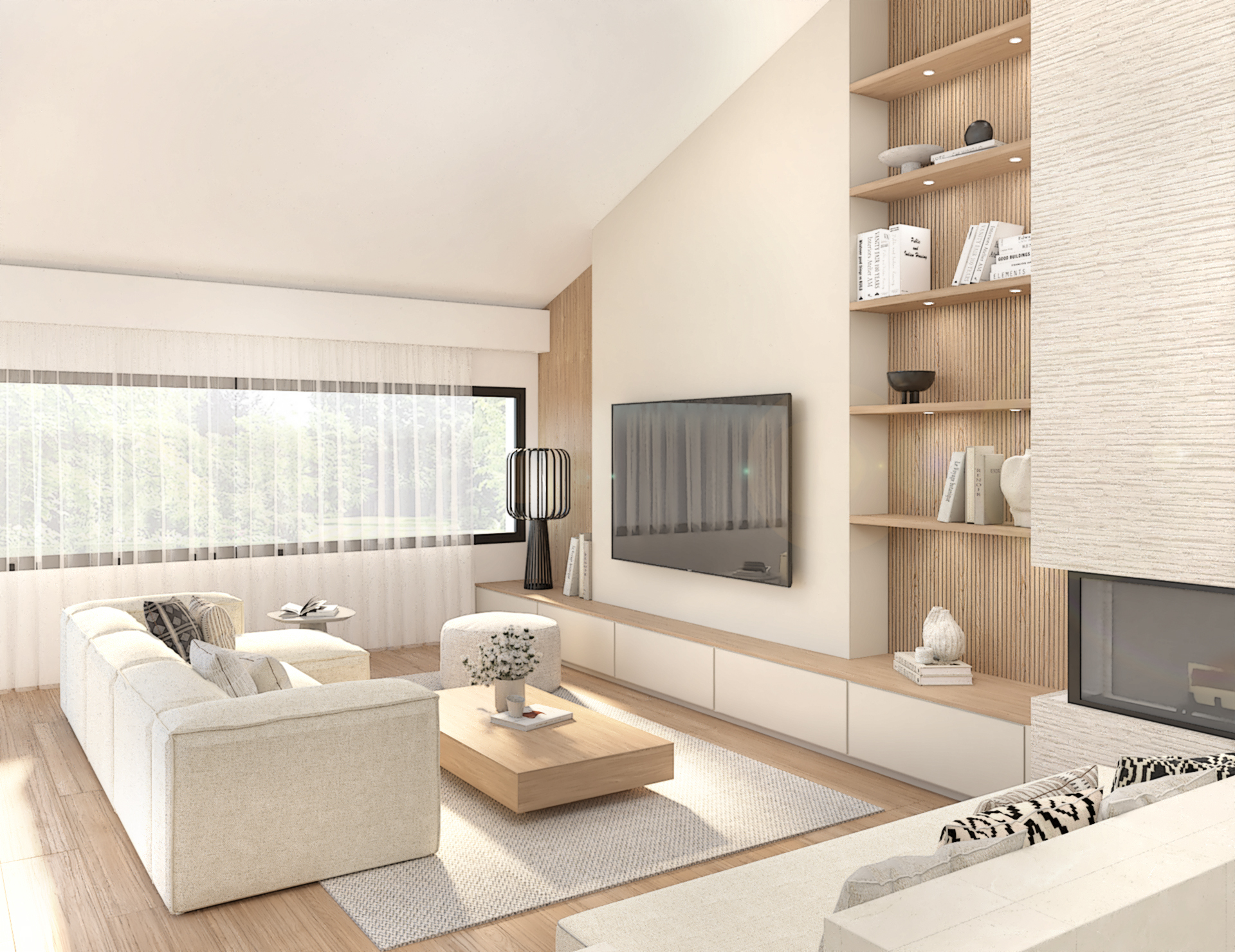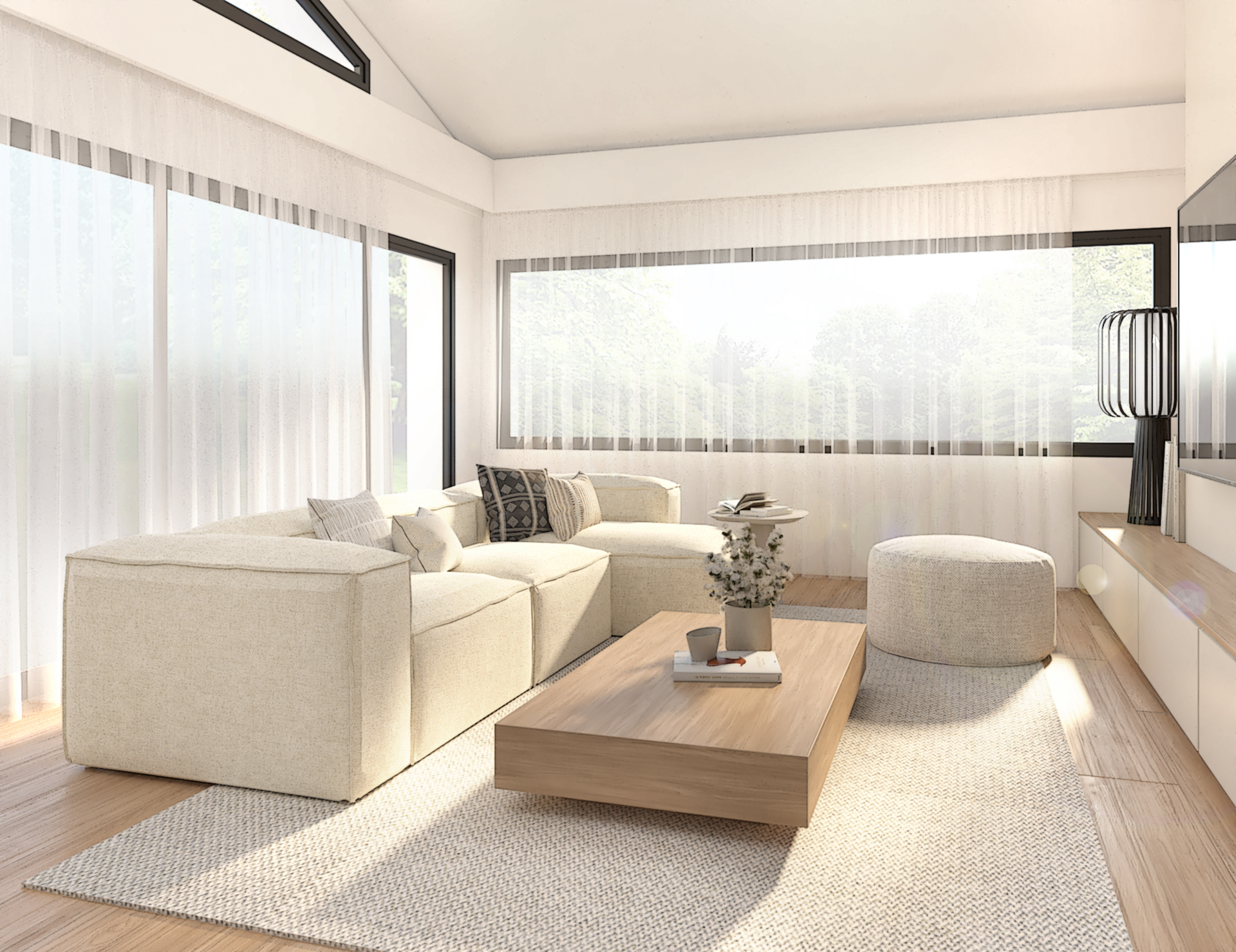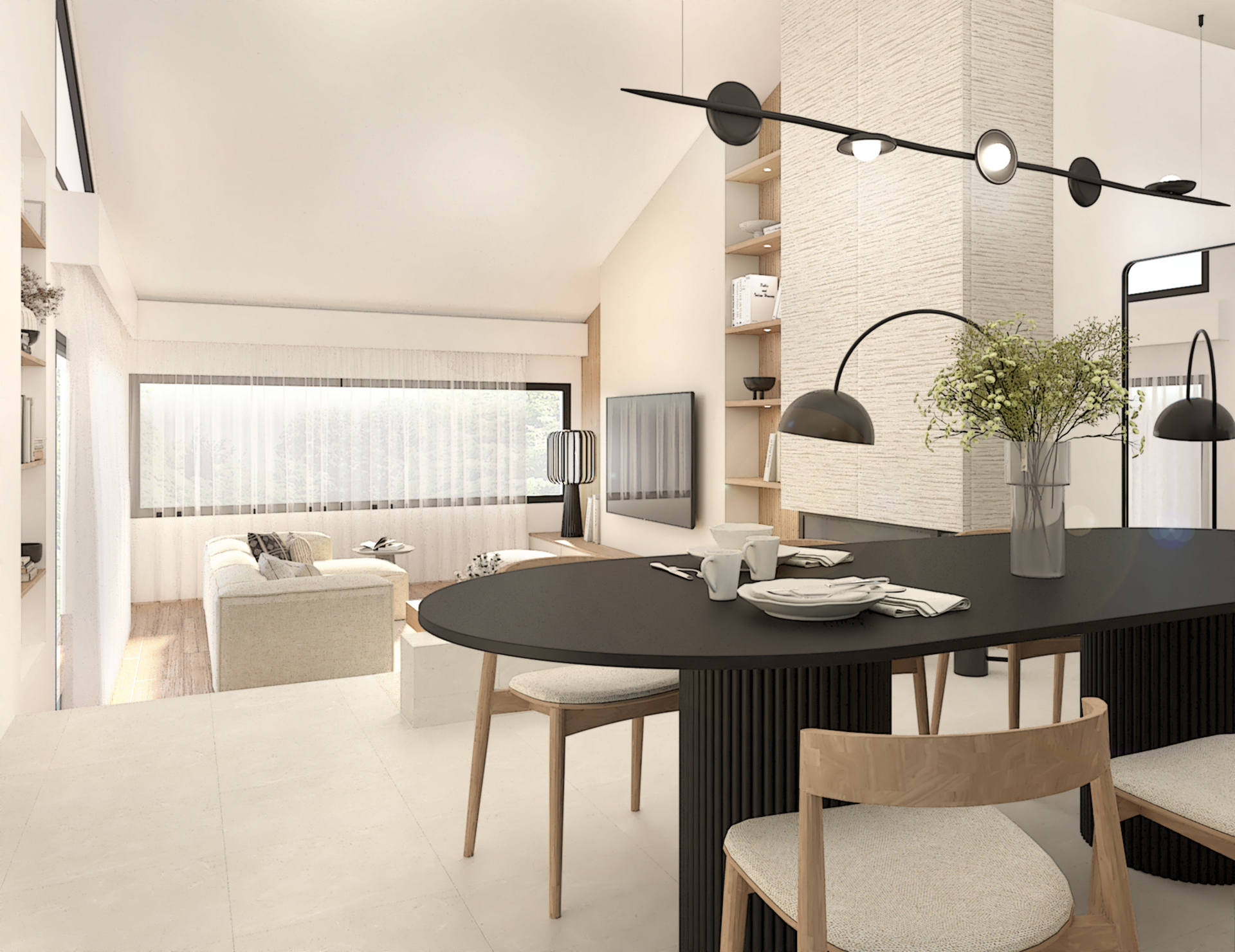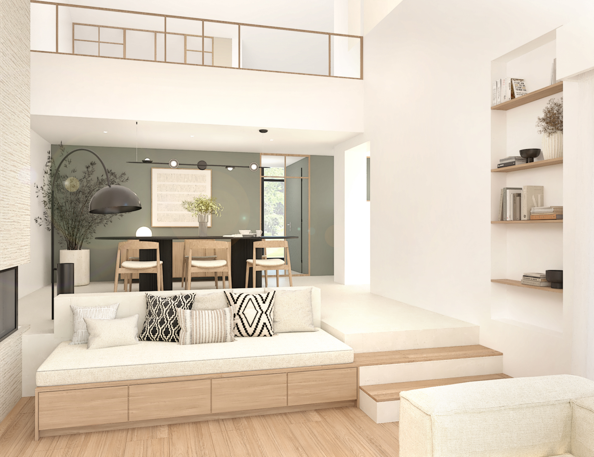 Décoration d’une maison de 150m2. L’objectif est de créer un espace aéré et fonctionnel. Les matériaux utilisés sont principalement naturels : bois, pierre naturelle (mur en pierre apparente), et textiles naturels. Cela apporte une sensation de chaleur et de bien-être. L’ensemble dégage une atmosphère calme et sereine, propice à la détente et à la convivialité.