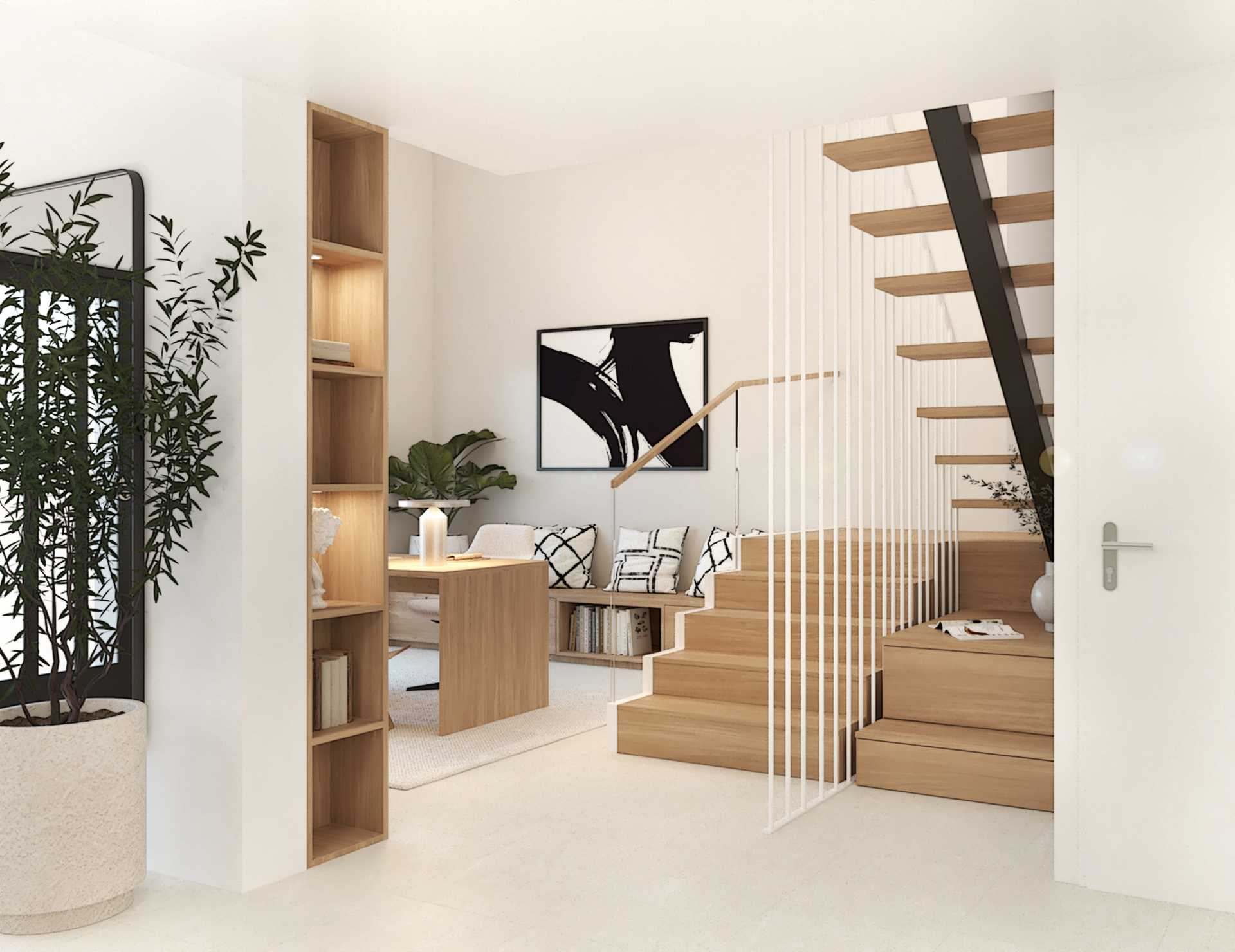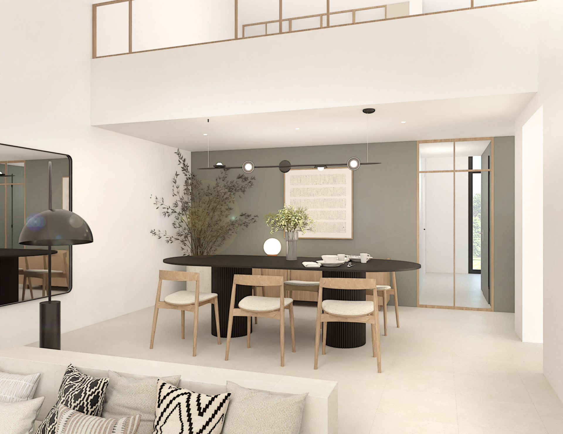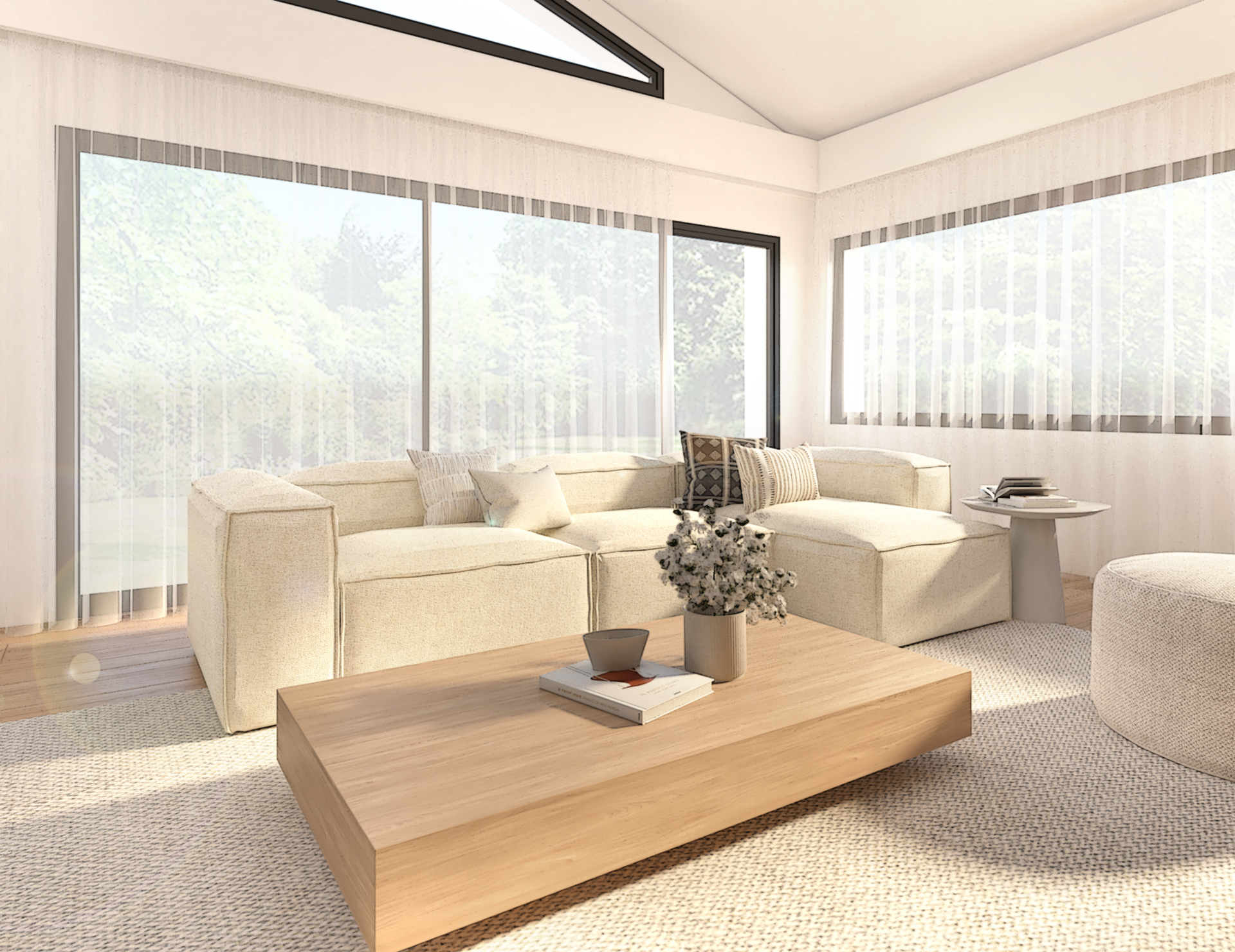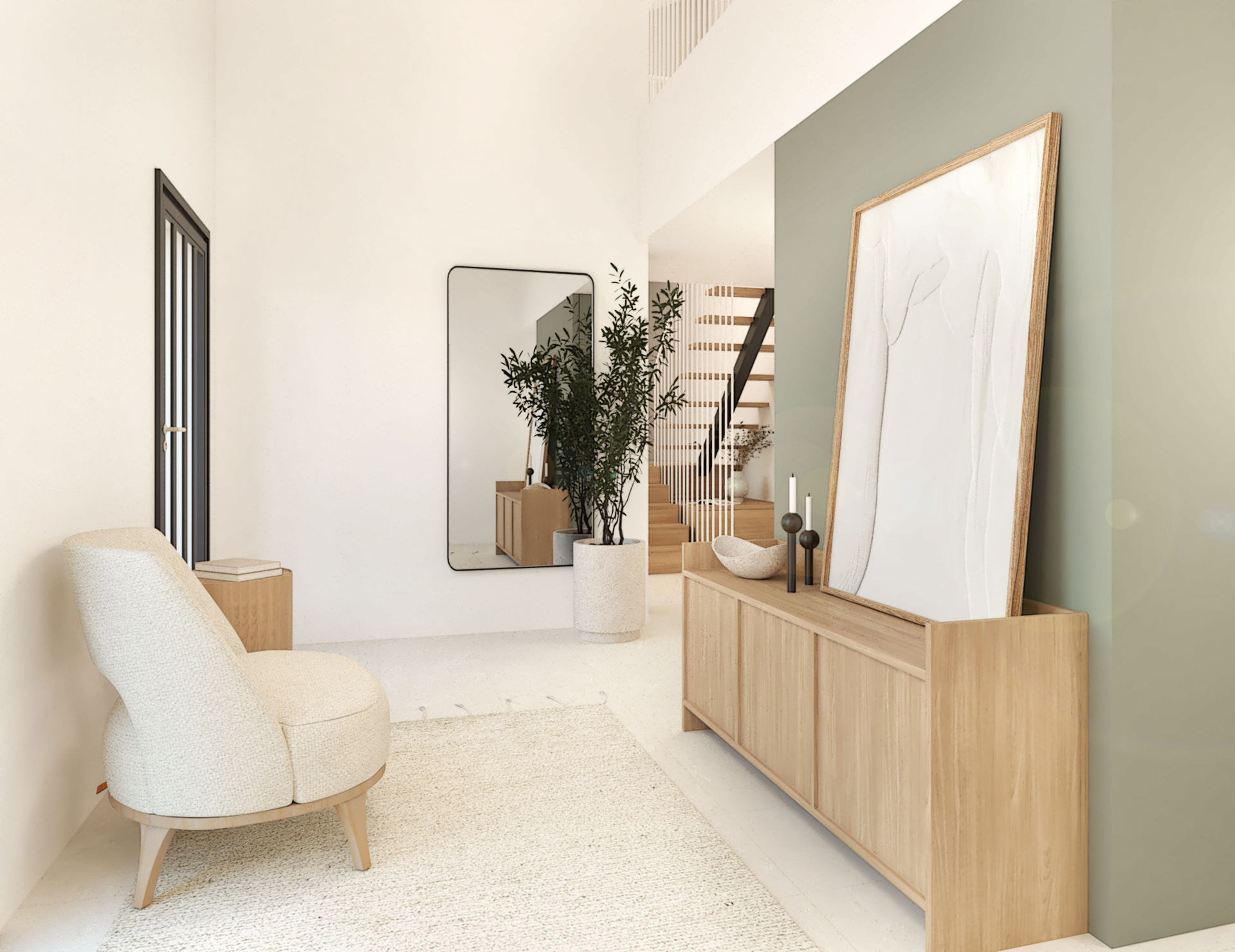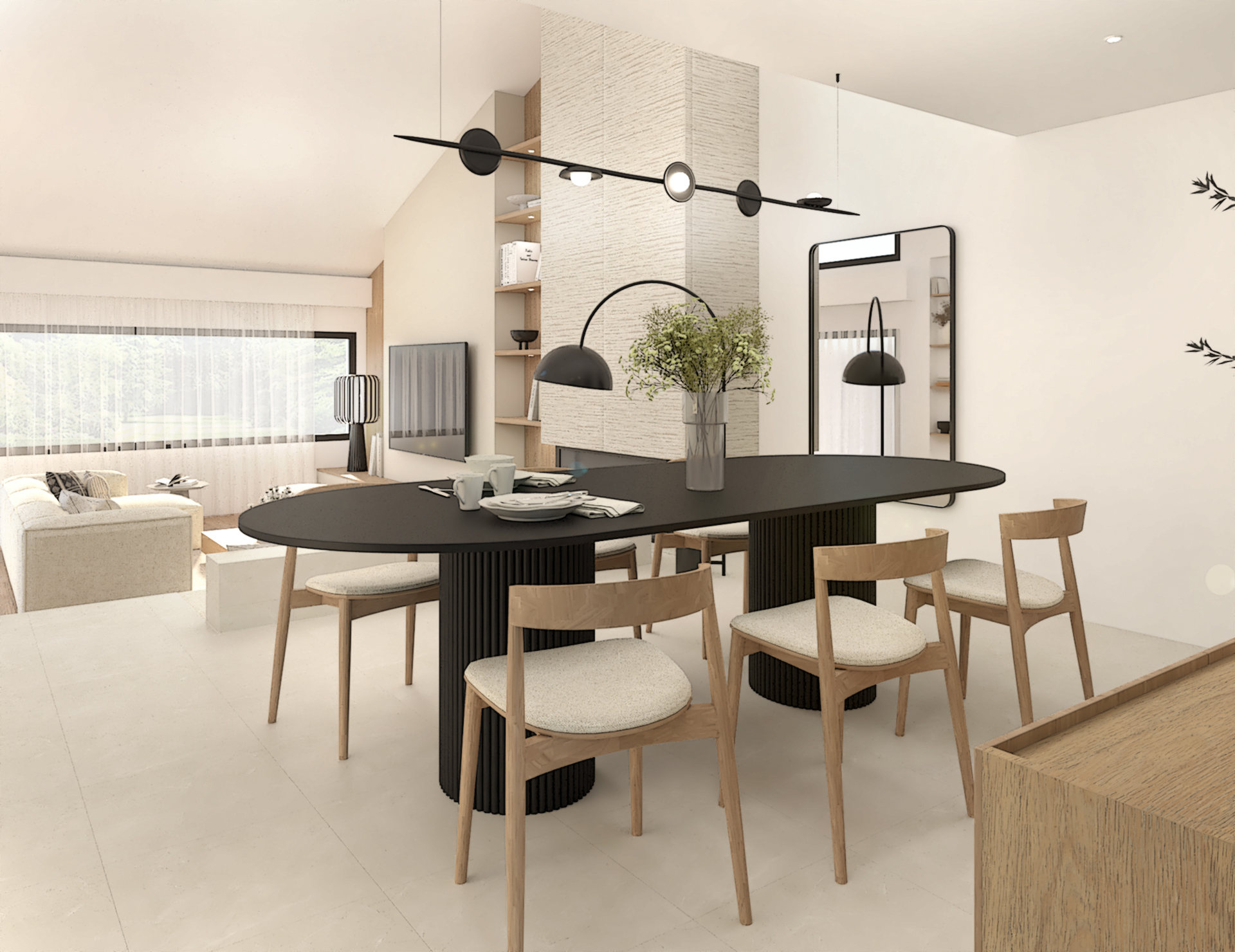 Décoration d’une maison de 150m2. L’objectif est de créer un espace aéré et fonctionnel. Les matériaux utilisés sont principalement naturels : bois, pierre naturelle (mur en pierre apparente), et textiles naturels. Cela apporte une sensation de chaleur et de bien-être. L’ensemble dégage une atmosphère calme et sereine, propice à la détente et à la convivialité.