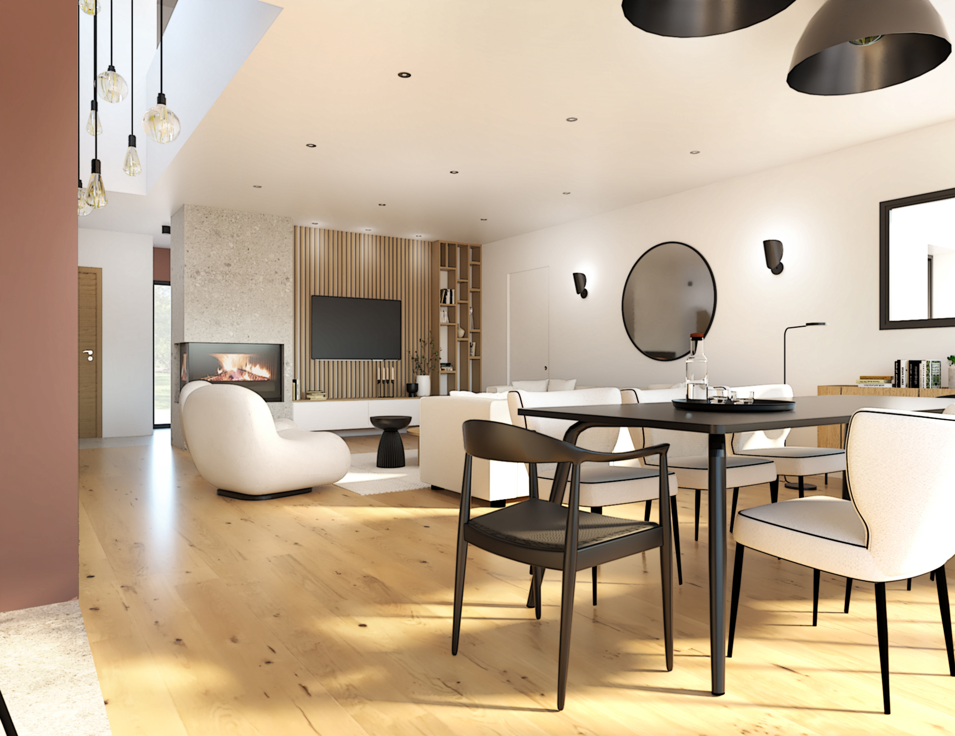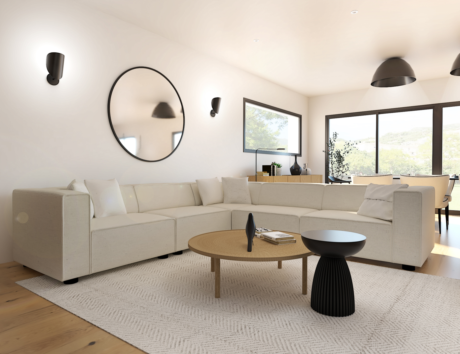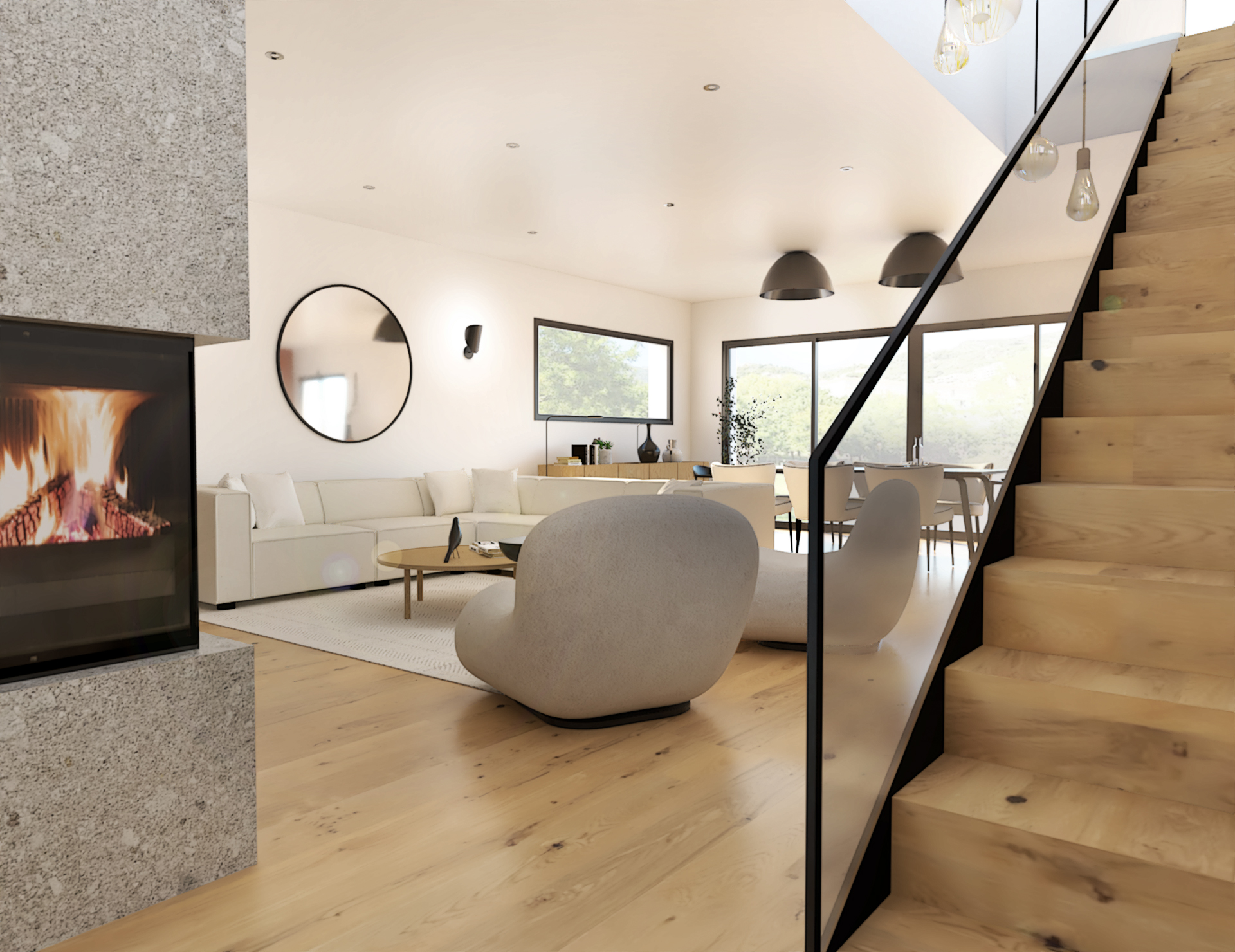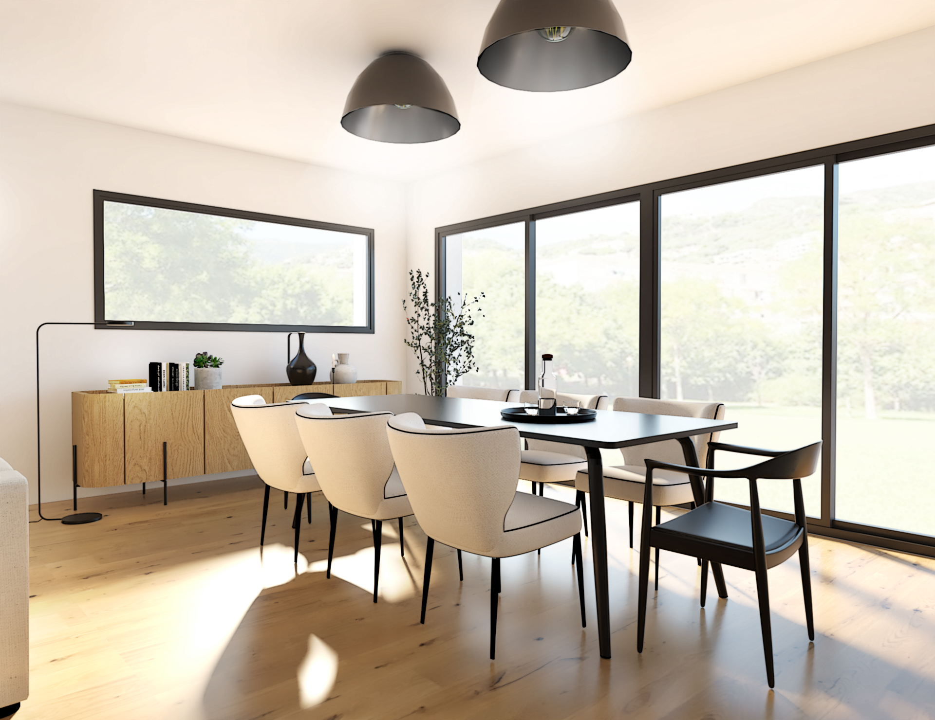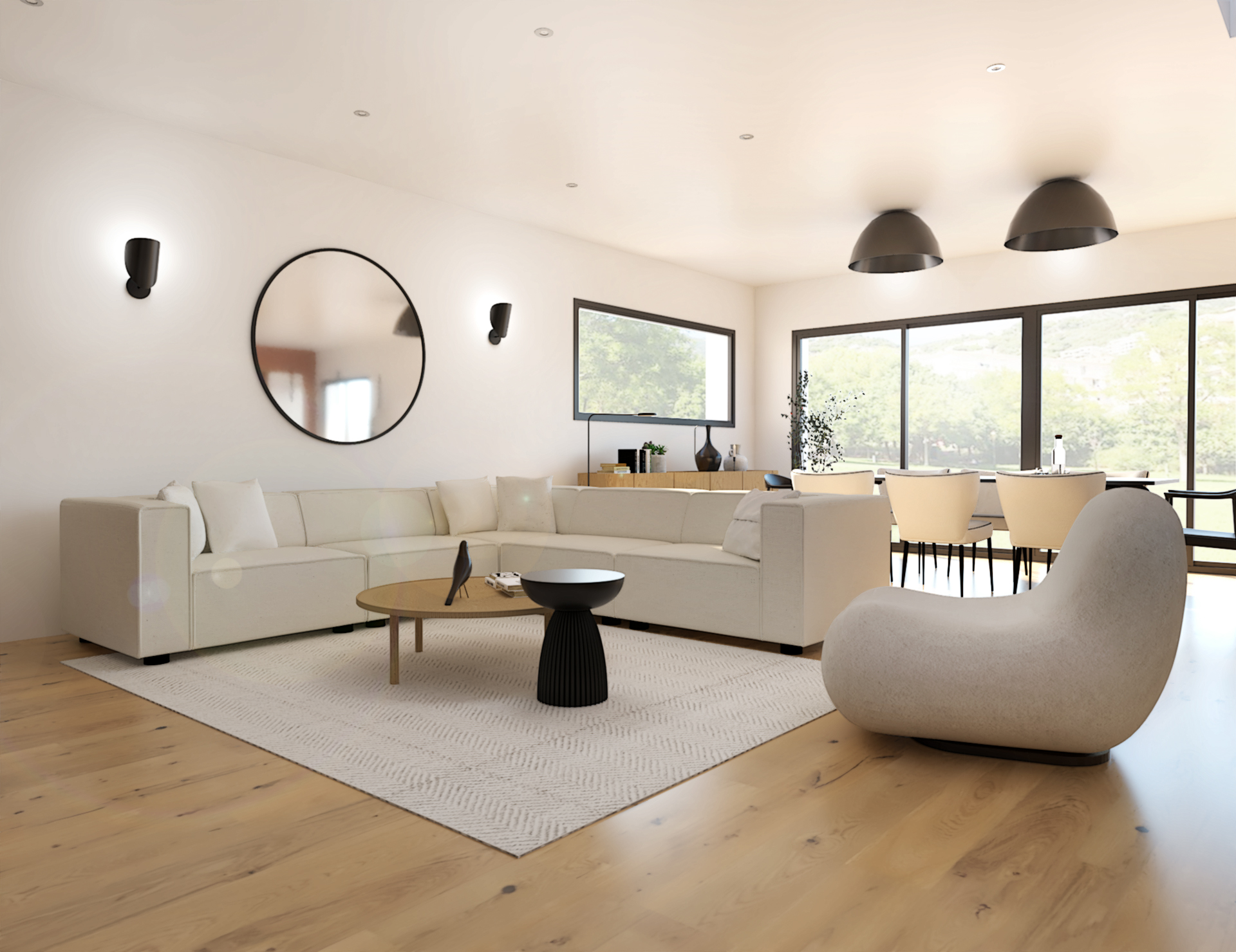 Suite à la construction de cette maison contemporaine, les clients m’ont contactés pour penser l’aménagement intérieur et créer la décoration de chaque espace. La majorité des pièces sont tournées vers l’extérieur pour profiter de la lumière naturelle. Le salon et la salle à manger restent ouverts sur la cuisine pour offrir un bel espace de convivialité à la famille. Des meubles sur mesure ont été pensés pour offrir des rangements. Ils délimitent les fonctions et offrent une unité esthétique à l’ensemble. Les agencements et la décoration créent un fil conducteur dans toute la maison.