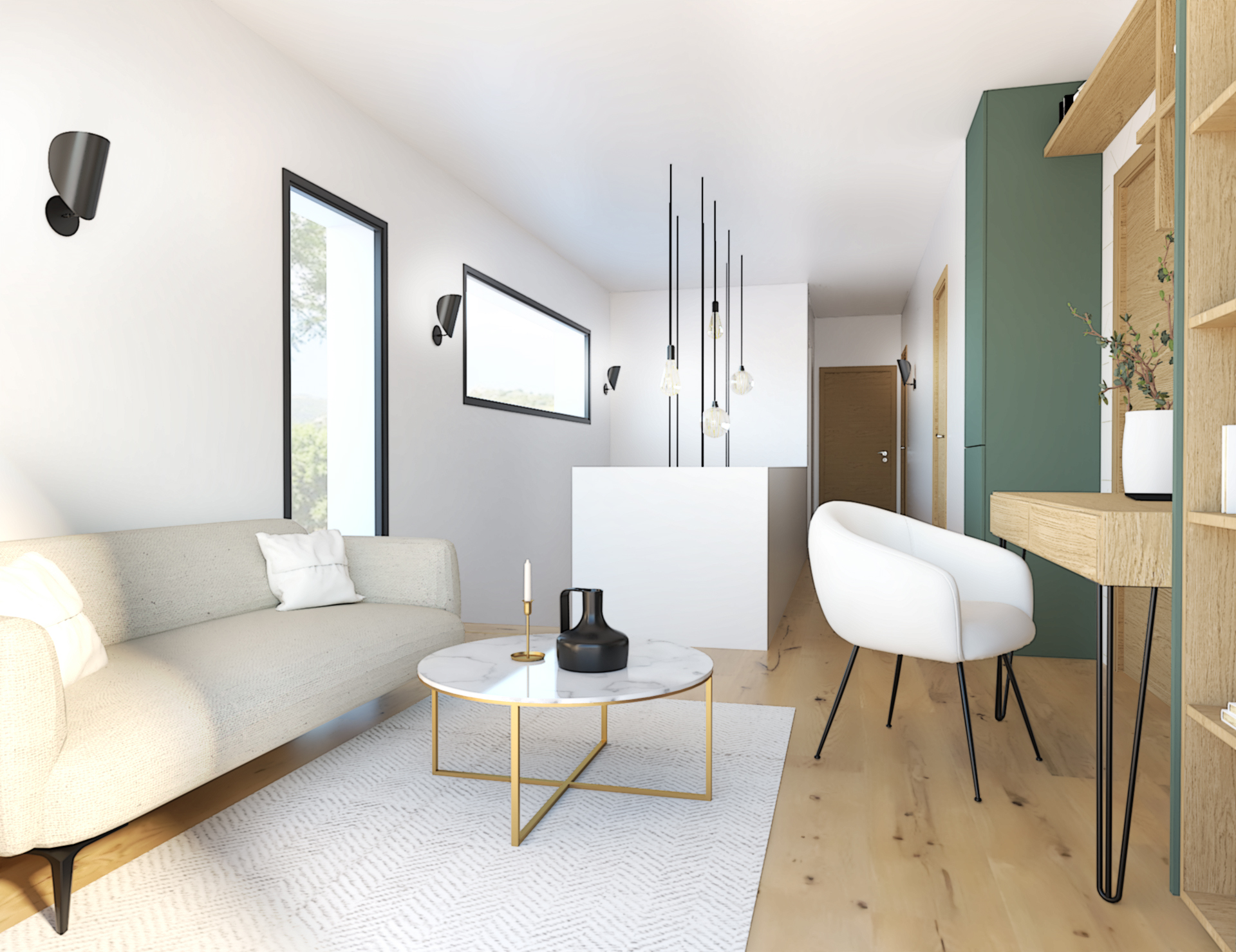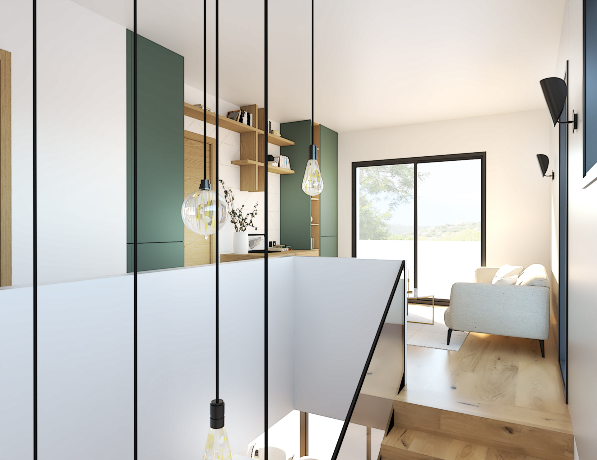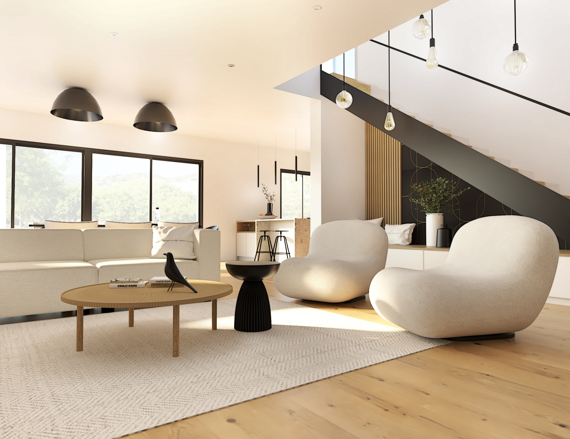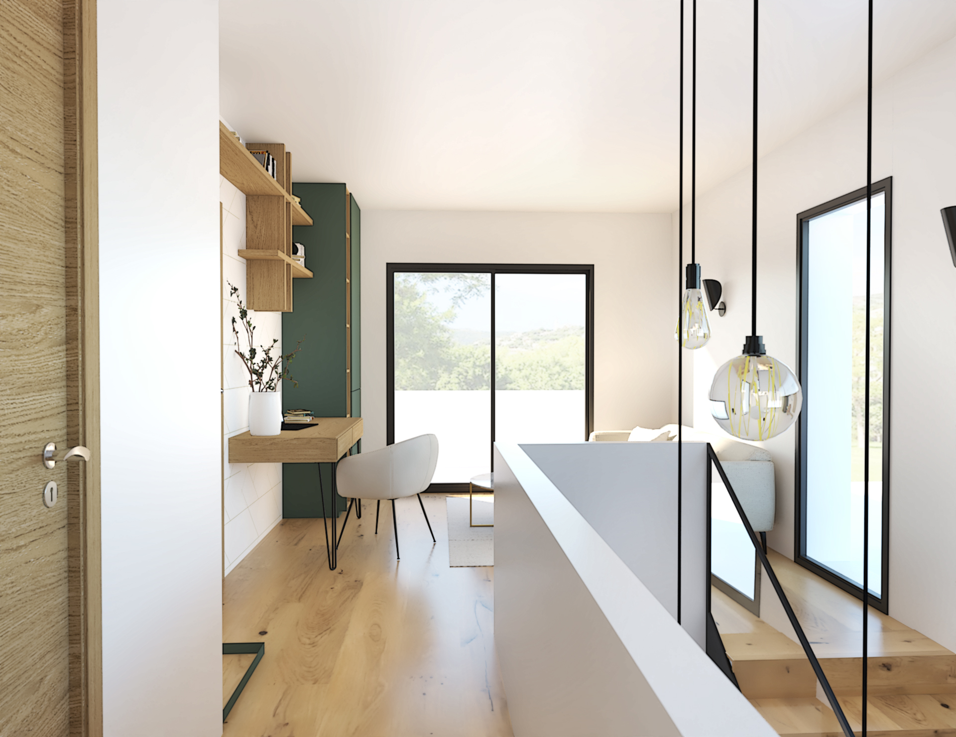 Suite à la construction de cette maison contemporaine, les clients m’ont contactés pour penser l’aménagement intérieur et créer la décoration de chaque espace. La majorité des pièces sont tournées vers l’extérieur pour profiter de la lumière naturelle. Le salon et la salle à manger restent ouverts sur la cuisine pour offrir un bel espace de convivialité à la famille. Des meubles sur mesure ont été pensés pour offrir des rangements. Ils délimitent les fonctions et offrent une unité esthétique à l’ensemble. Les agencements et la décoration créent un fil conducteur dans toute la maison.