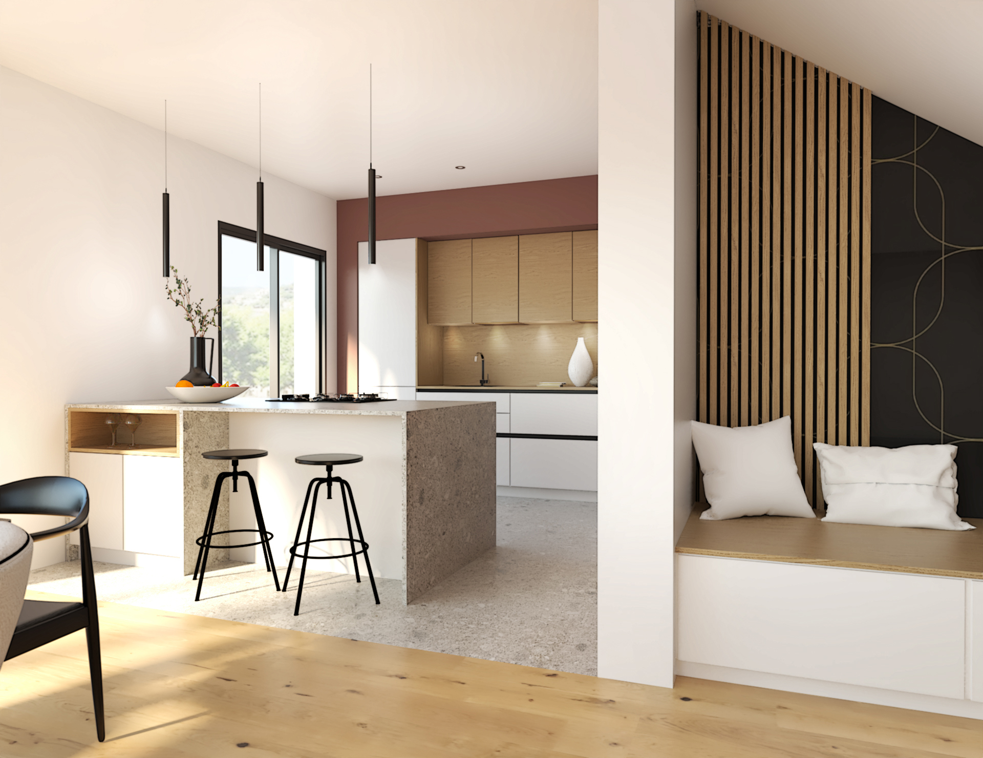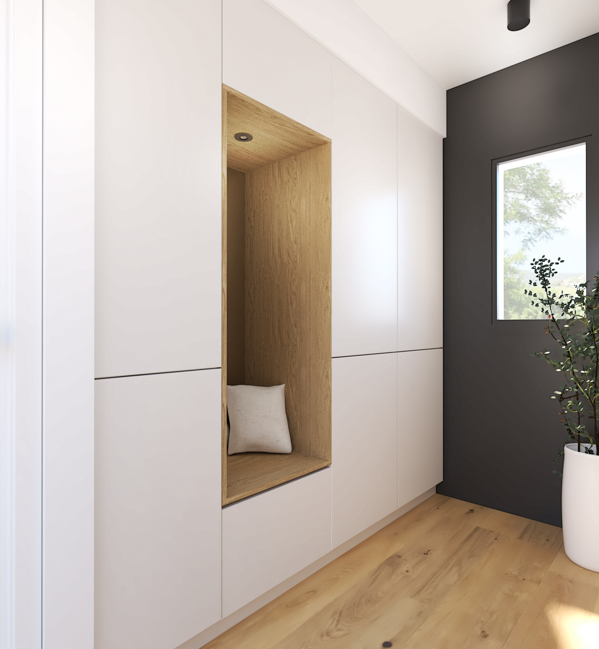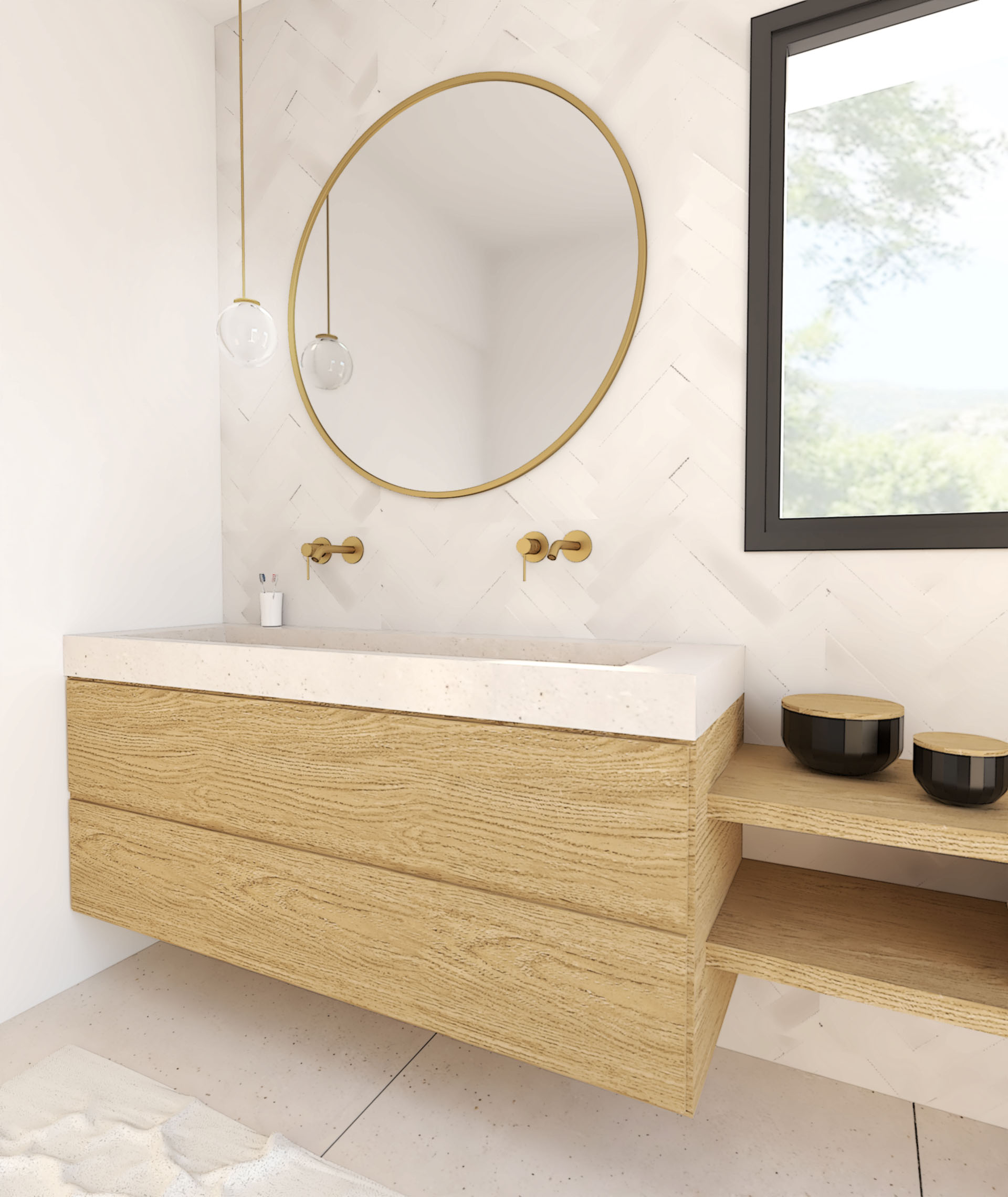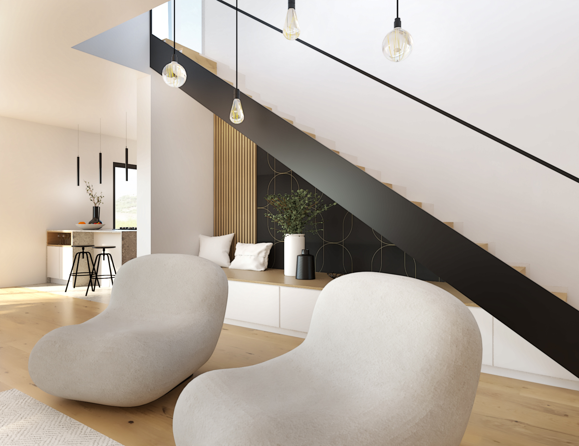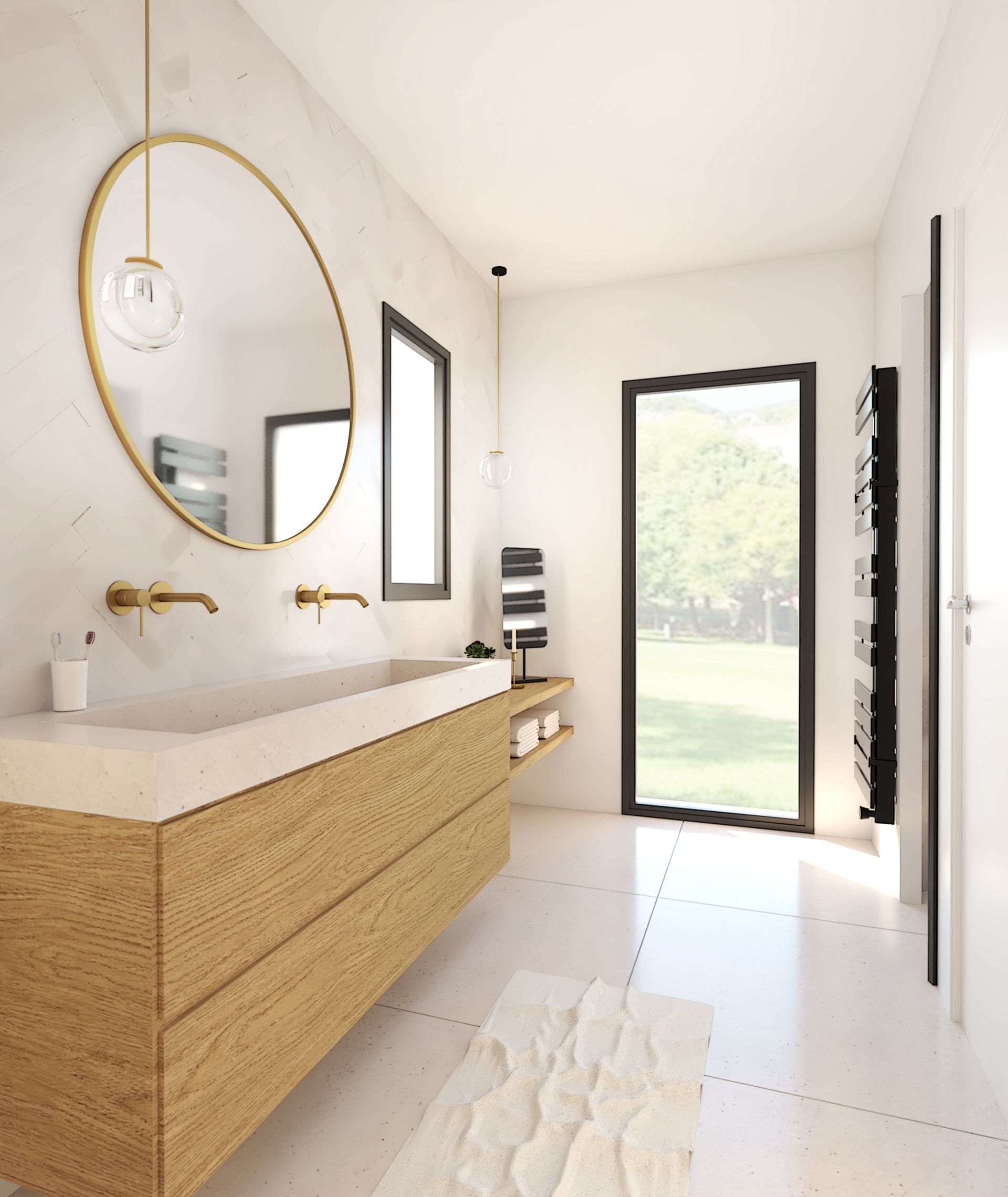 Suite à la construction de cette maison contemporaine, les clients m’ont contactés pour penser l’aménagement intérieur et créer la décoration de chaque espace. La majorité des pièces sont tournées vers l’extérieur pour profiter de la lumière naturelle. Le salon et la salle à manger restent ouverts sur la cuisine pour offrir un bel espace de convivialité à la famille. Des meubles sur mesure ont été pensés pour offrir des rangements. Ils délimitent les fonctions et offrent une unité esthétique à l’ensemble. Les agencements et la décoration créent un fil conducteur dans toute la maison.