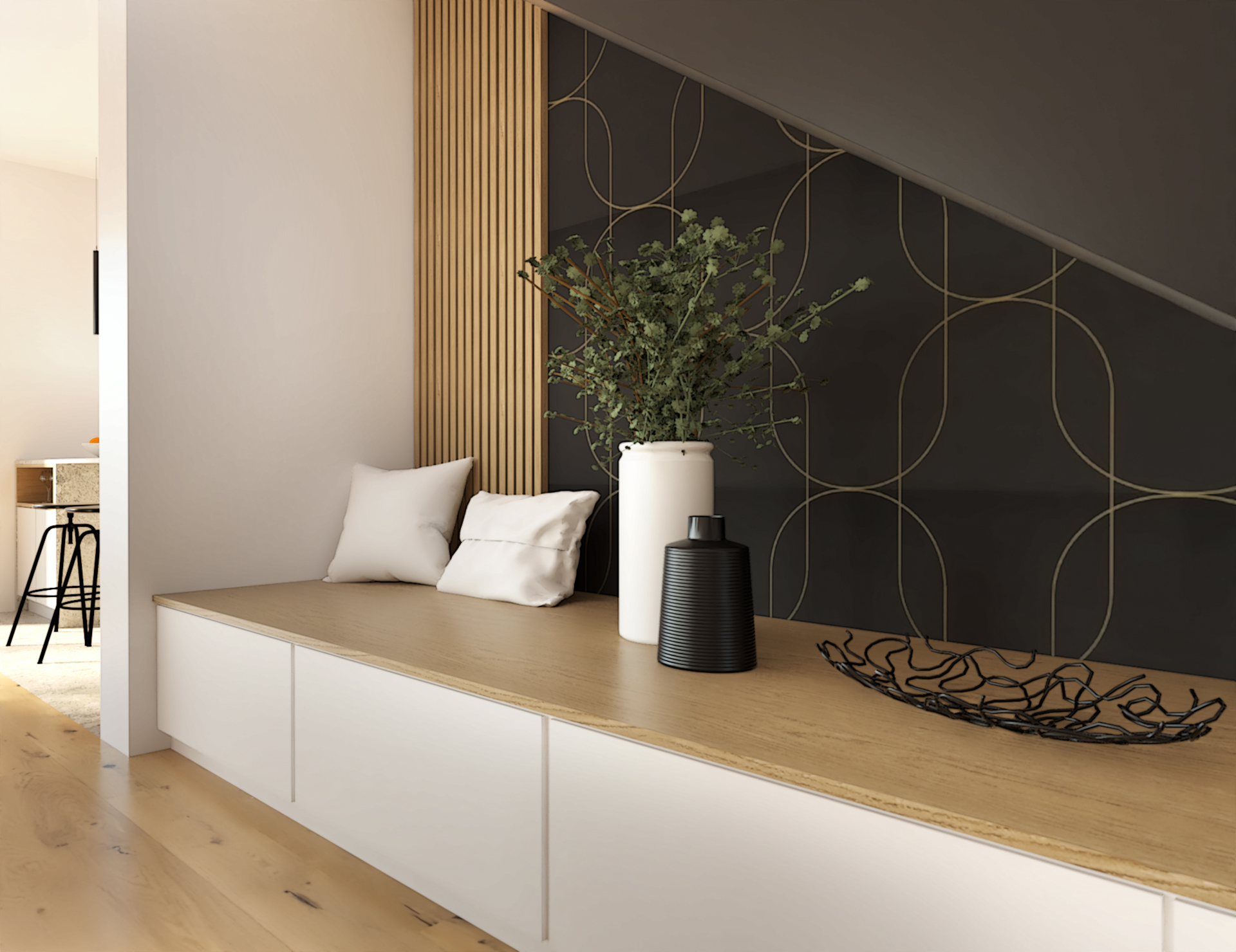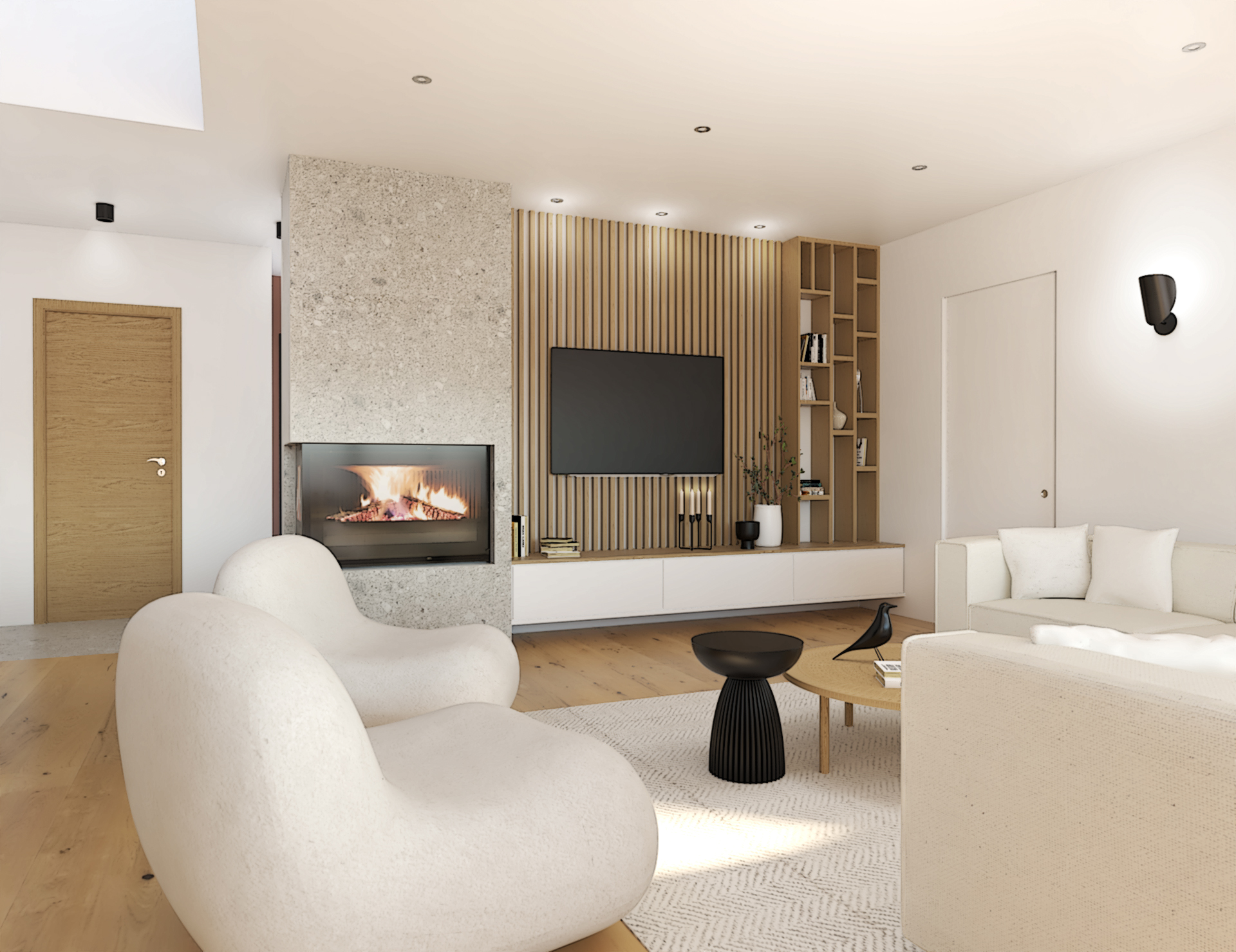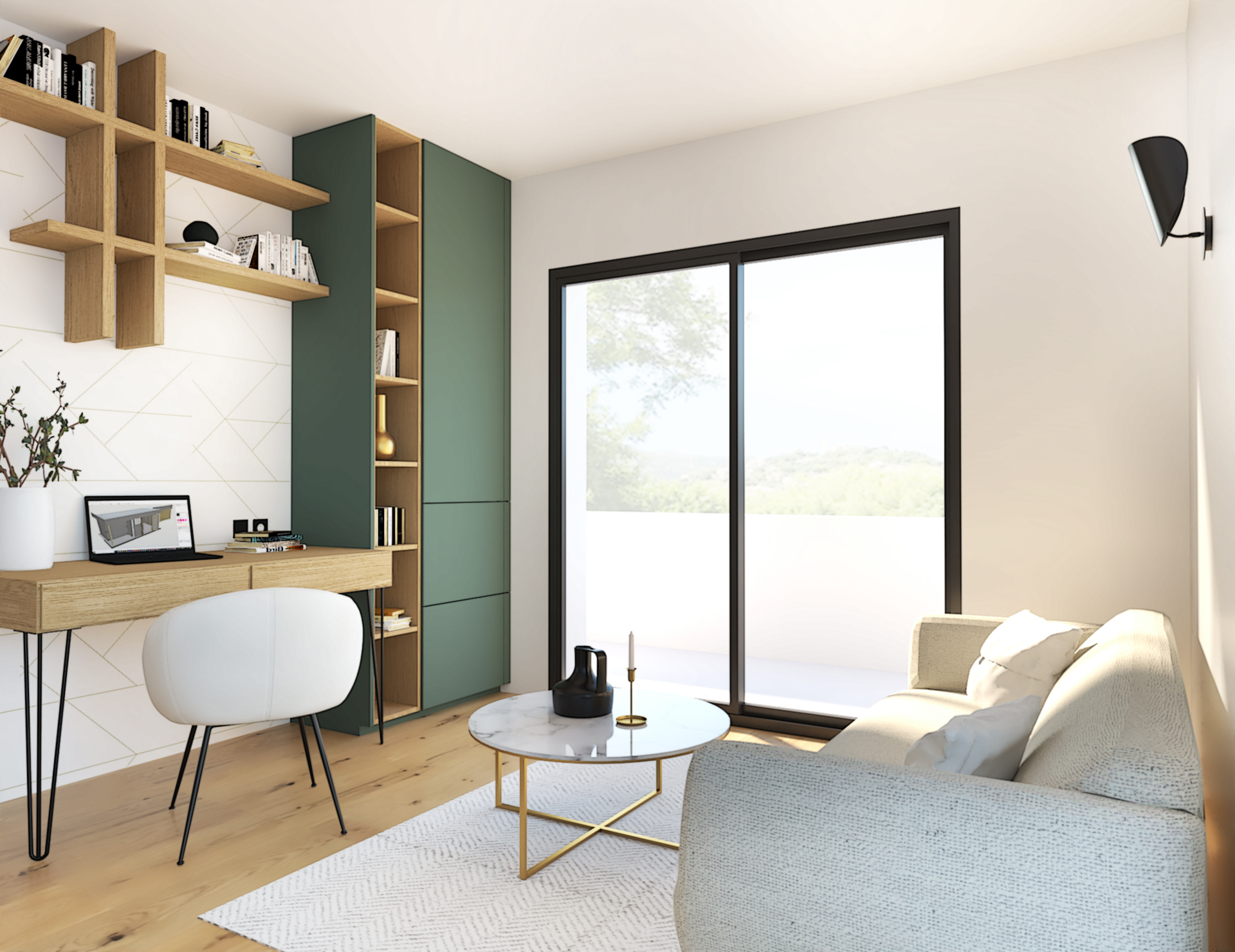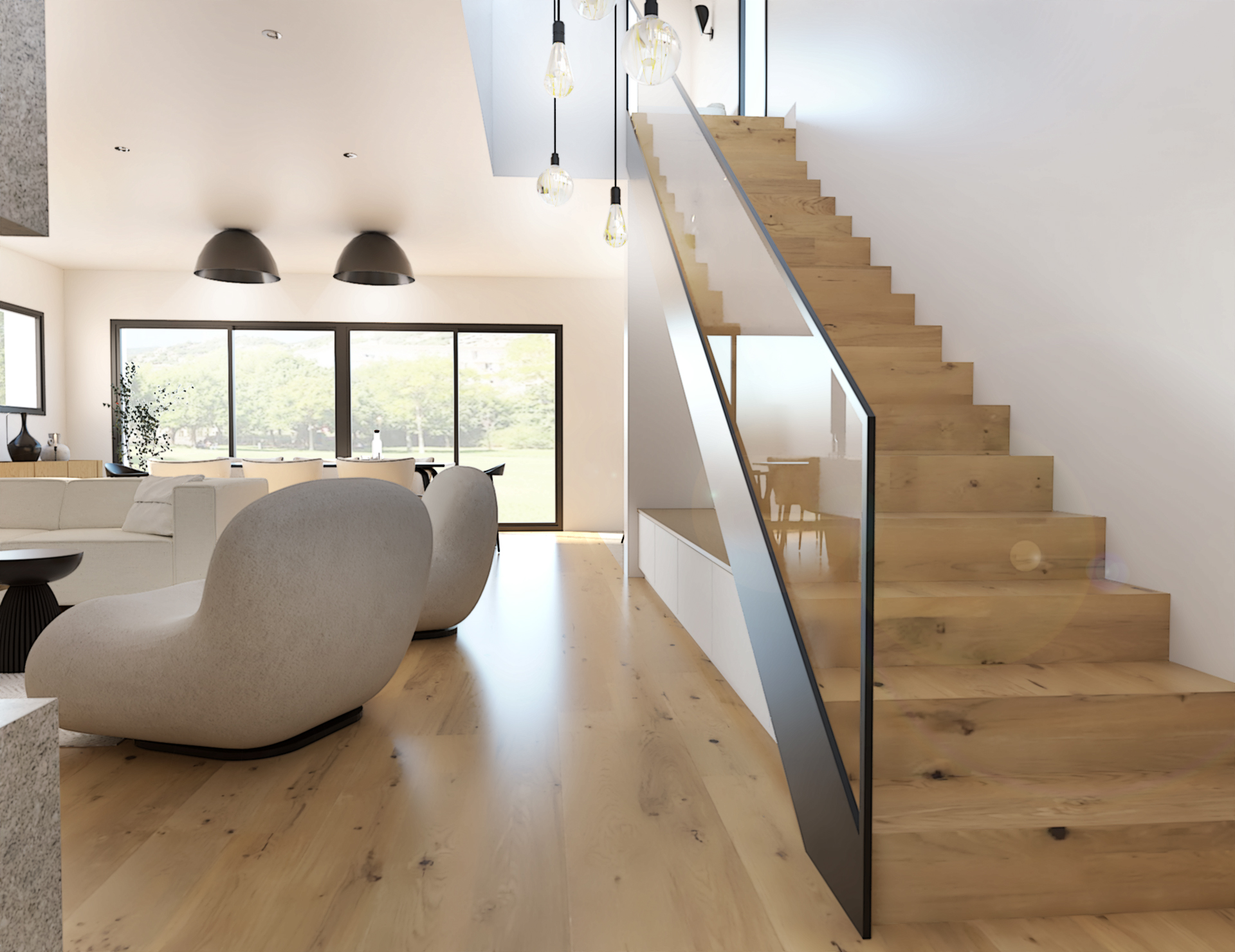 Suite à la construction de cette maison contemporaine, les clients m’ont contactés pour penser l’aménagement intérieur et créer la décoration de chaque espace. La majorité des pièces sont tournées vers l’extérieur pour profiter de la lumière naturelle. Le salon et la salle à manger restent ouverts sur la cuisine pour offrir un bel espace de convivialité à la famille. Des meubles sur mesure ont été pensés pour offrir des rangements. Ils délimitent les fonctions et offrent une unité esthétique à l’ensemble. Les agencements et la décoration créent un fil conducteur dans toute la maison.