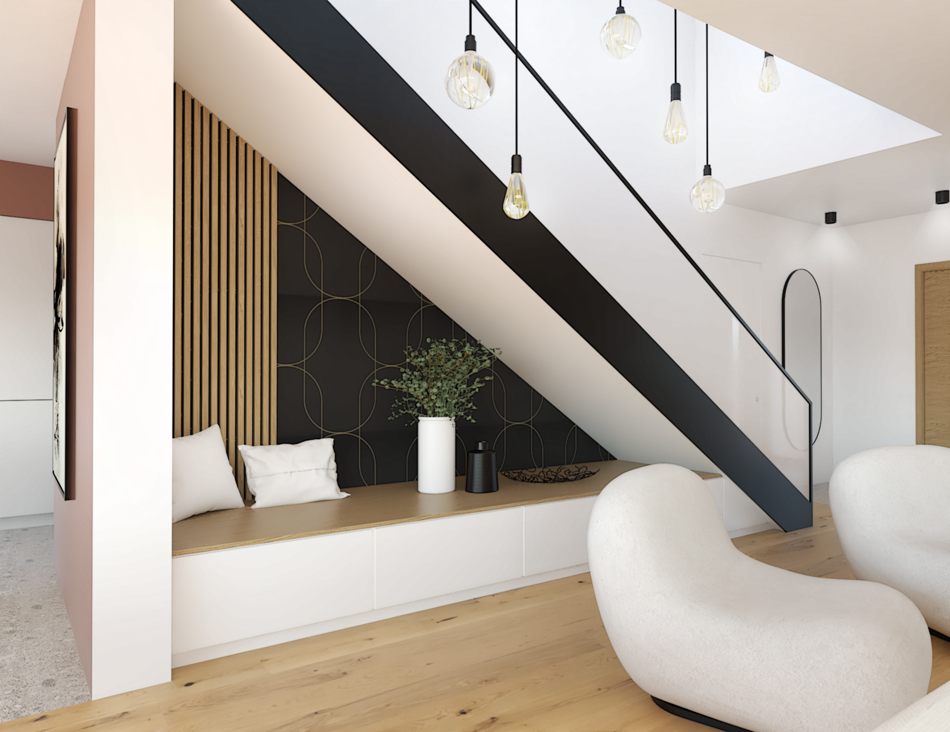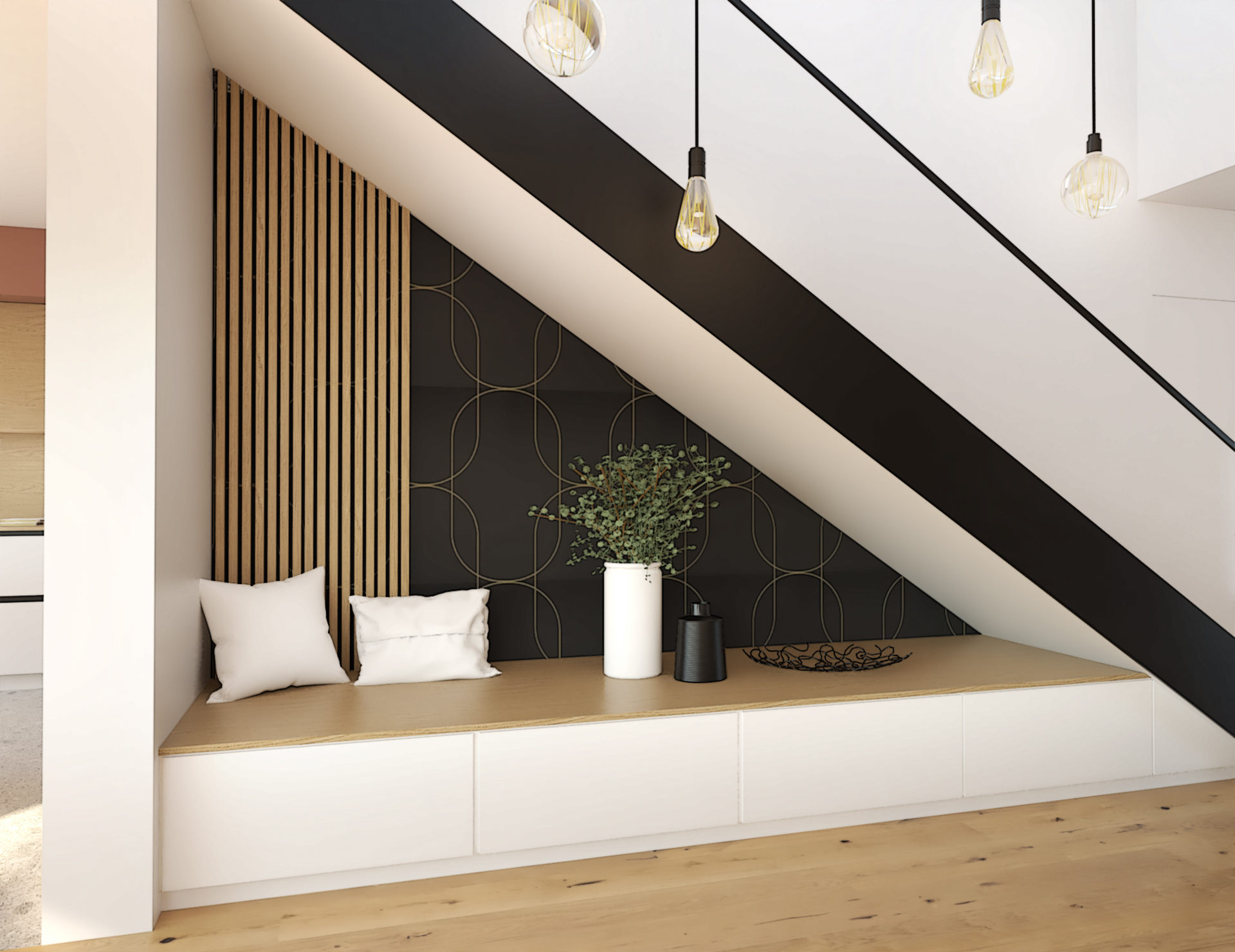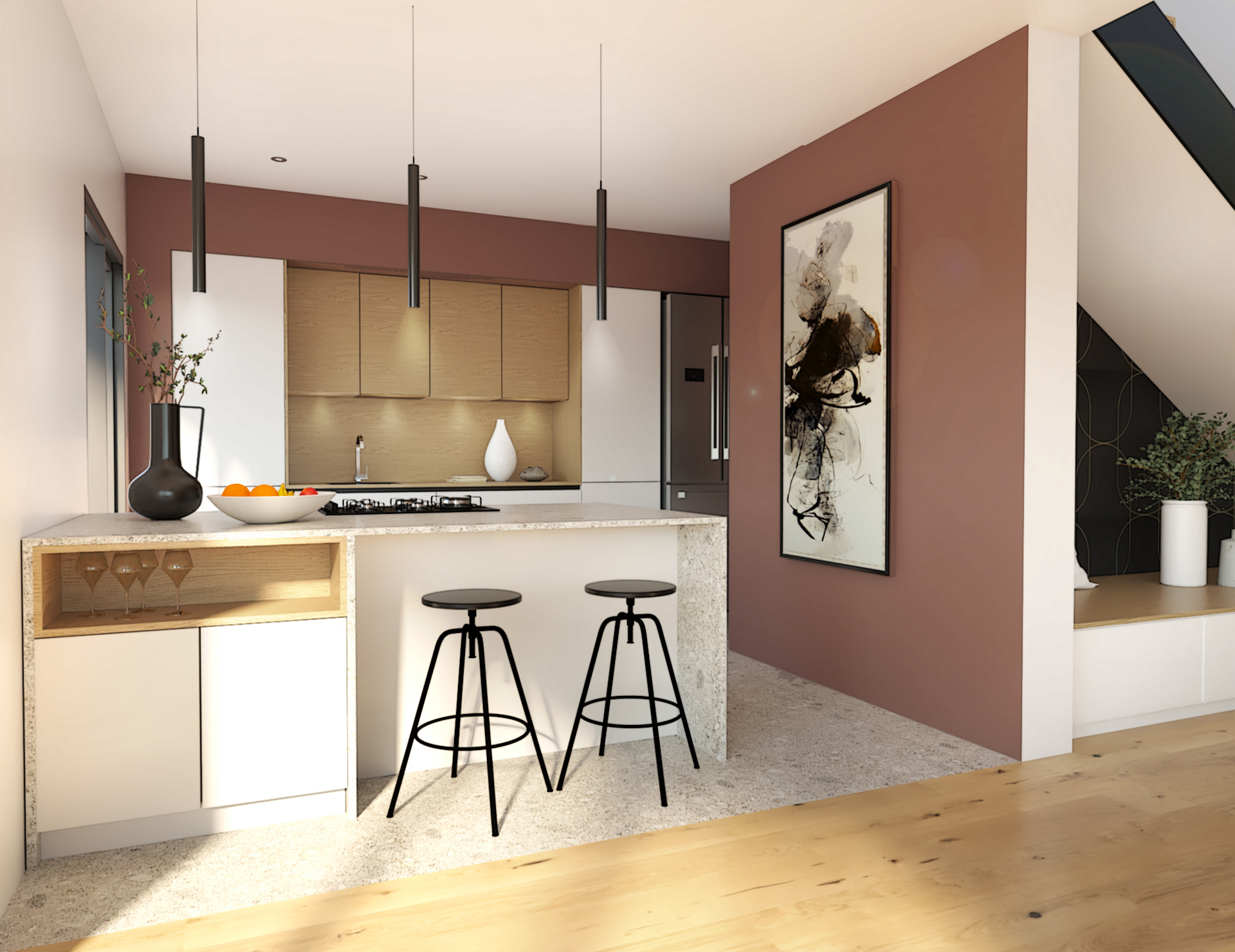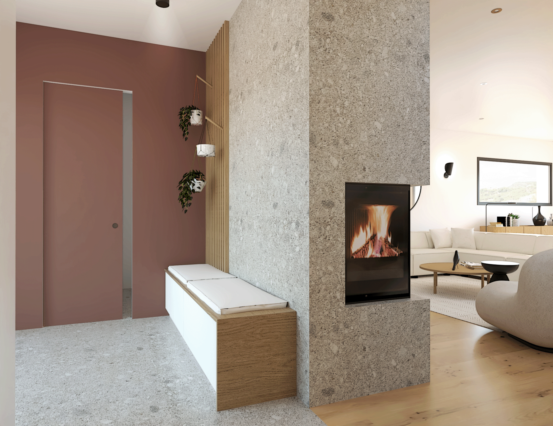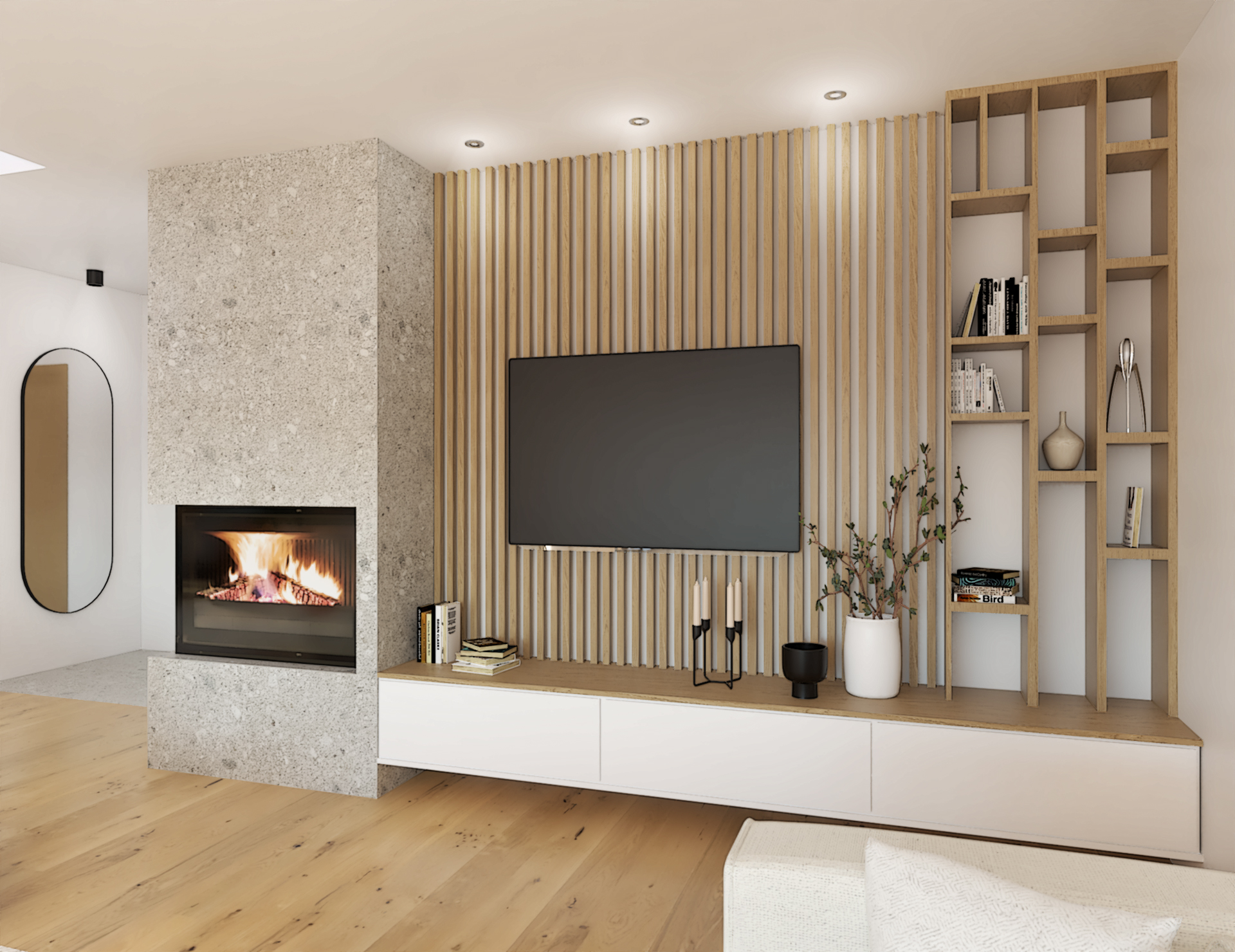Suite à la construction de cette maison contemporaine, les clients m’ont contactés pour penser l’aménagement intérieur et créer la décoration de chaque espace. La majorité des pièces sont tournées vers l’extérieur pour profiter de la lumière naturelle. Le salon et la salle à manger restent ouverts sur la cuisine pour offrir un bel espace de convivialité à la famille. Des meubles sur mesure ont été pensés pour offrir des rangements. Ils délimitent les fonctions et offrent une unité esthétique à l’ensemble. Les agencements et la décoration créent un fil conducteur dans toute la maison.