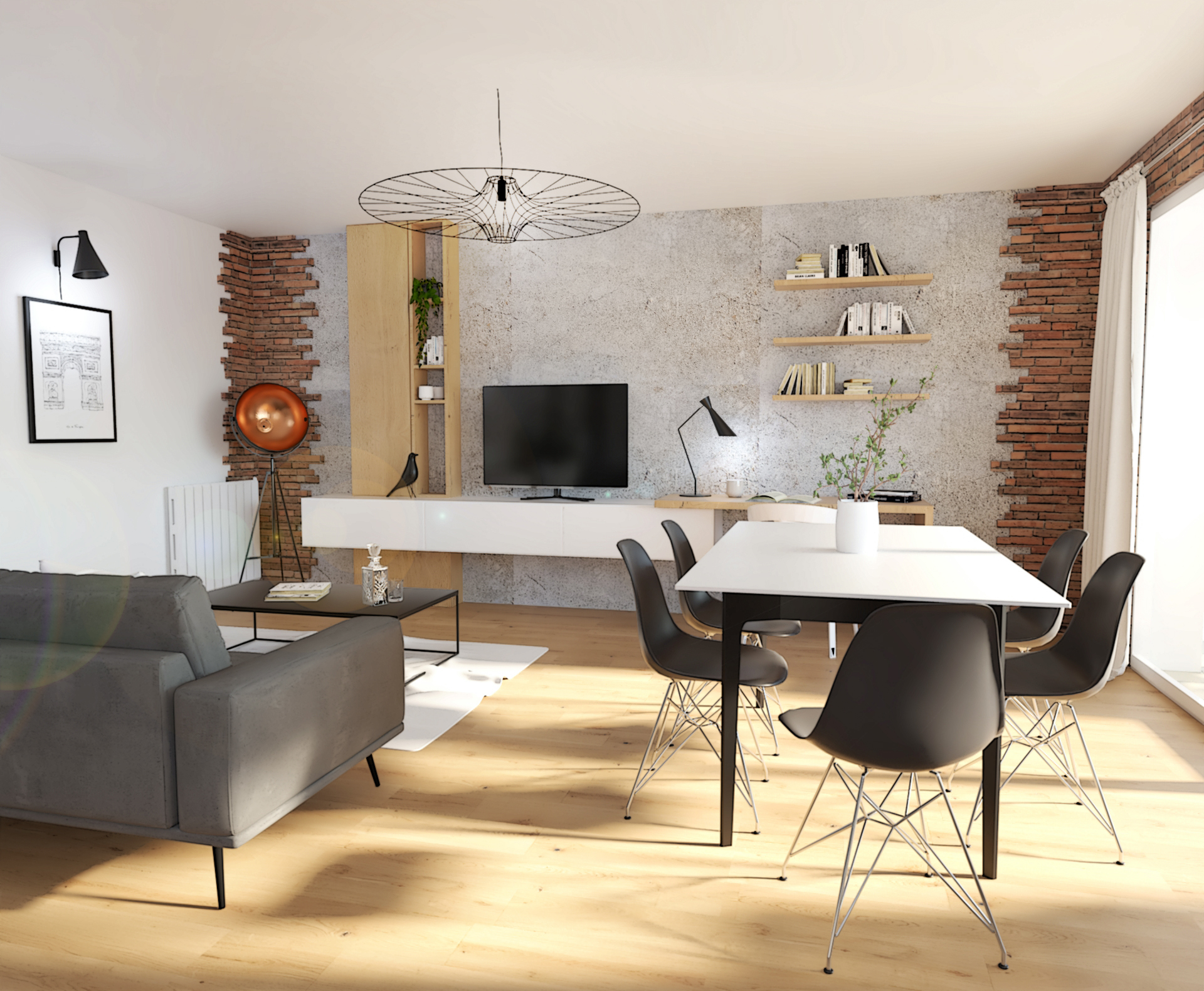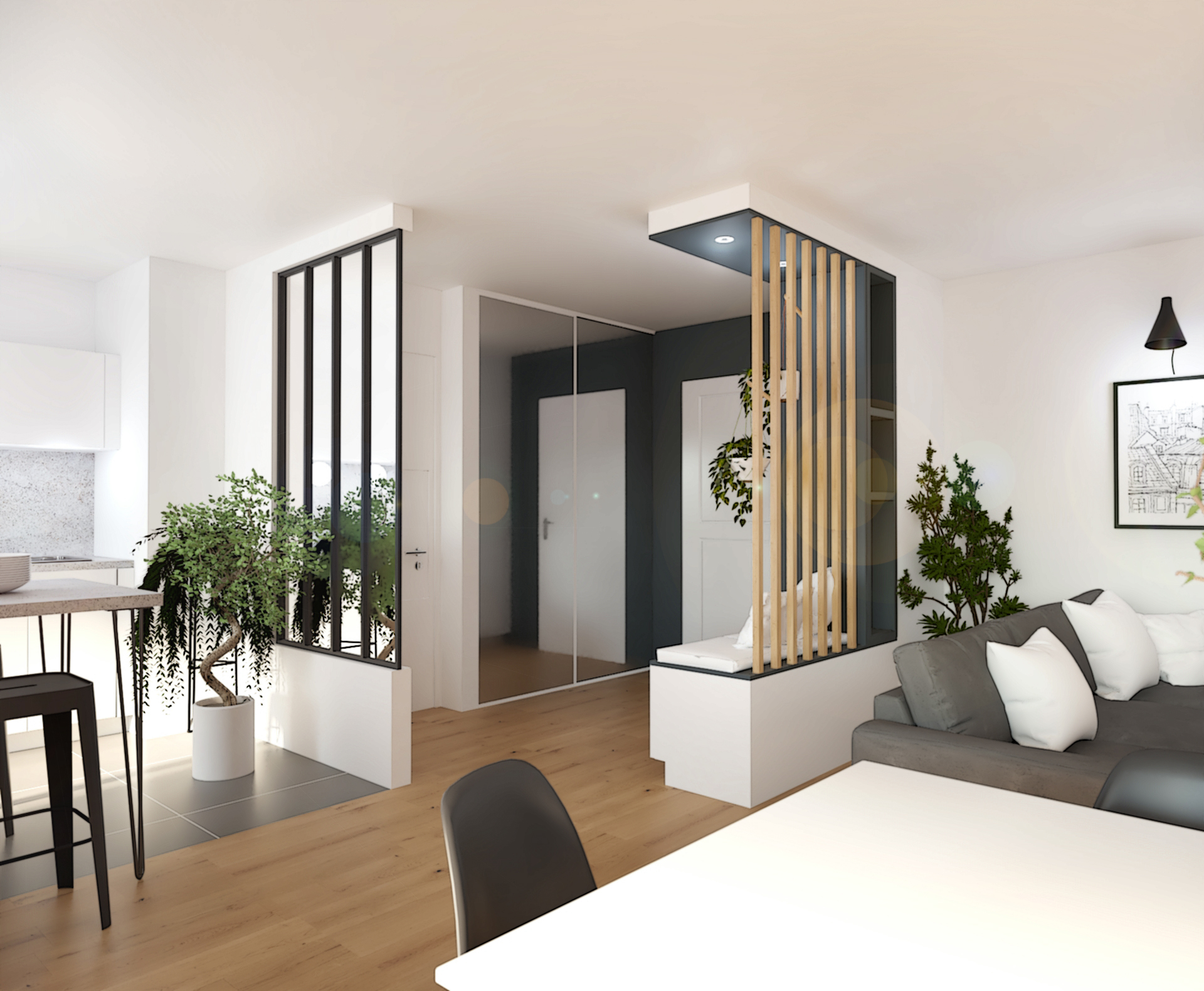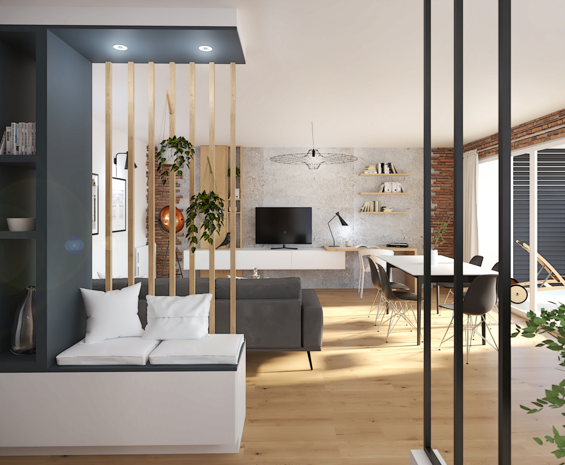 Suite à la construction de cette maison contemporaine, les clients m’ont contactés pour penser l’aménagement intérieur et créer la décoration de chaque espace. La majorité des pièces sont tournées vers l’extérieur pour profiter de la lumière naturelle. Le salon et la salle à manger restent ouverts sur la cuisine pour offrir un bel espace de convivialité à la famille. Des meubles sur mesure ont été pensés pour offrir des rangements. Ils délimitent les fonctions et offrent une unité esthétique à l’ensemble. Les agencements et la décoration créent un fil conducteur dans toute la maison.