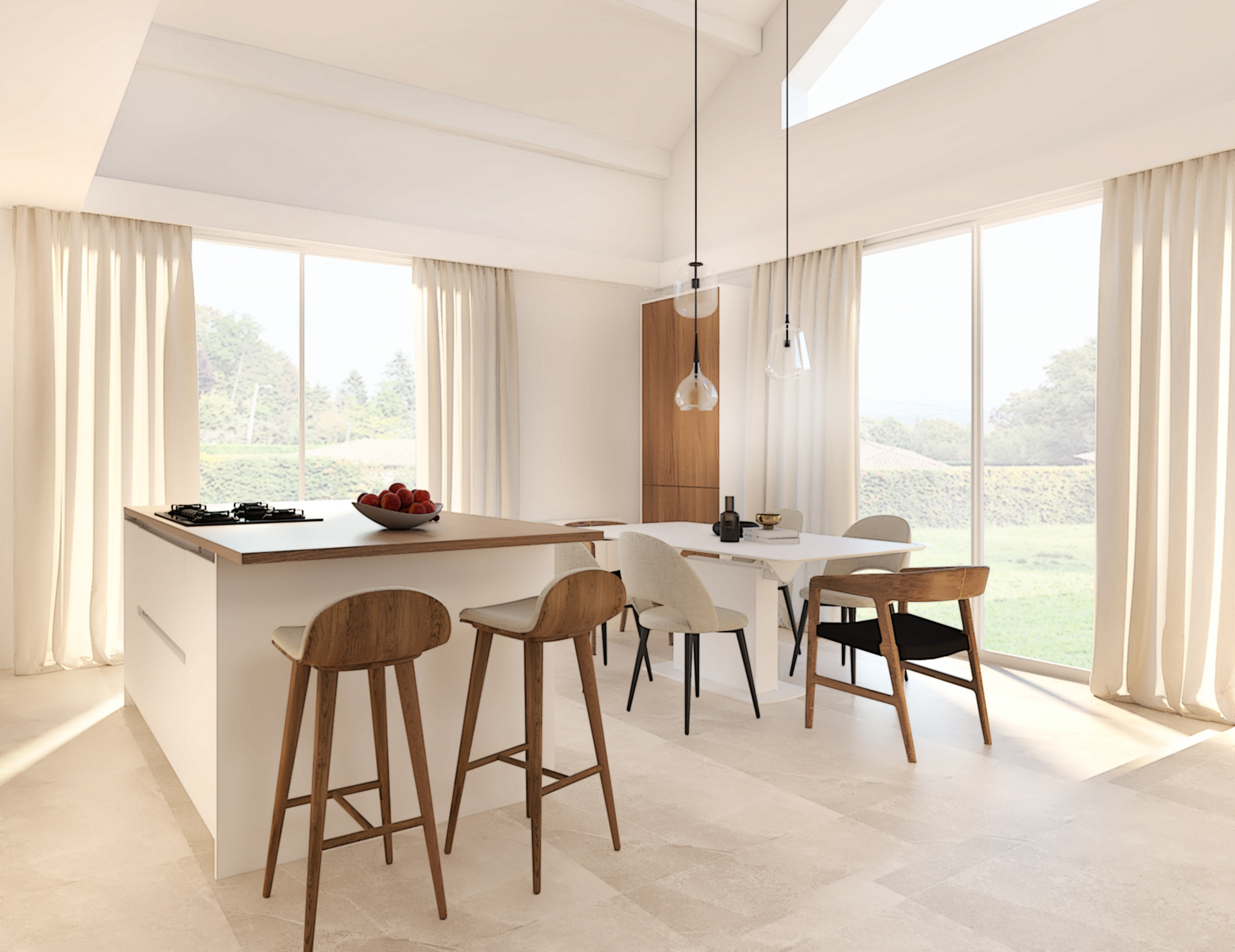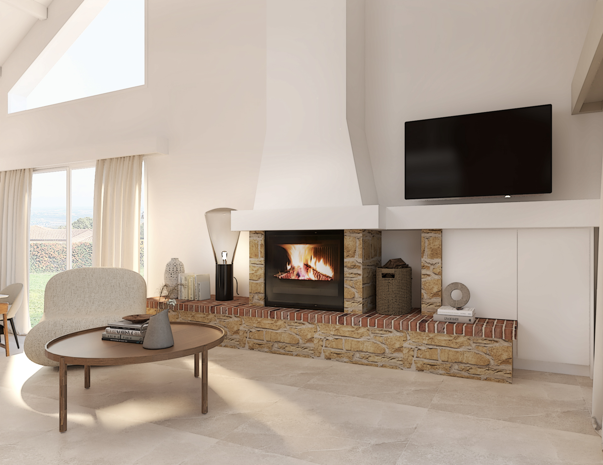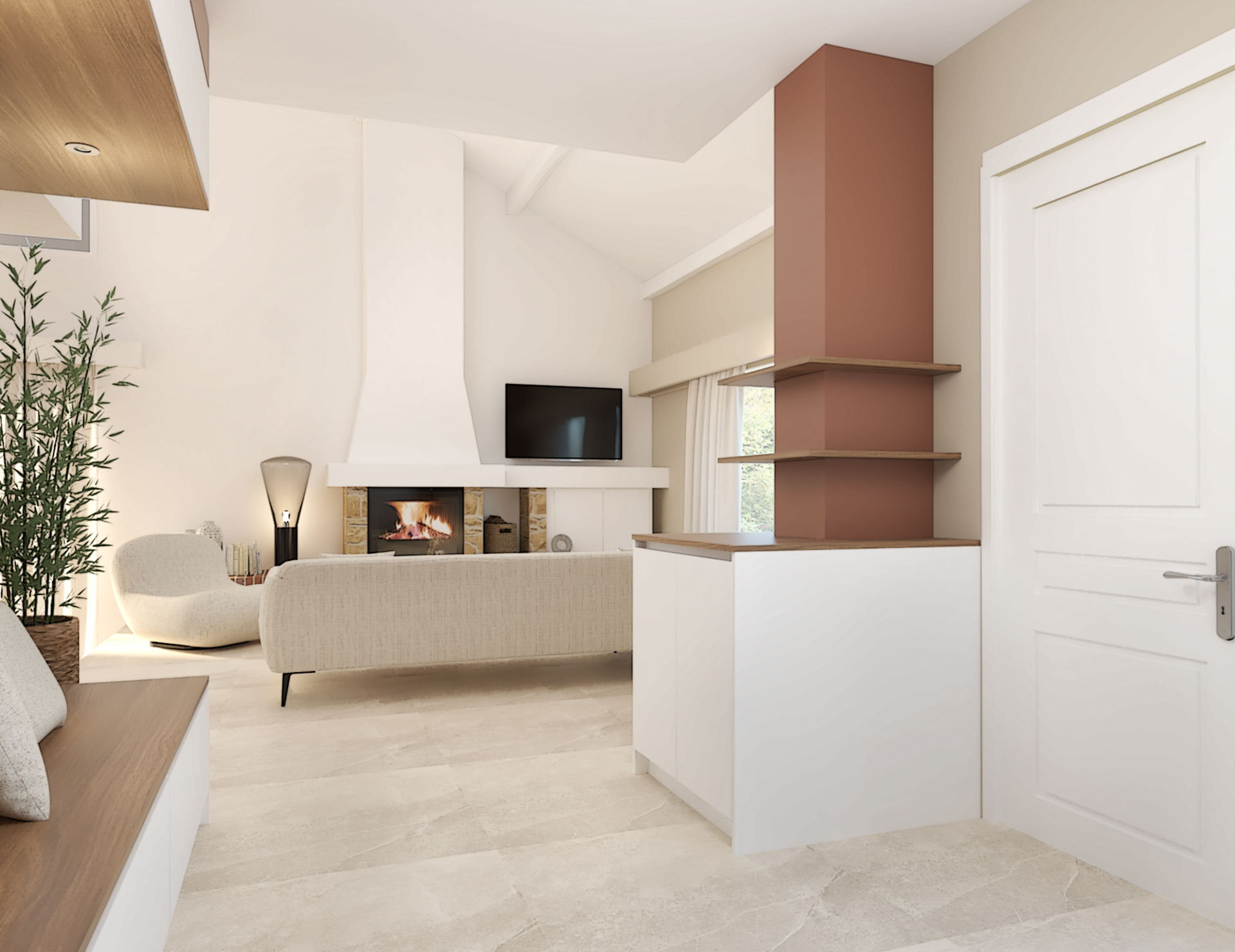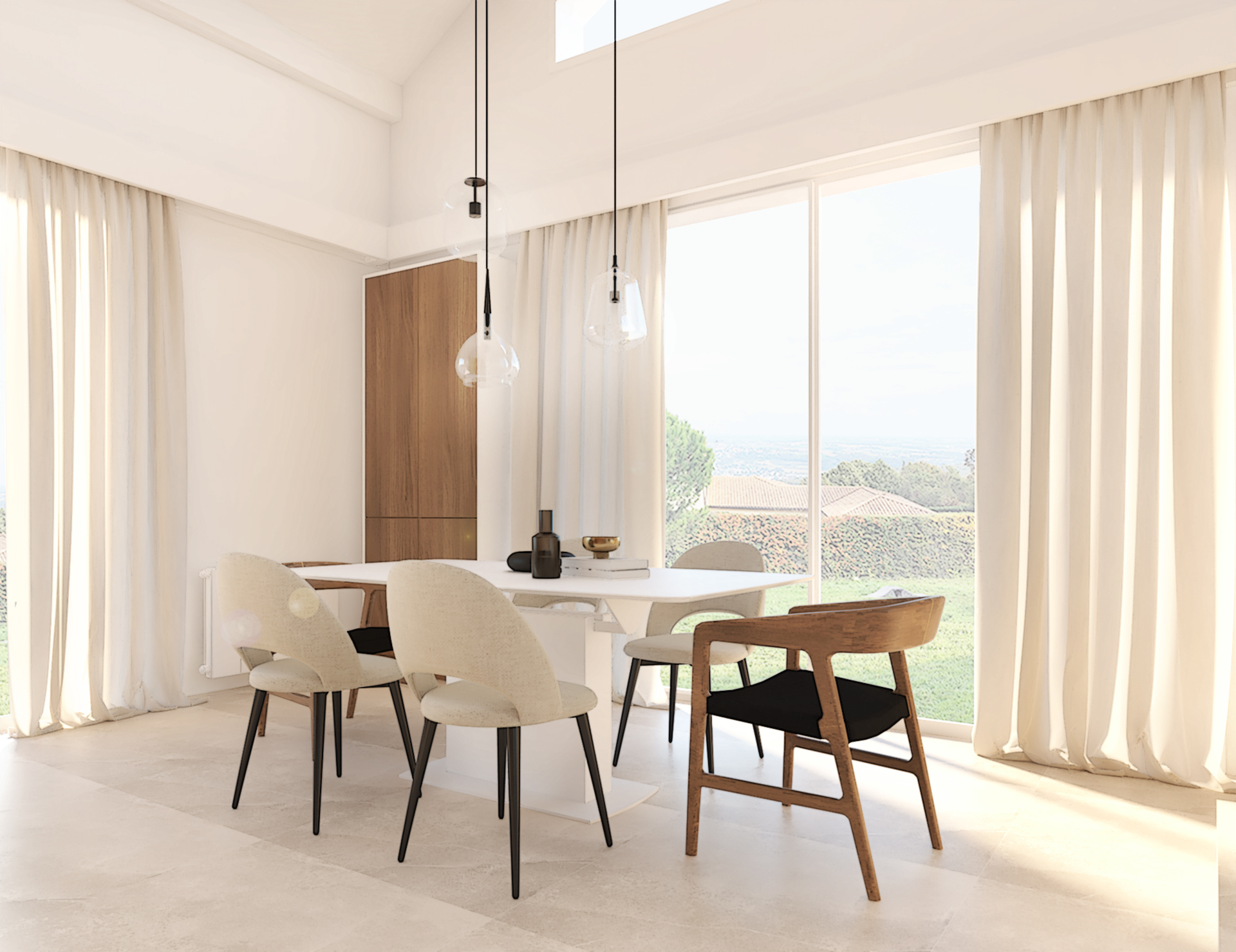 Cette splendide maison est idéalement située dans la région des Monts d’Or au coeur de la nature. La propriété propose un spacieux et lumineux séjour. La vue imprenable sur les montagnes nous offre en un réel tableau. Il fallait trouver une décoration en lien avec la nature, sans artifice. Nous avons donc opté pour une ambiance chaleureuse dans des teintes « terre-cuite ». Cette ambiance est éclaircie par des tissus beiges et blancs, cela permet de ne pas ajouter davantages d’informations visuelles. Coté panorama, des murs blanc permettent de faire ressortir ce beau paysage. Des rappels de bois un peu partout réchauffent le séjour avec authenticité.