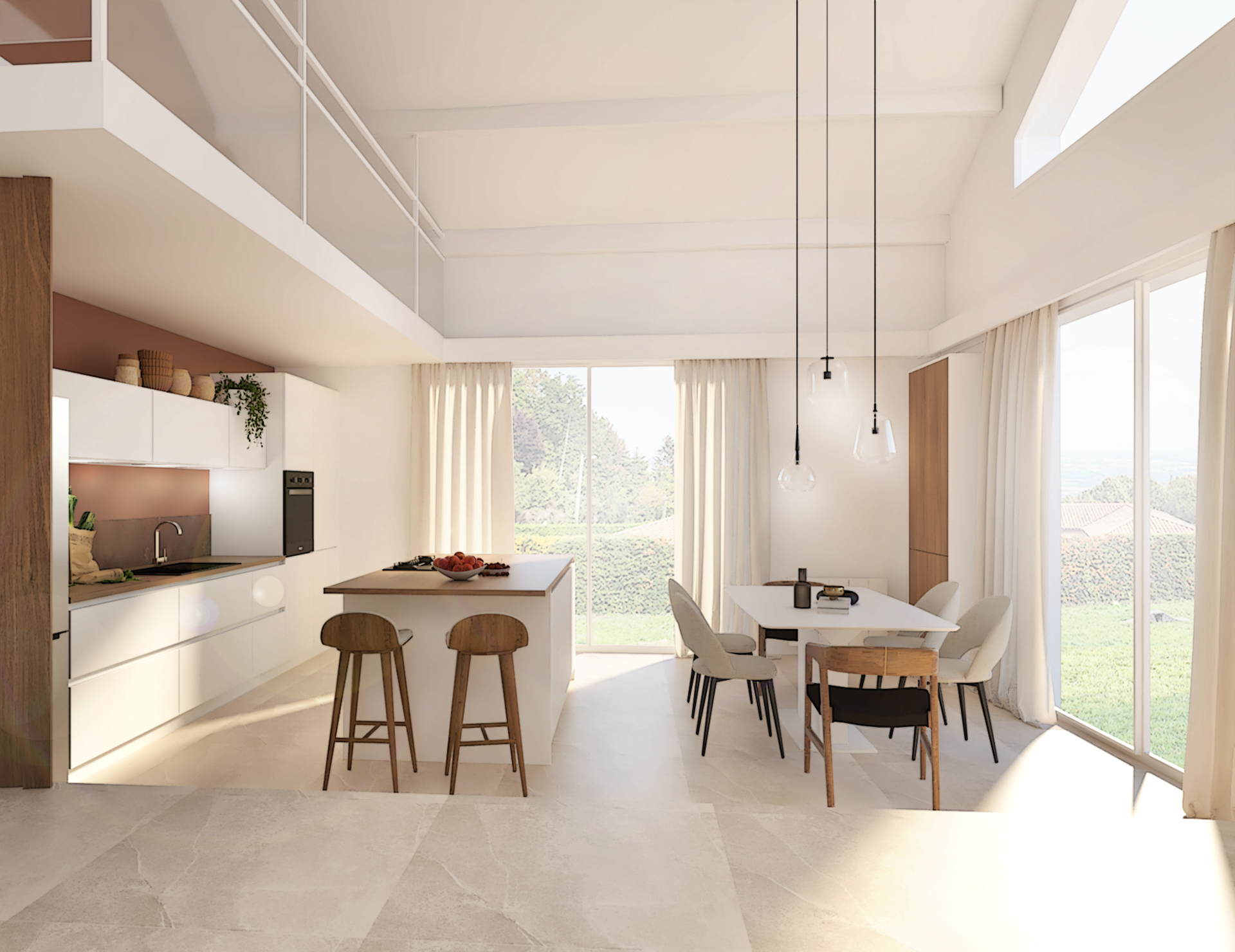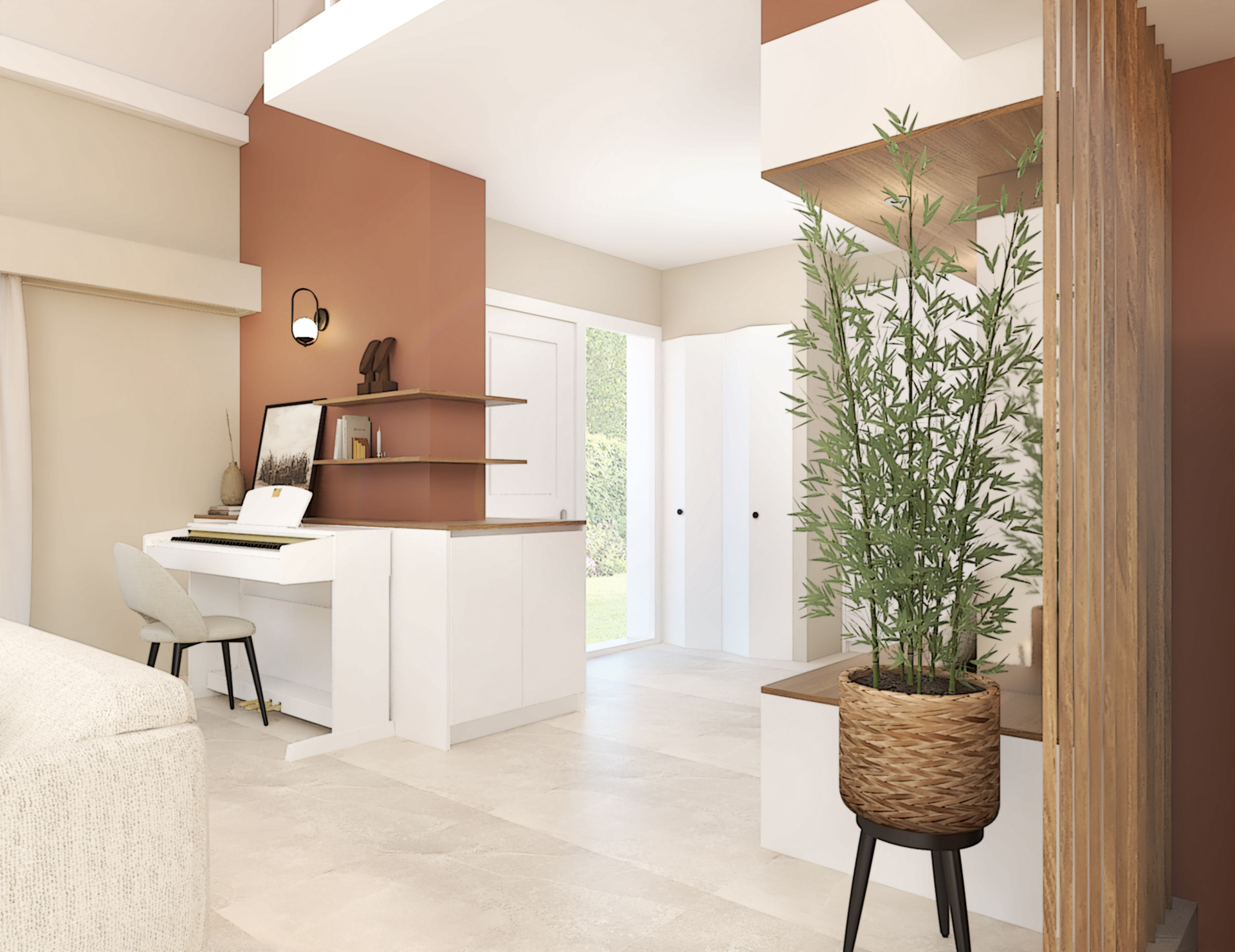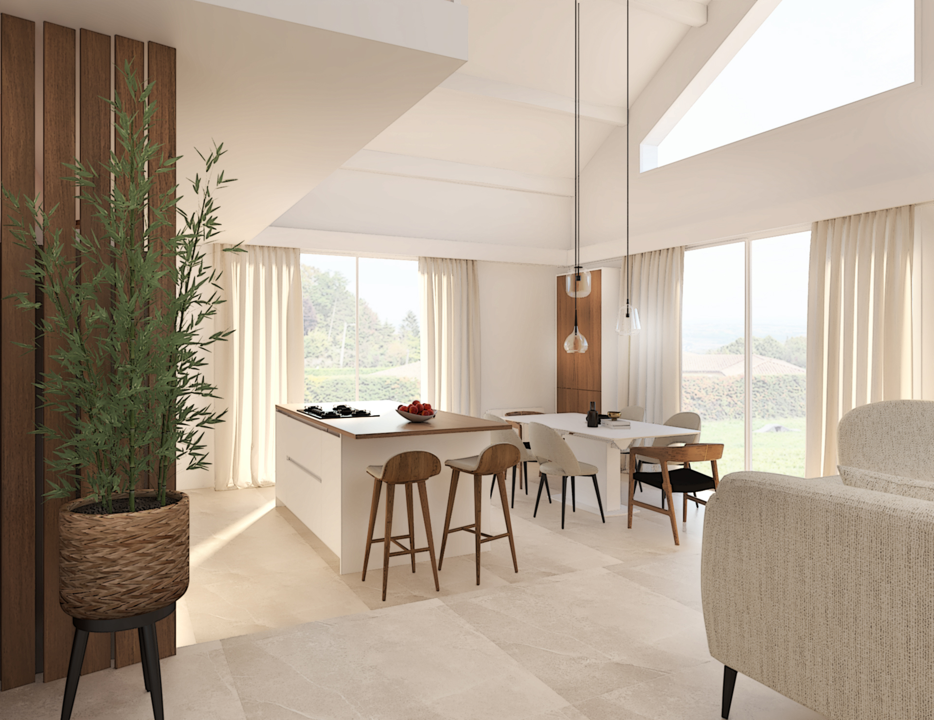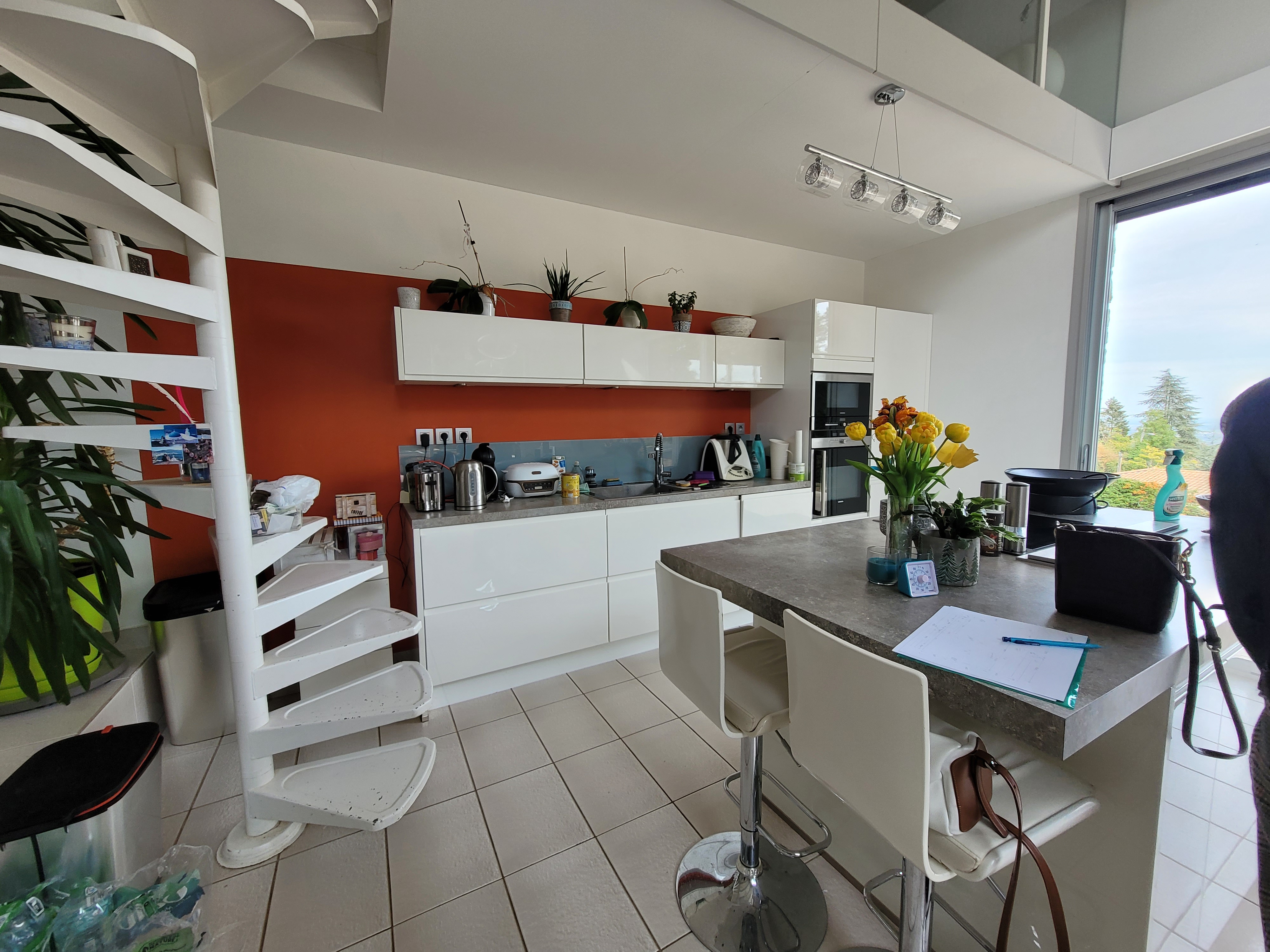 Cette splendide maison est idéalement située dans la région des Monts d’Or au coeur de la nature. La propriété propose un spacieux et lumineux séjour. La vue imprenable sur les montagnes nous offre en un réel tableau. Il fallait trouver une décoration en lien avec la nature, sans artifice. Nous avons donc opté pour une ambiance chaleureuse dans des teintes « terre-cuite ». Cette ambiance est éclaircie par des tissus beiges et blancs, cela permet de ne pas ajouter davantages d’informations visuelles. Coté panorama, des murs blanc permettent de faire ressortir ce beau paysage. Des rappels de bois un peu partout réchauffent le séjour avec authenticité.