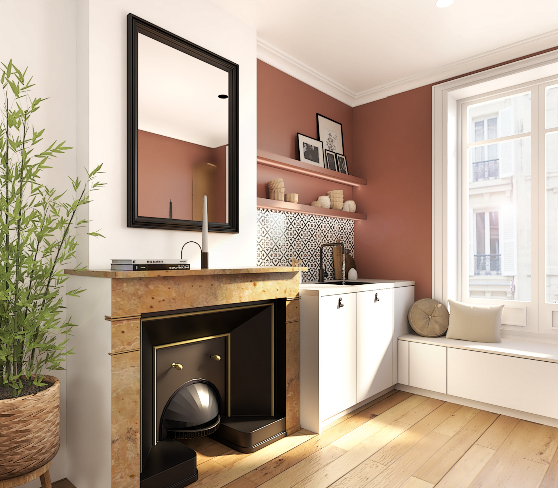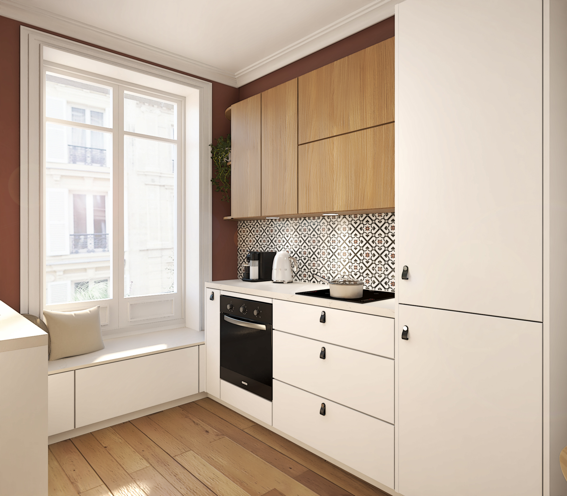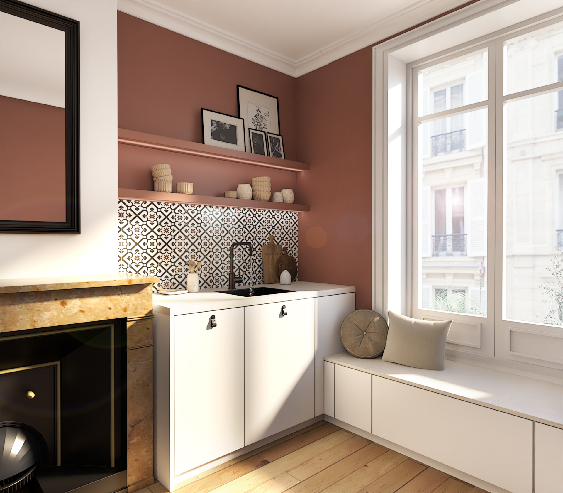 Le carrelage mural à motif géométrique ajoute une touche d’originalité et rappelle les cuisines d’antan. La cheminée, même si elle n’est pas fonctionnelle, apporte une touche d’authenticité et de charme à la pièce. La banquette sous la fenêtre offre un espace supplémentaire pour s’asseoir et crée un coin cosy. Les meubles blancs apportent de la luminosité et agrandissent visuellement l’espace.