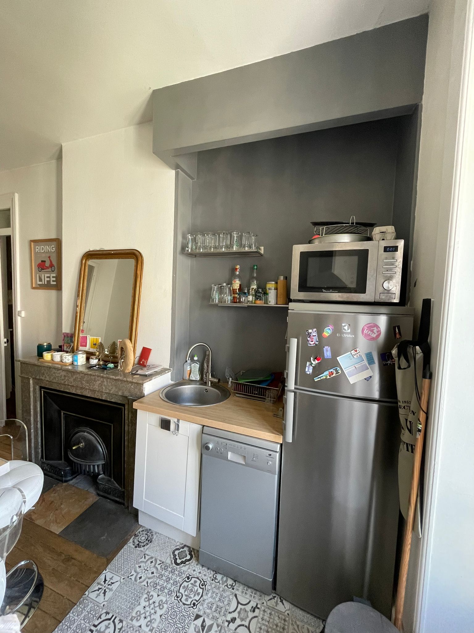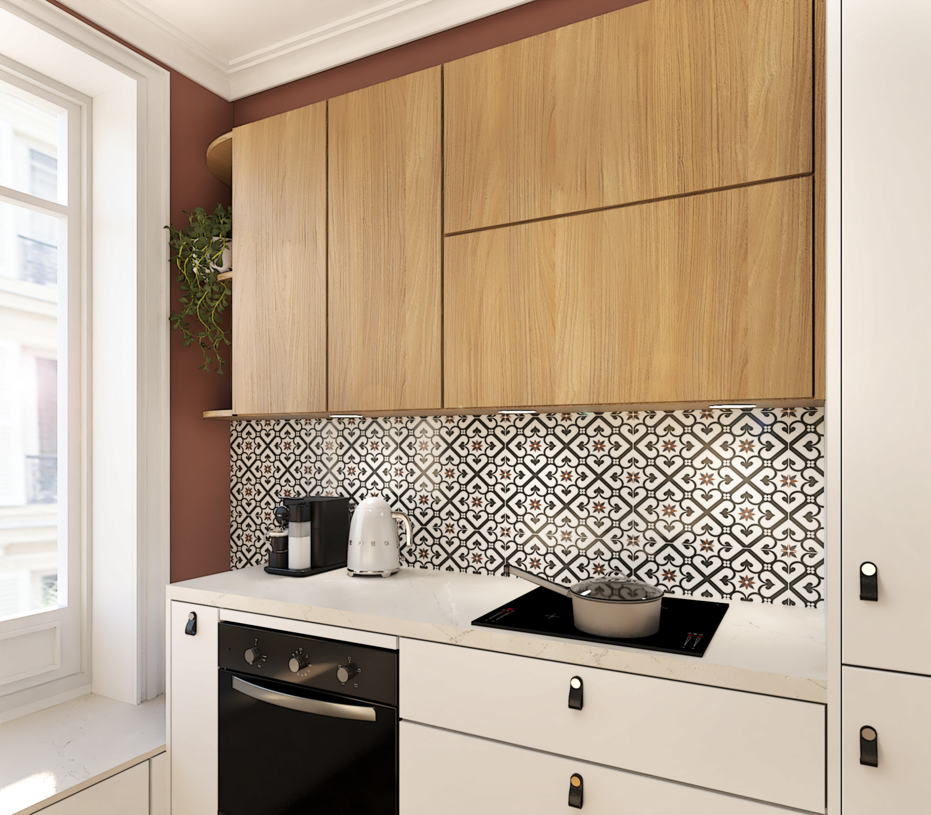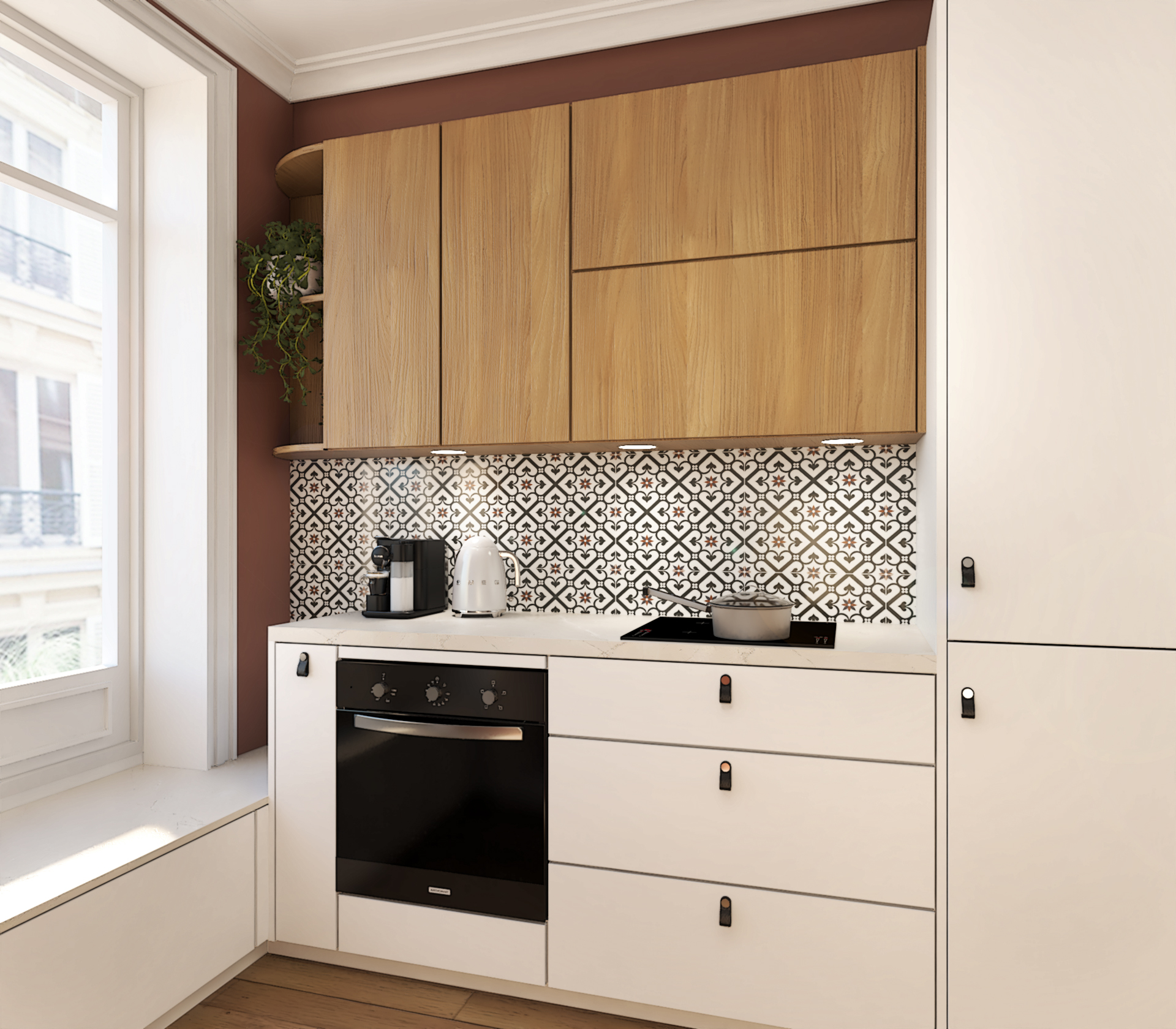 Le carrelage mural à motif géométrique ajoute une touche d’originalité et rappelle les cuisines d’antan. La cheminée, même si elle n’est pas fonctionnelle, apporte une touche d’authenticité et de charme à la pièce. La banquette sous la fenêtre offre un espace supplémentaire pour s’asseoir et crée un coin cosy. Les meubles blancs apportent de la luminosité et agrandissent visuellement l’espace.
