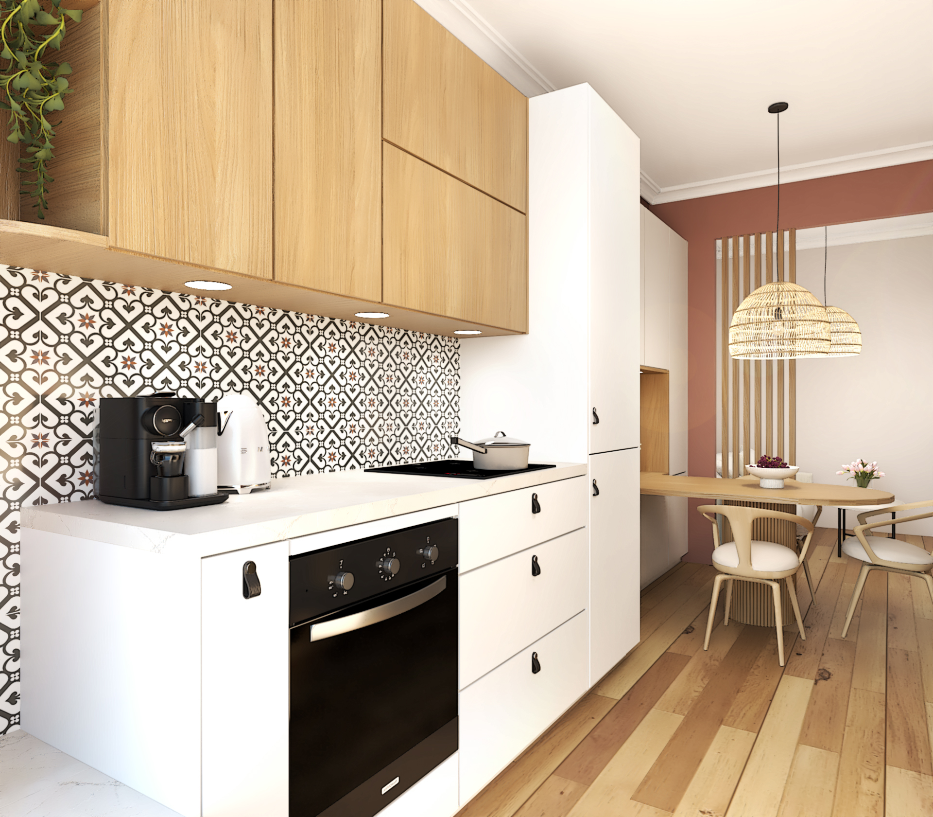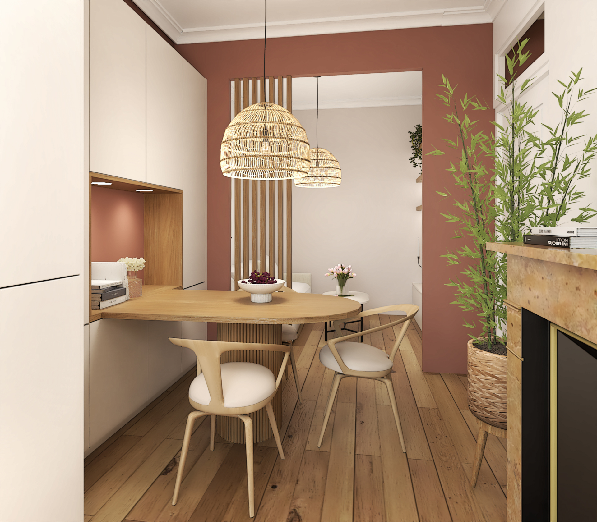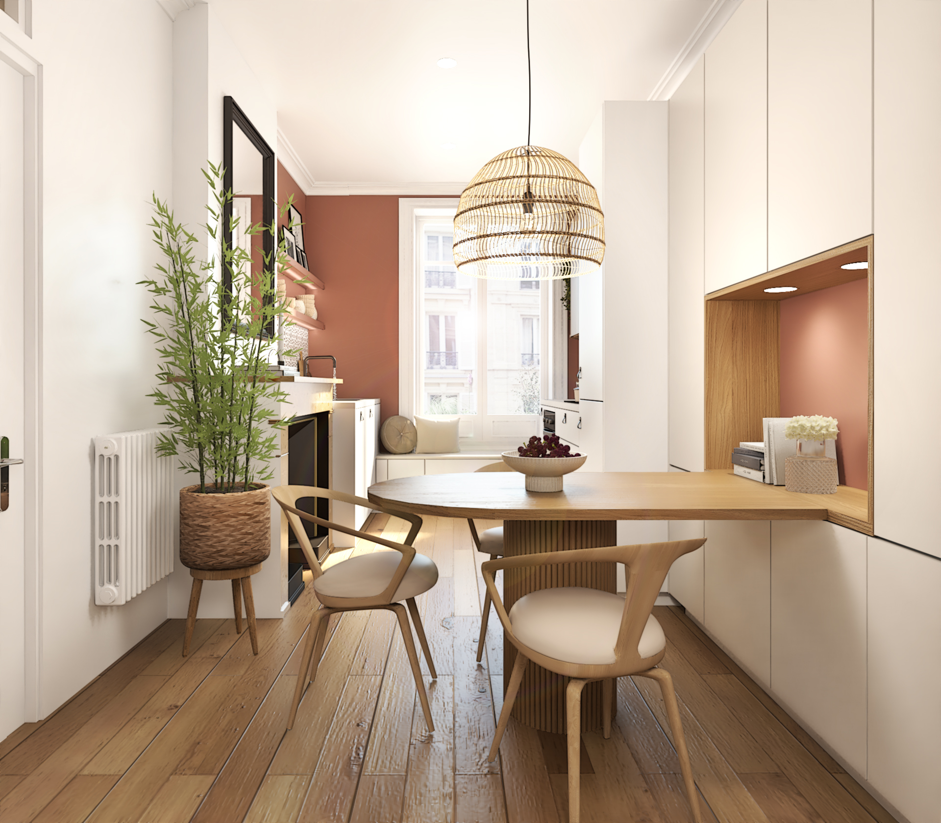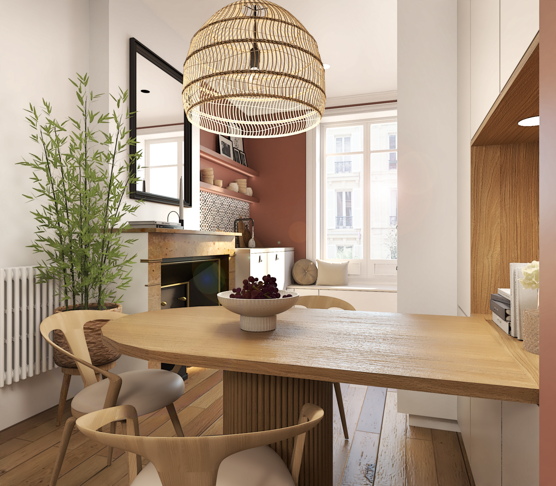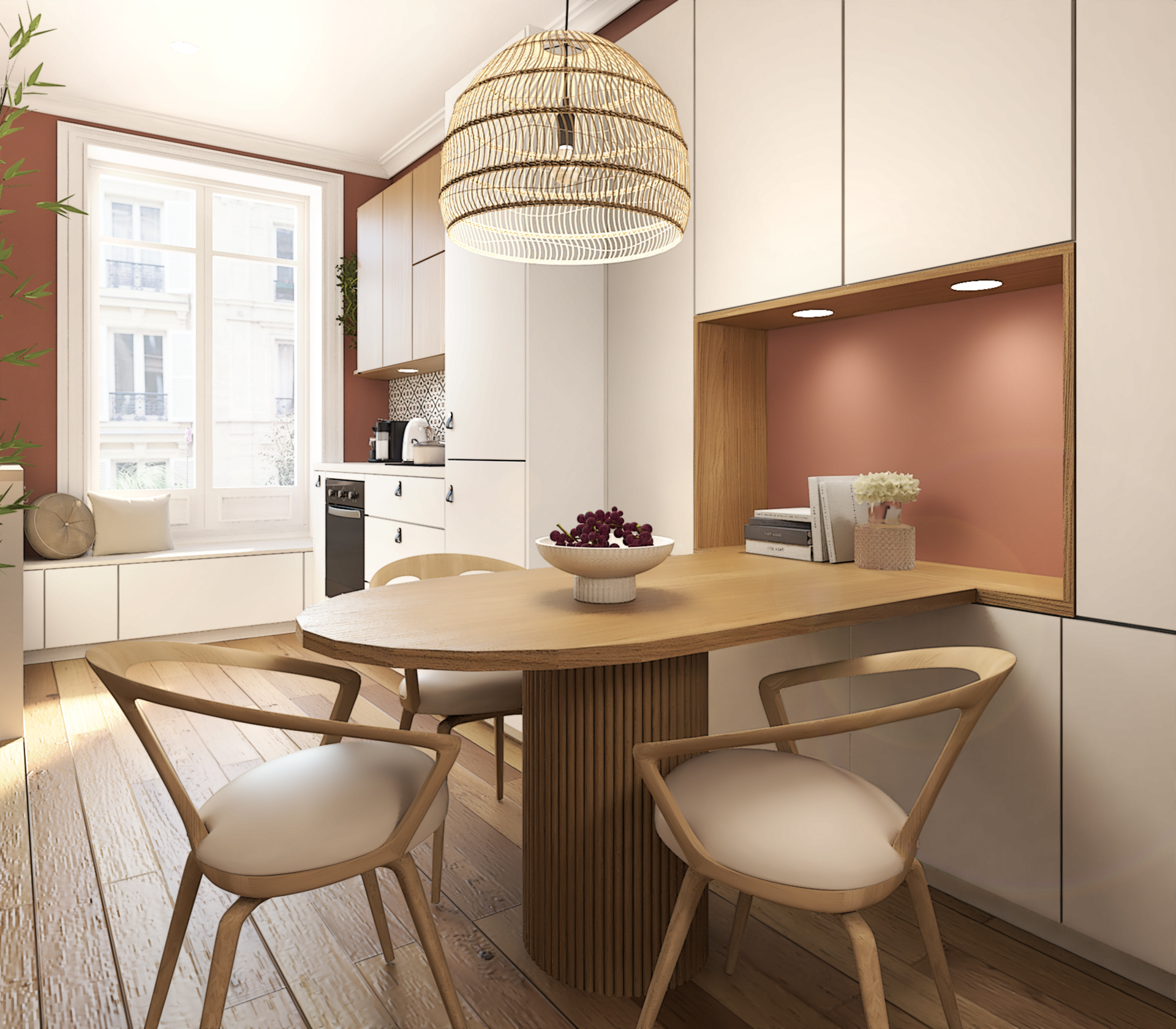 Projet de décoration complète d’un appartement ancien situé au coeur de Lyon. Ce projet allie esthétisme, fonctionnalité et confort pour créer un espace de vie agréable et personnalisé. Le mélange de styles, l’utilisation de matériaux naturels et l’attention portée aux détails font de cette cuisine un lieu de vie chaleureux et accueillant.