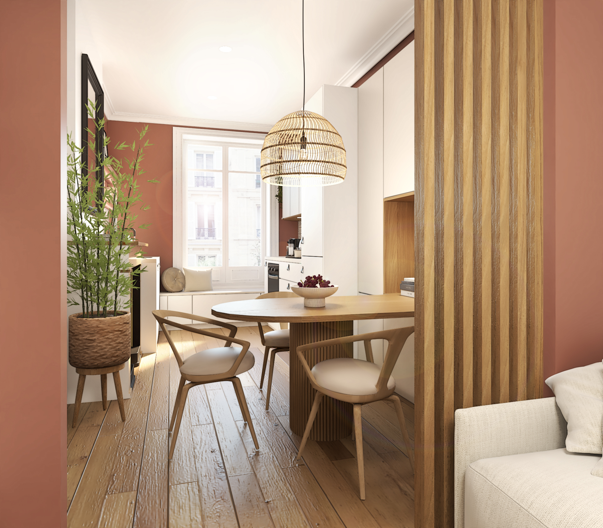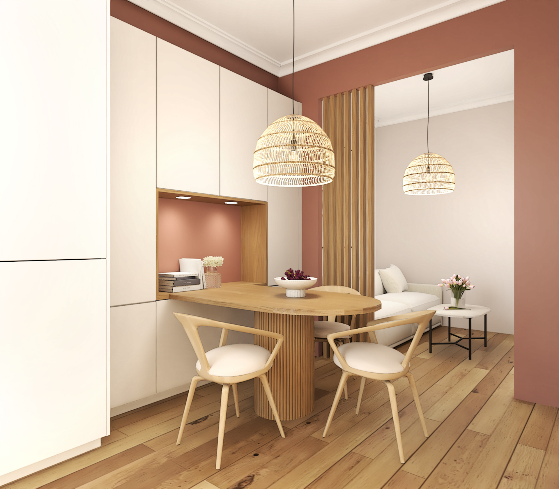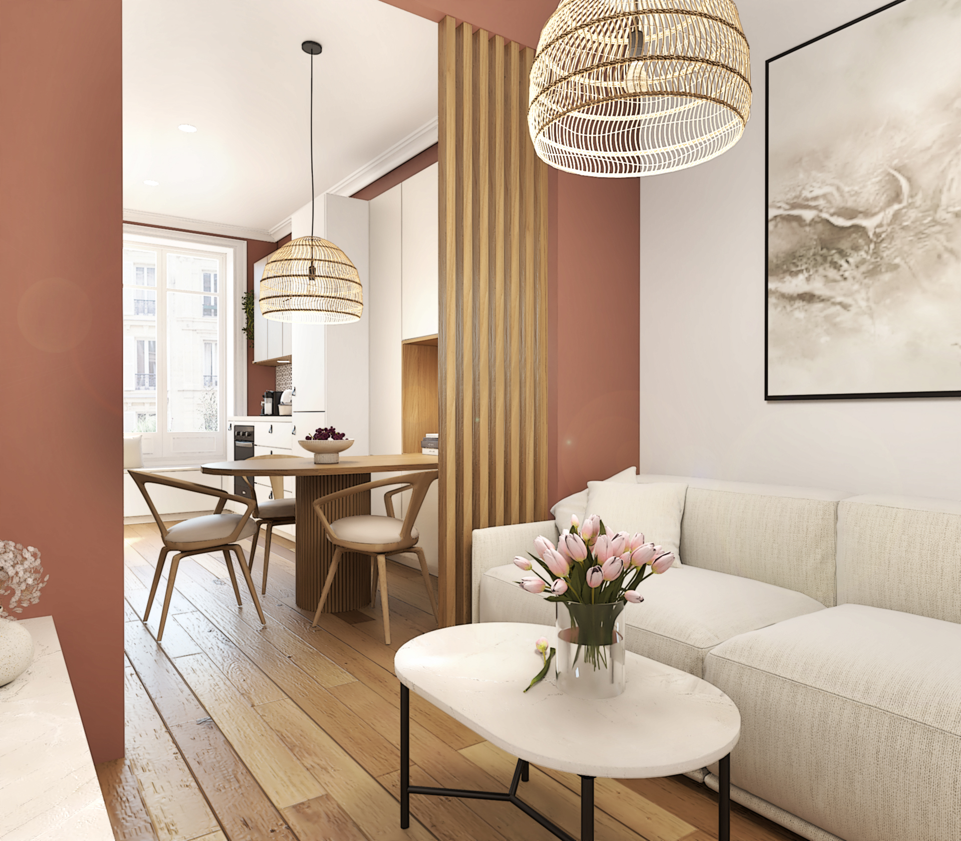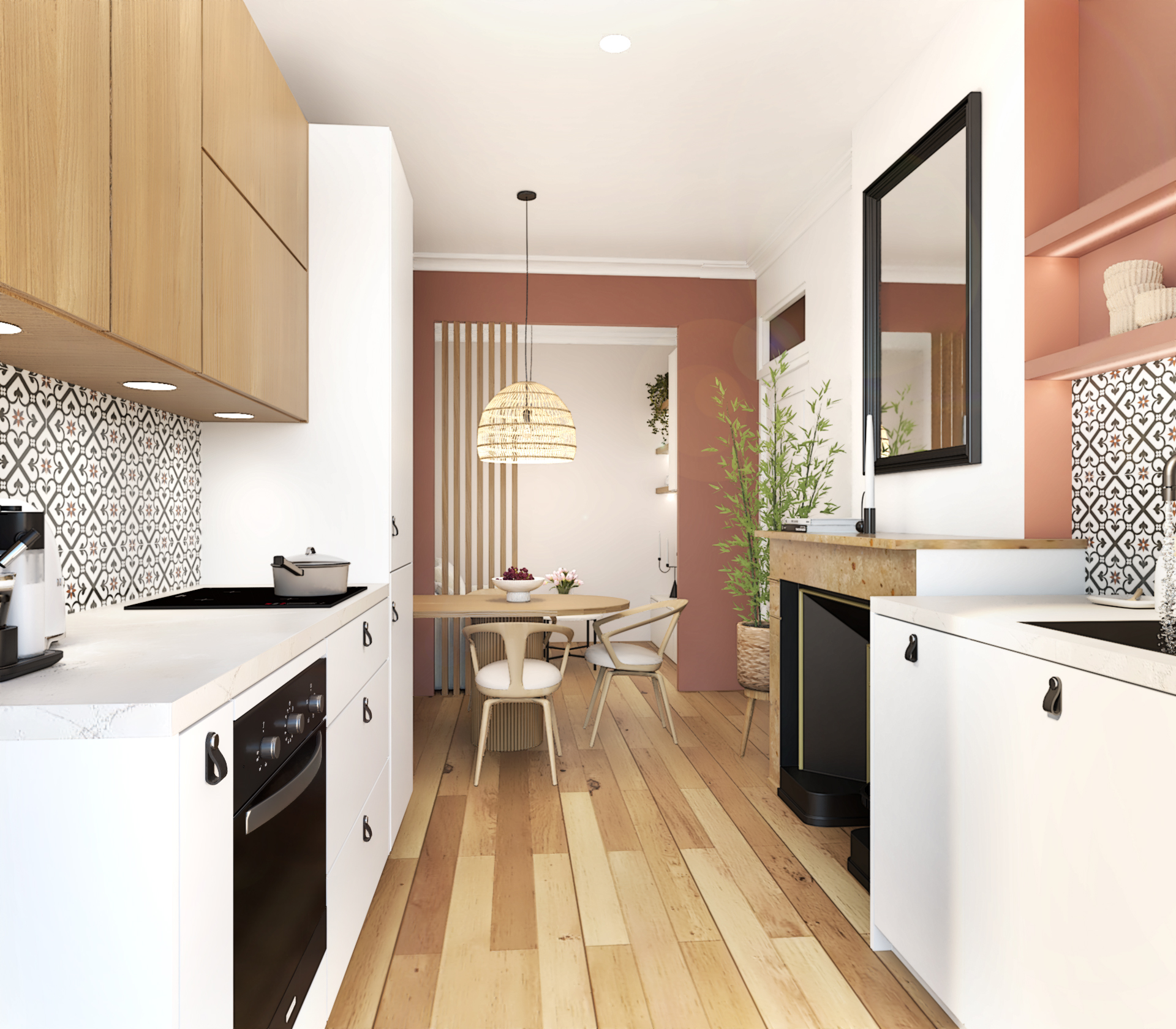 Projet de décoration complète d’un appartement ancien situé au coeur de Lyon. Ce projet allie esthétisme, fonctionnalité et confort pour créer un espace de vie agréable et personnalisé. Le mélange de styles, l’utilisation de matériaux naturels et l’attention portée aux détails font de cette cuisine un lieu de vie chaleureux et accueillant.