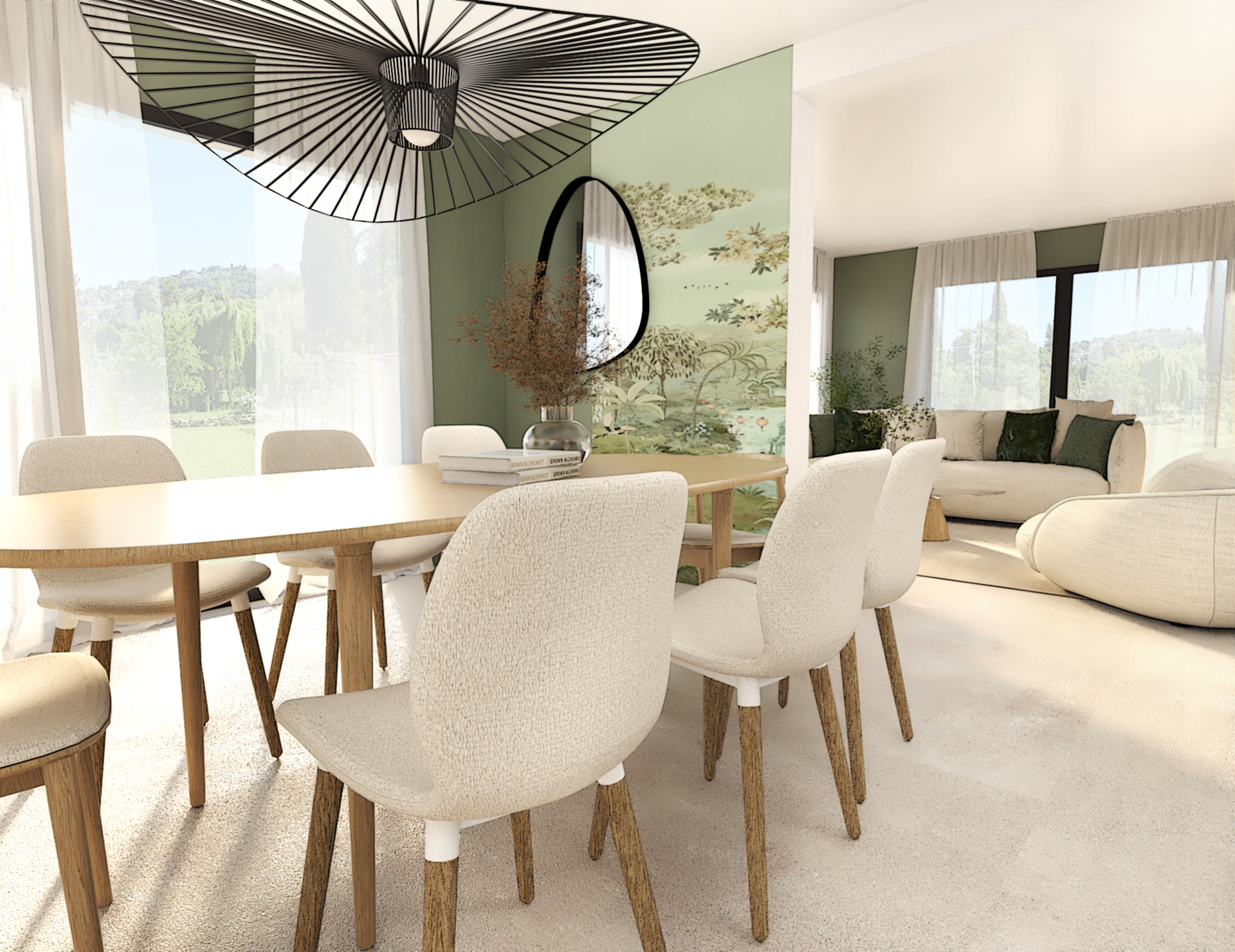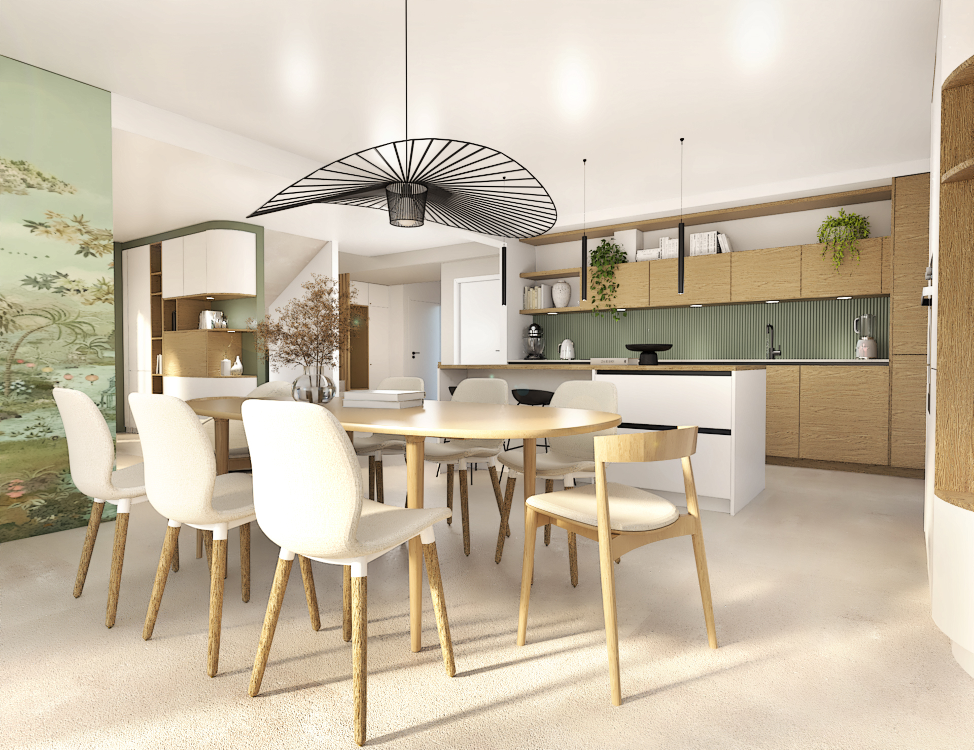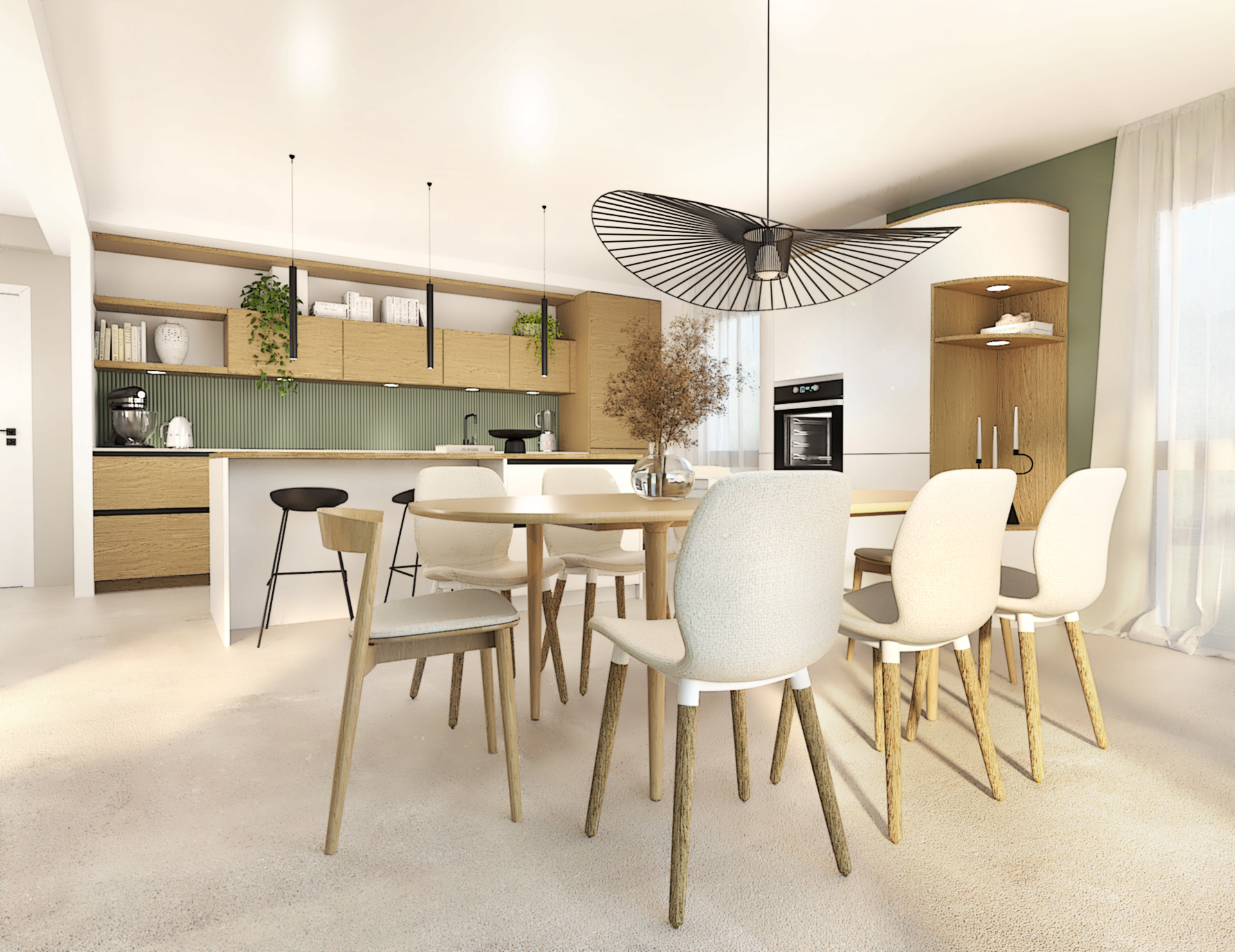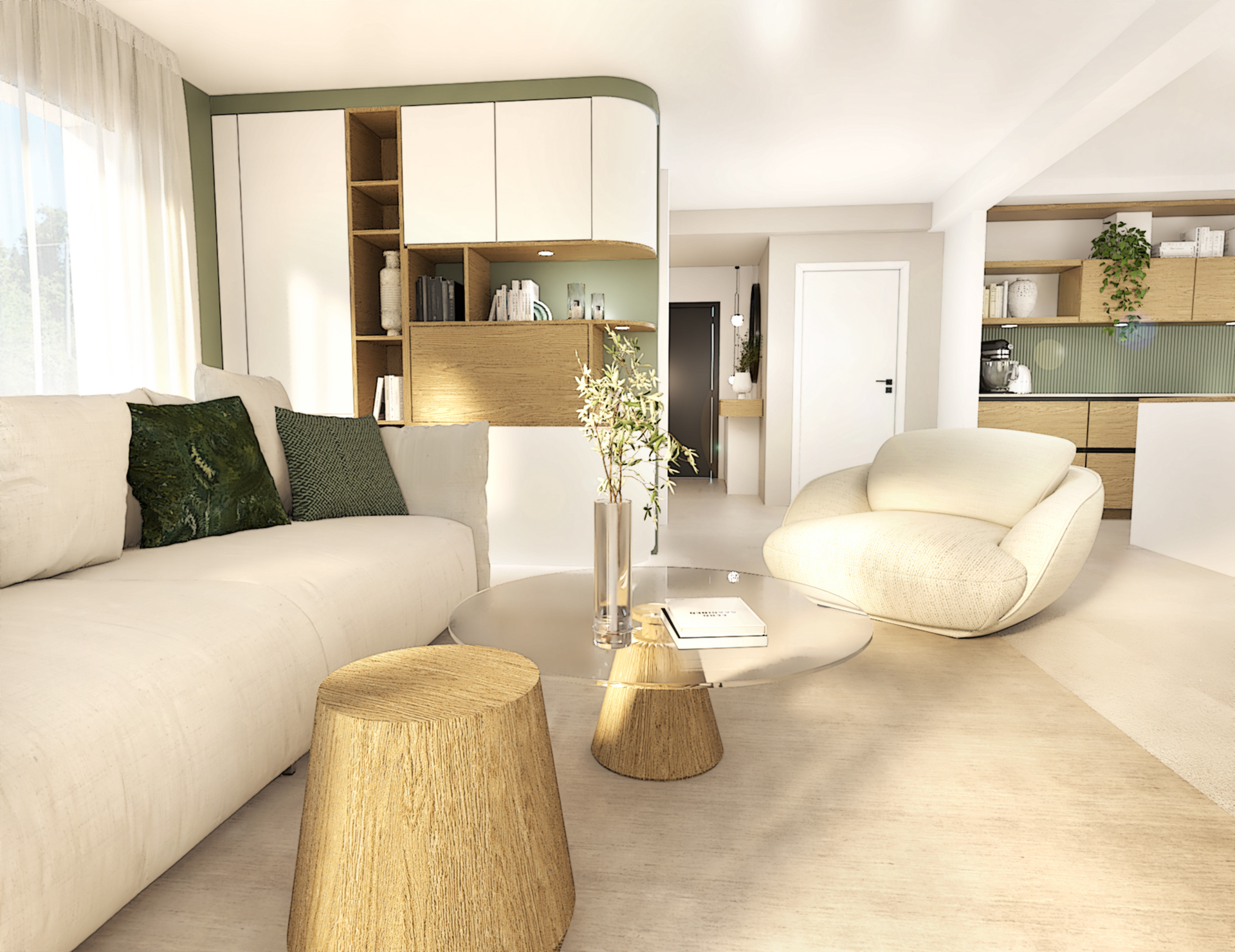 Ce projet de construction à Dardilly présente un salon au style contemporain et apaisant. Les couleurs douces (vert d’eau, blanc, beige) et les matières naturelles (bois, coton) créent une atmosphère paisible et invitante. La bibliothèque en bois et blanc offre de nombreux rangements et apporte une touche chaleureuse à la pièce. Les murs, le canapé et une partie des meubles sont blancs, ce qui agrandit visuellement l’espace et crée un effet de pureté. Ce séjour allie esthétisme et fonctionnalité, créant un espace de vie où il fait bon se détendre.