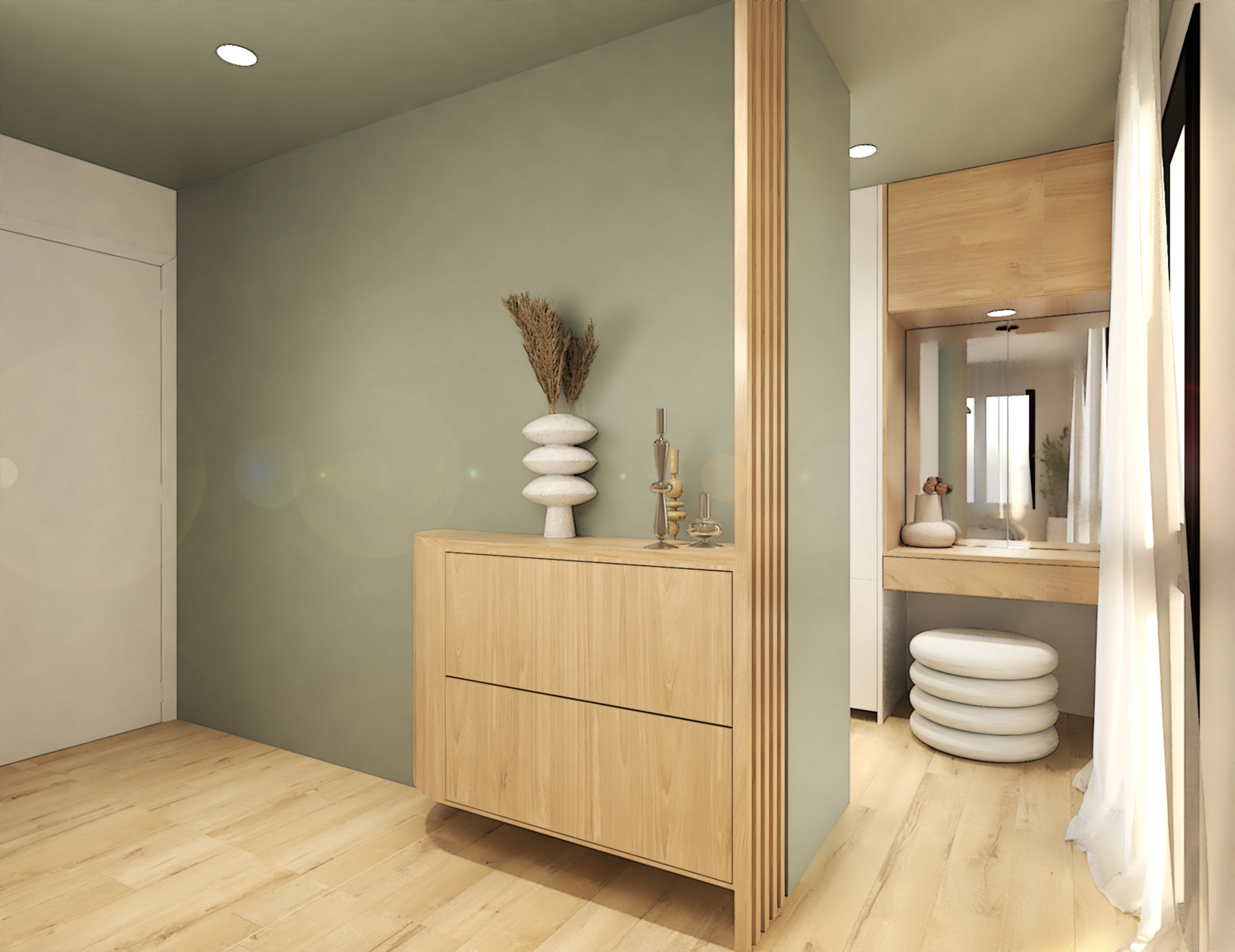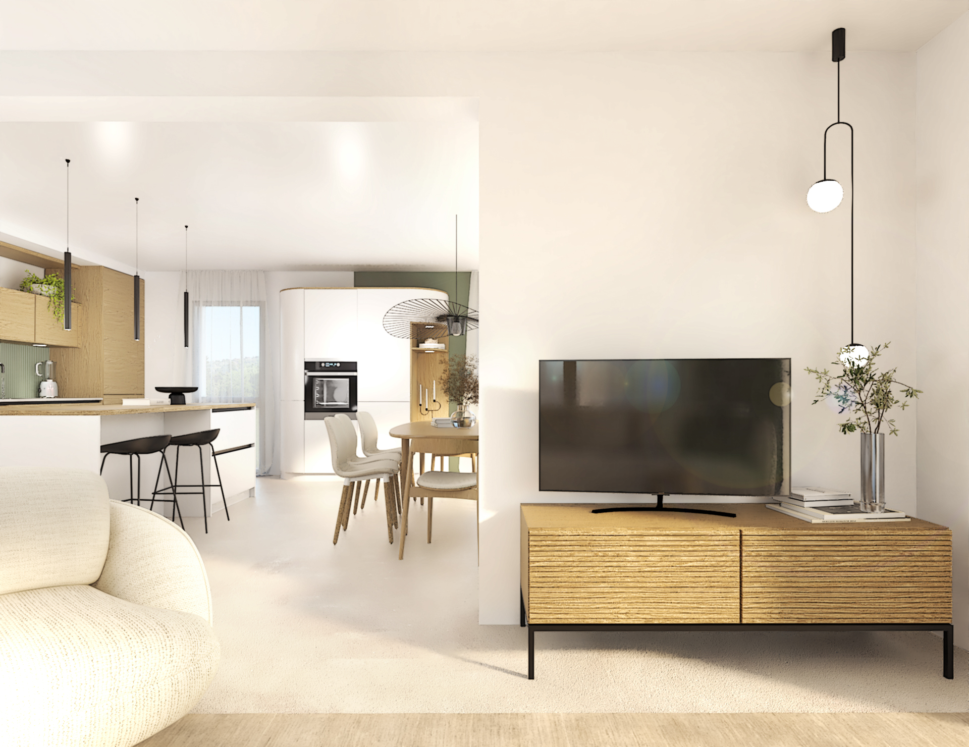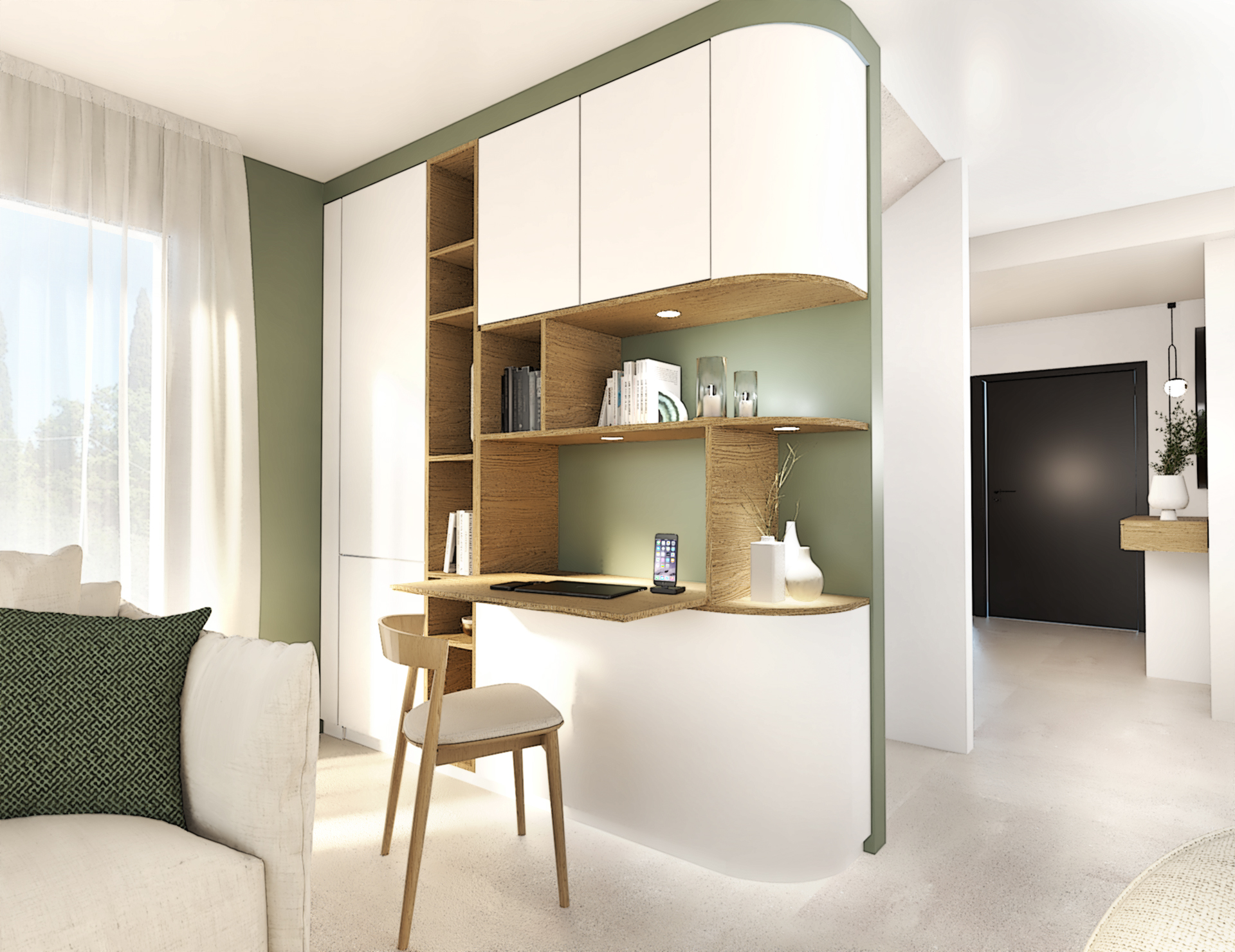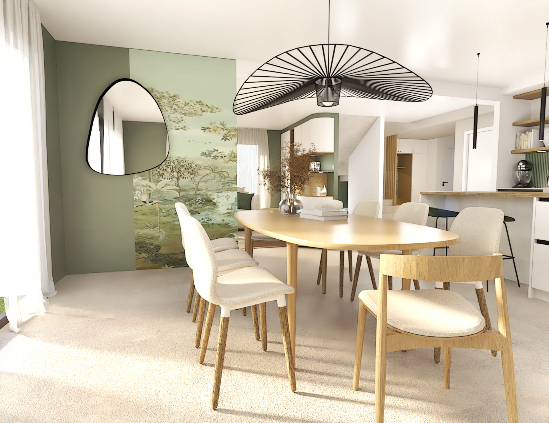 Ce projet de construction à Dardilly présente un salon au style contemporain et apaisant. Les couleurs douces (vert d’eau, blanc, beige) et les matières naturelles (bois, coton) créent une atmosphère paisible et invitante. La bibliothèque en bois et blanc offre de nombreux rangements et apporte une touche chaleureuse à la pièce. Les murs, le canapé et une partie des meubles sont blancs, ce qui agrandit visuellement l’espace et crée un effet de pureté. Ce séjour allie esthétisme et fonctionnalité, créant un espace de vie où il fait bon se détendre.