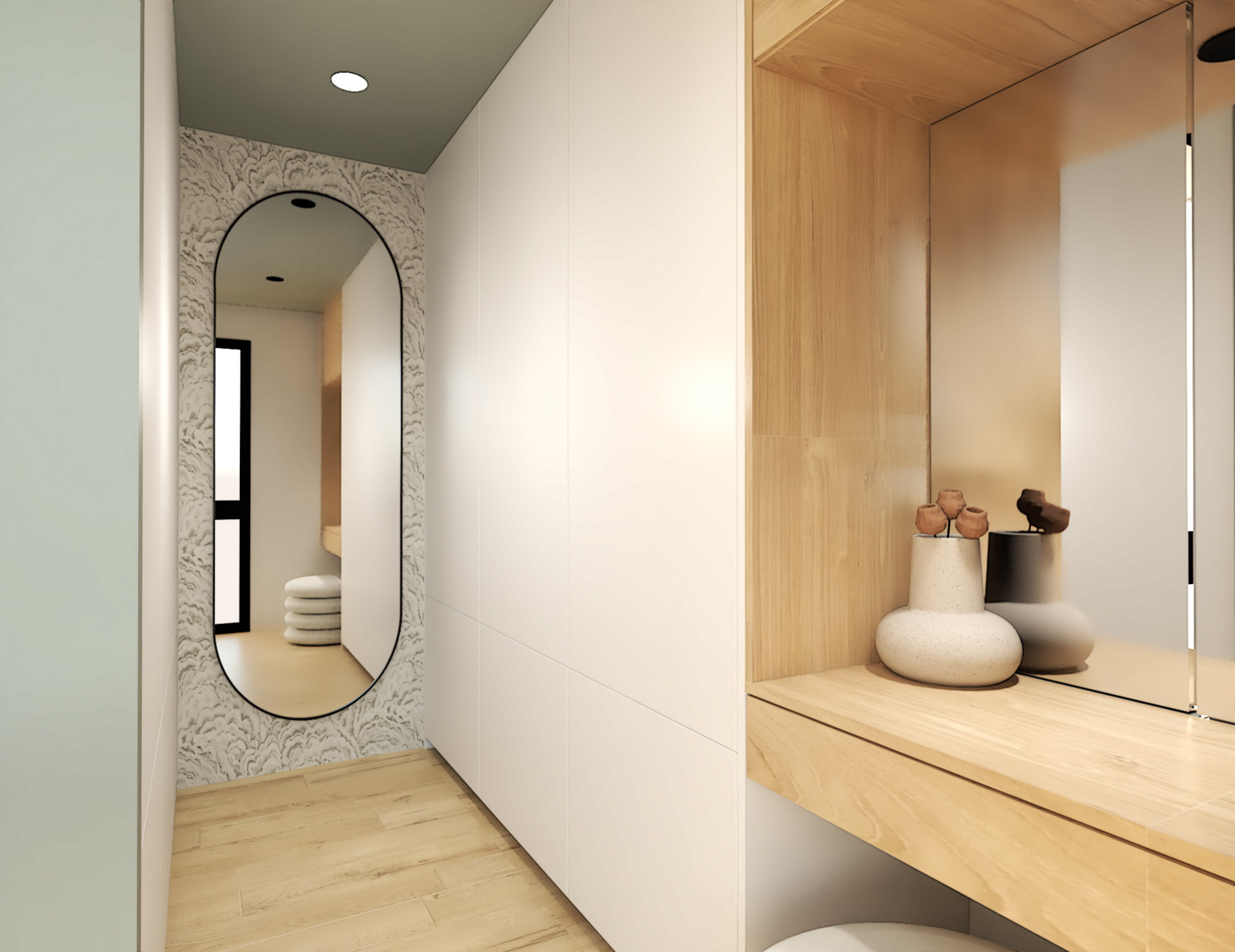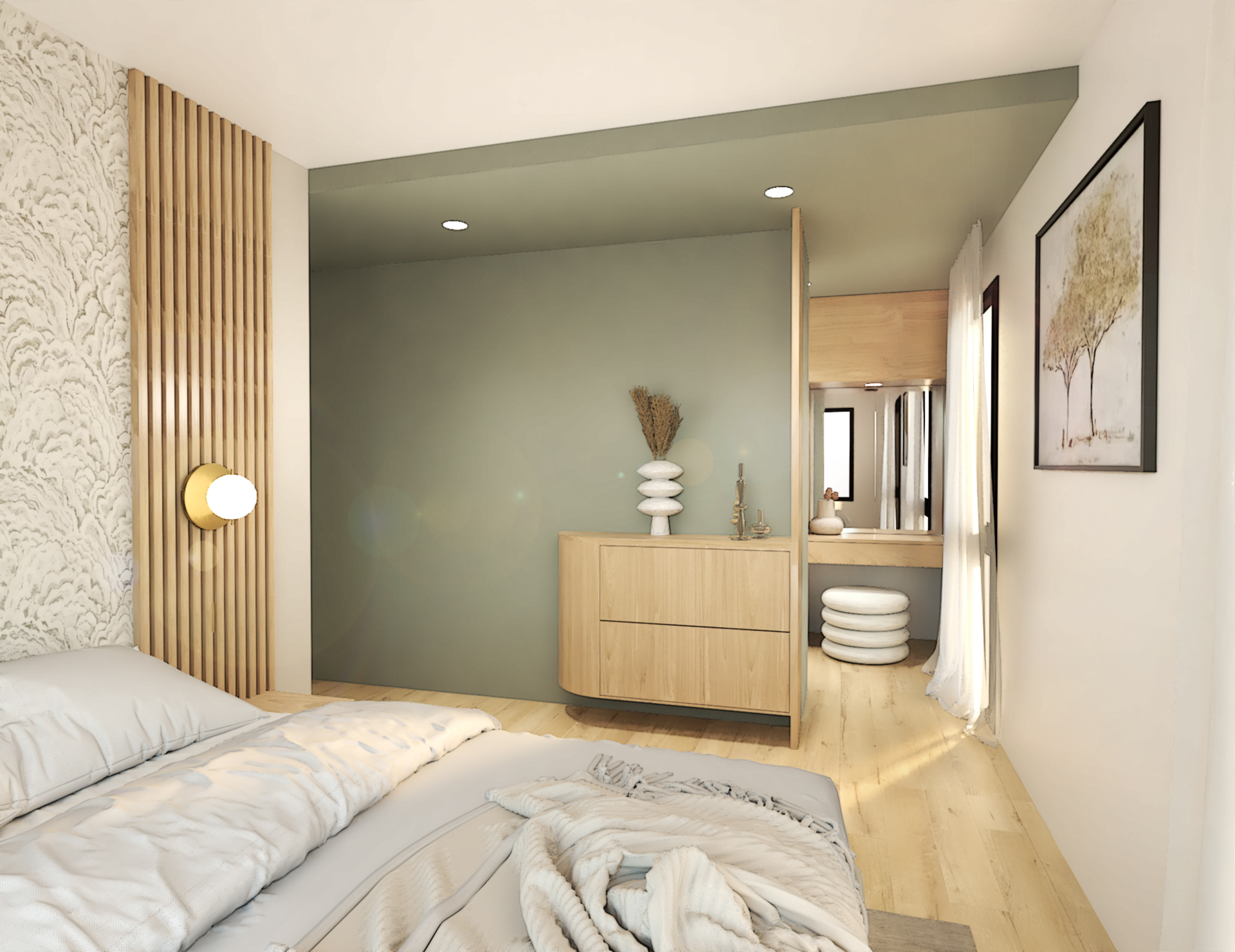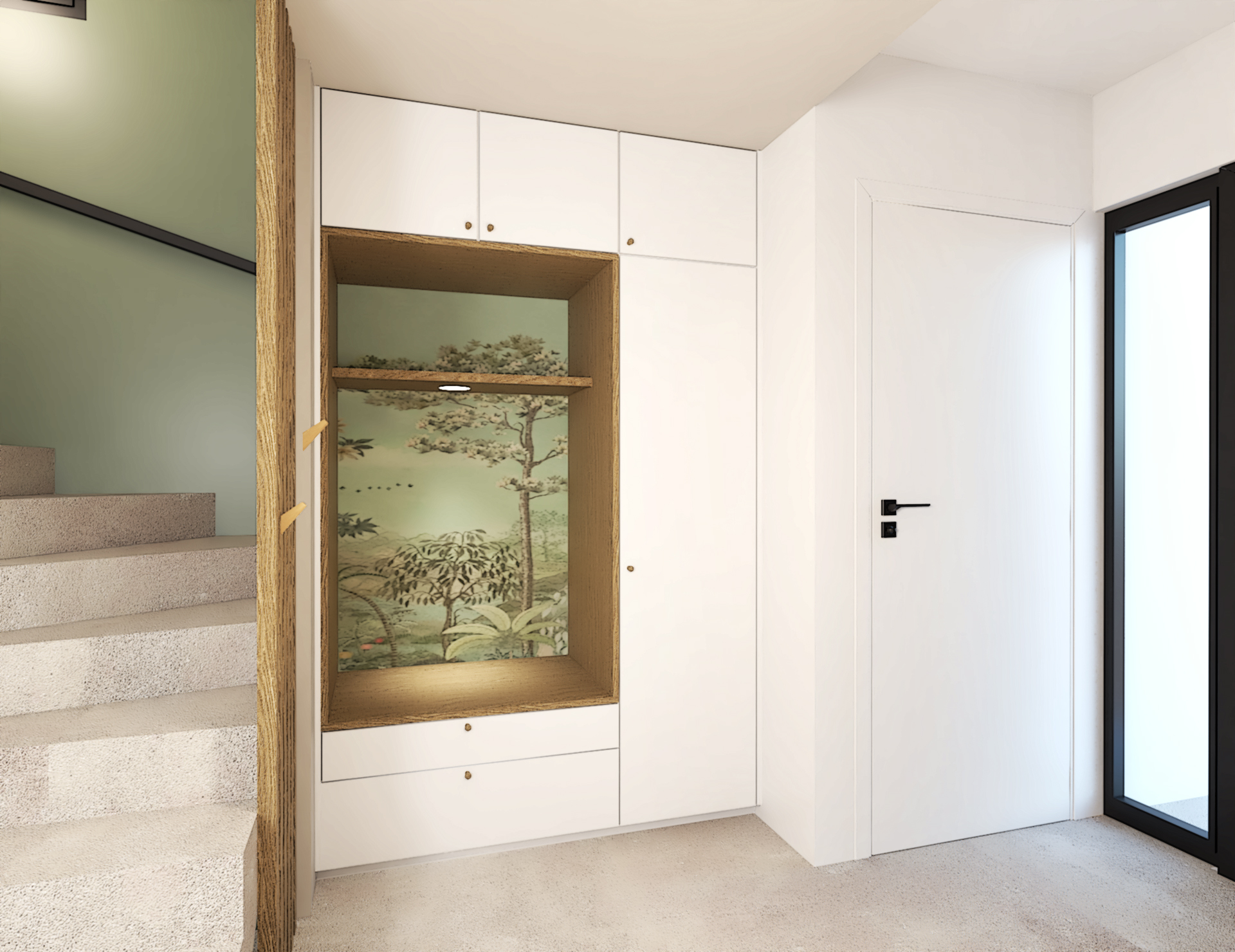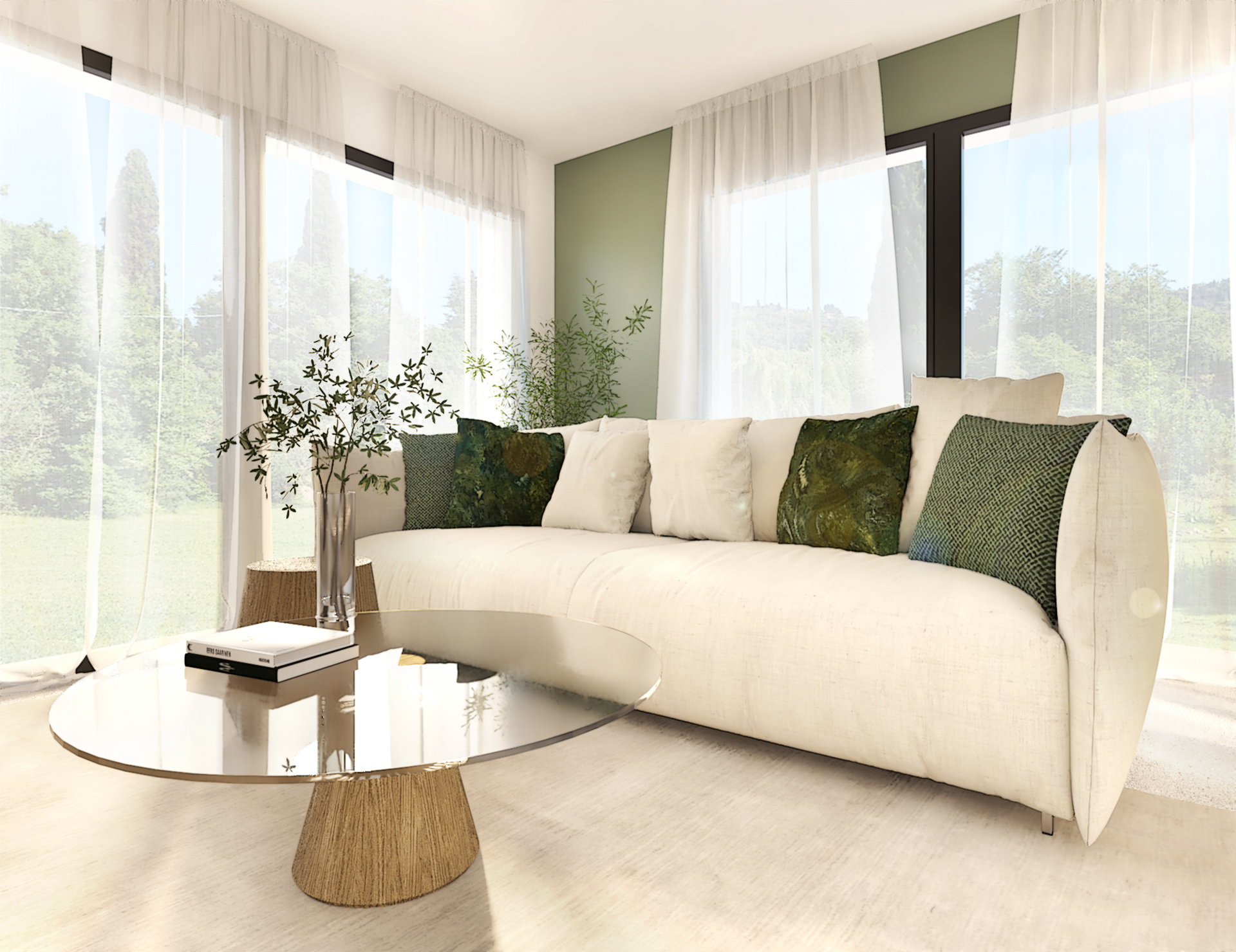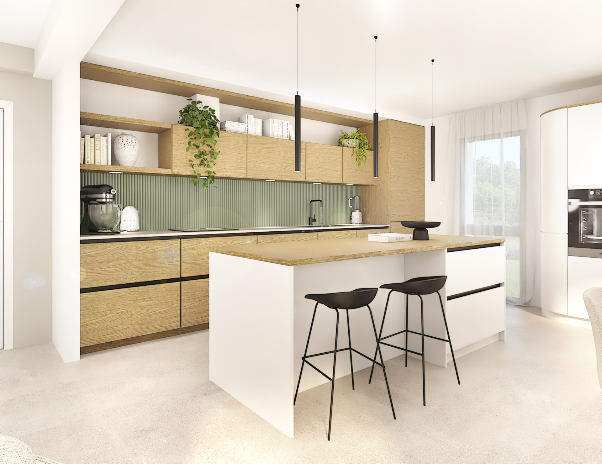 Ce projet de construction à Dardilly présente un salon au style contemporain et apaisant. Les couleurs douces (vert d’eau, blanc, beige) et les matières naturelles (bois, coton) créent une atmosphère paisible et invitante. La bibliothèque en bois et blanc offre de nombreux rangements et apporte une touche chaleureuse à la pièce. Les murs, le canapé et une partie des meubles sont blancs, ce qui agrandit visuellement l’espace et crée un effet de pureté. Ce séjour allie esthétisme et fonctionnalité, créant un espace de vie où il fait bon se détendre.