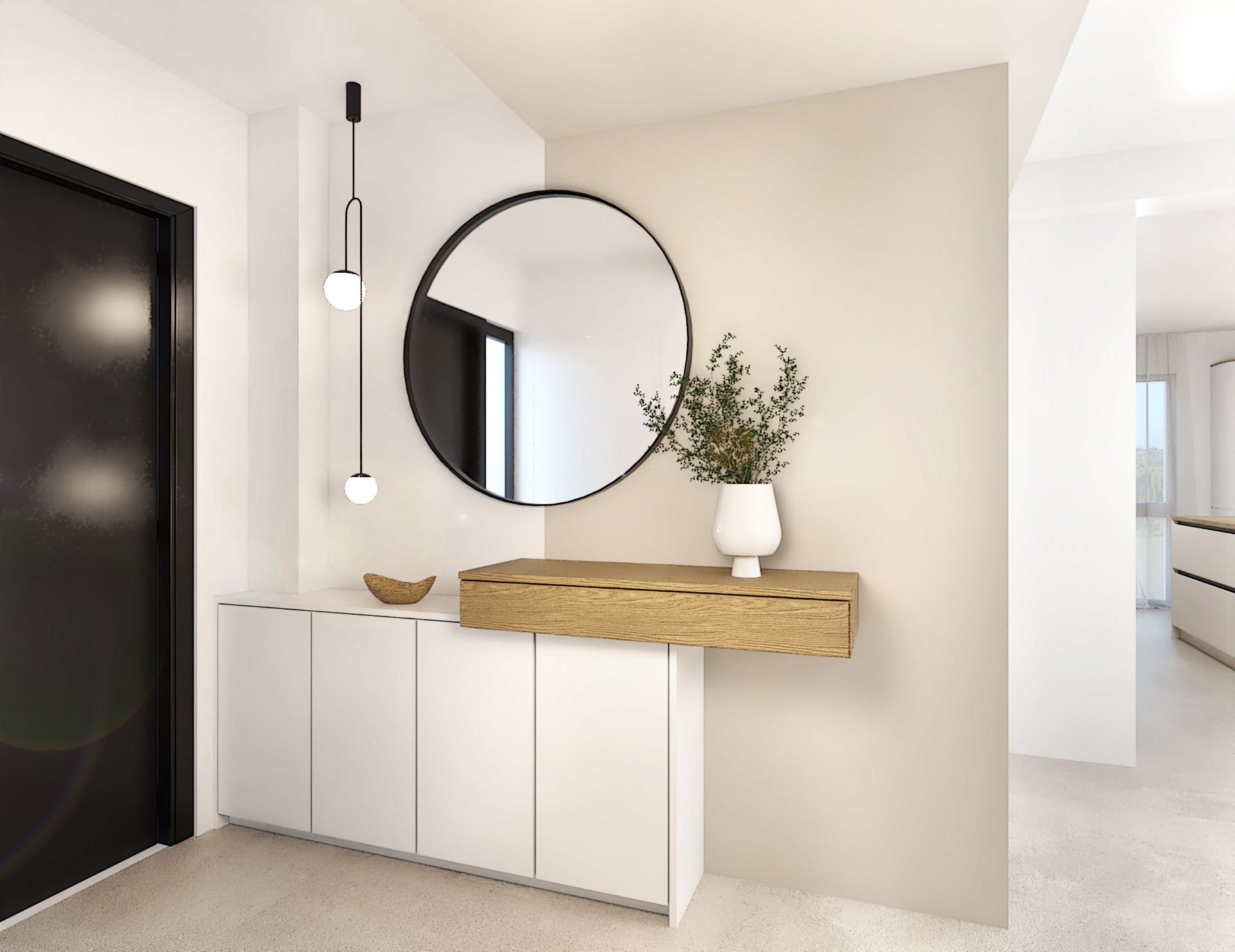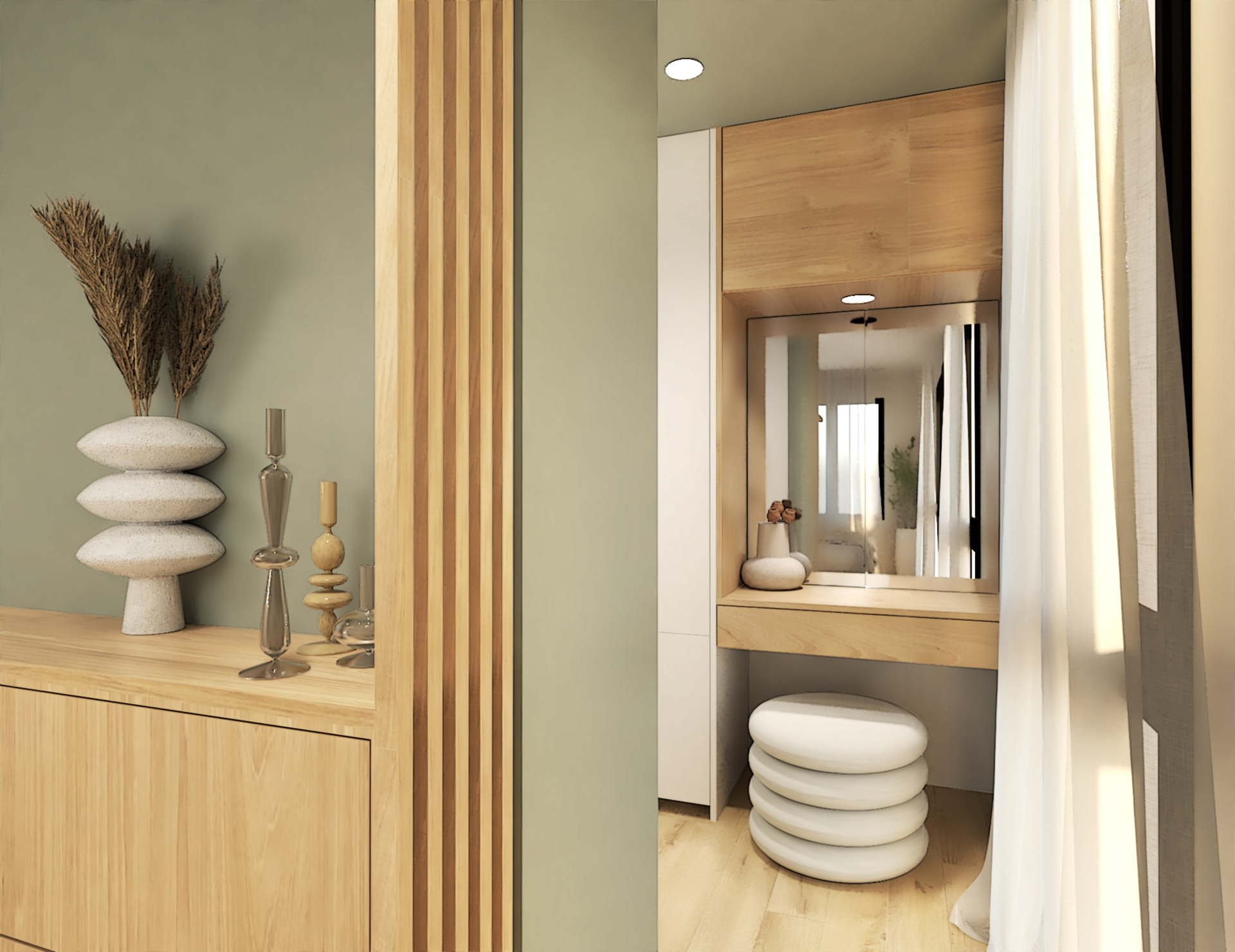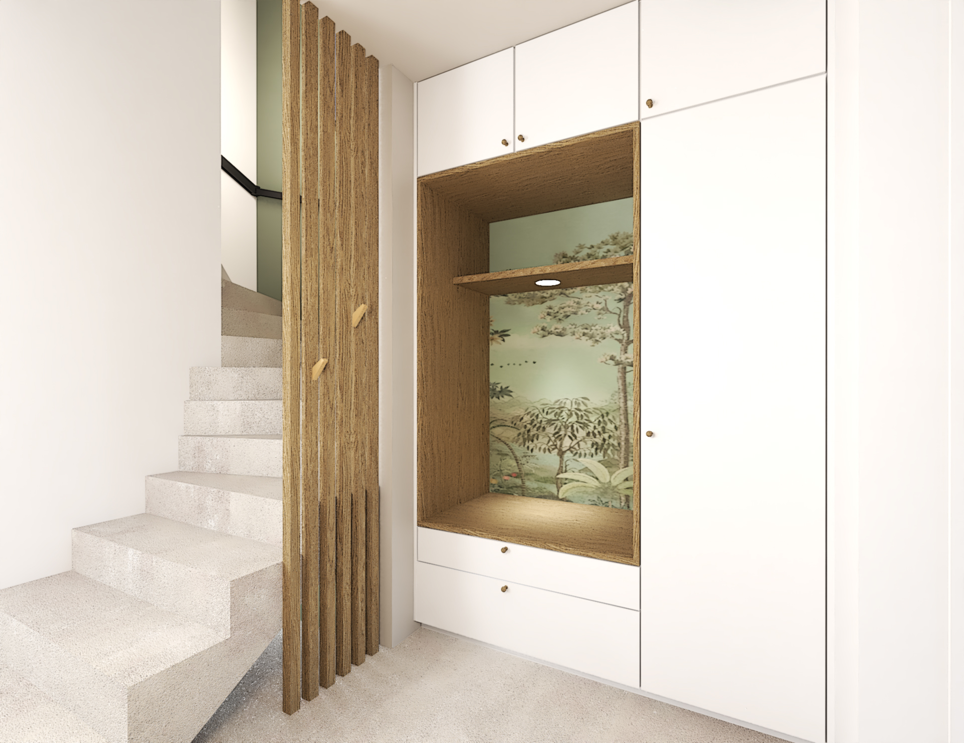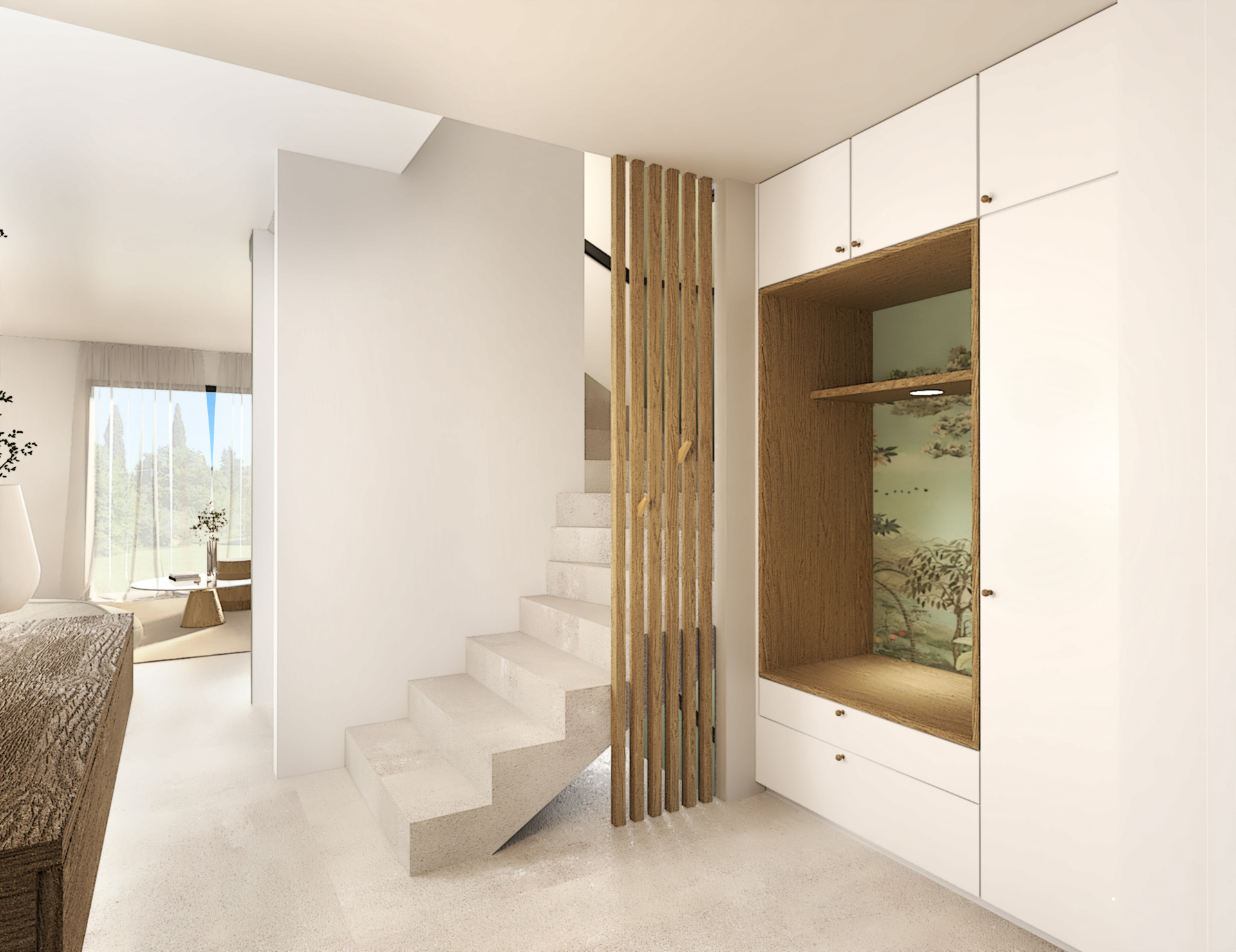 Ce projet de construction à Dardilly présente un salon au style contemporain et apaisant. Les couleurs douces (vert d’eau, blanc, beige) et les matières naturelles (bois, coton) créent une atmosphère paisible et invitante. La bibliothèque en bois et blanc offre de nombreux rangements et apporte une touche chaleureuse à la pièce. Les murs, le canapé et une partie des meubles sont blancs, ce qui agrandit visuellement l’espace et crée un effet de pureté. Ce séjour allie esthétisme et fonctionnalité, créant un espace de vie où il fait bon se détendre.