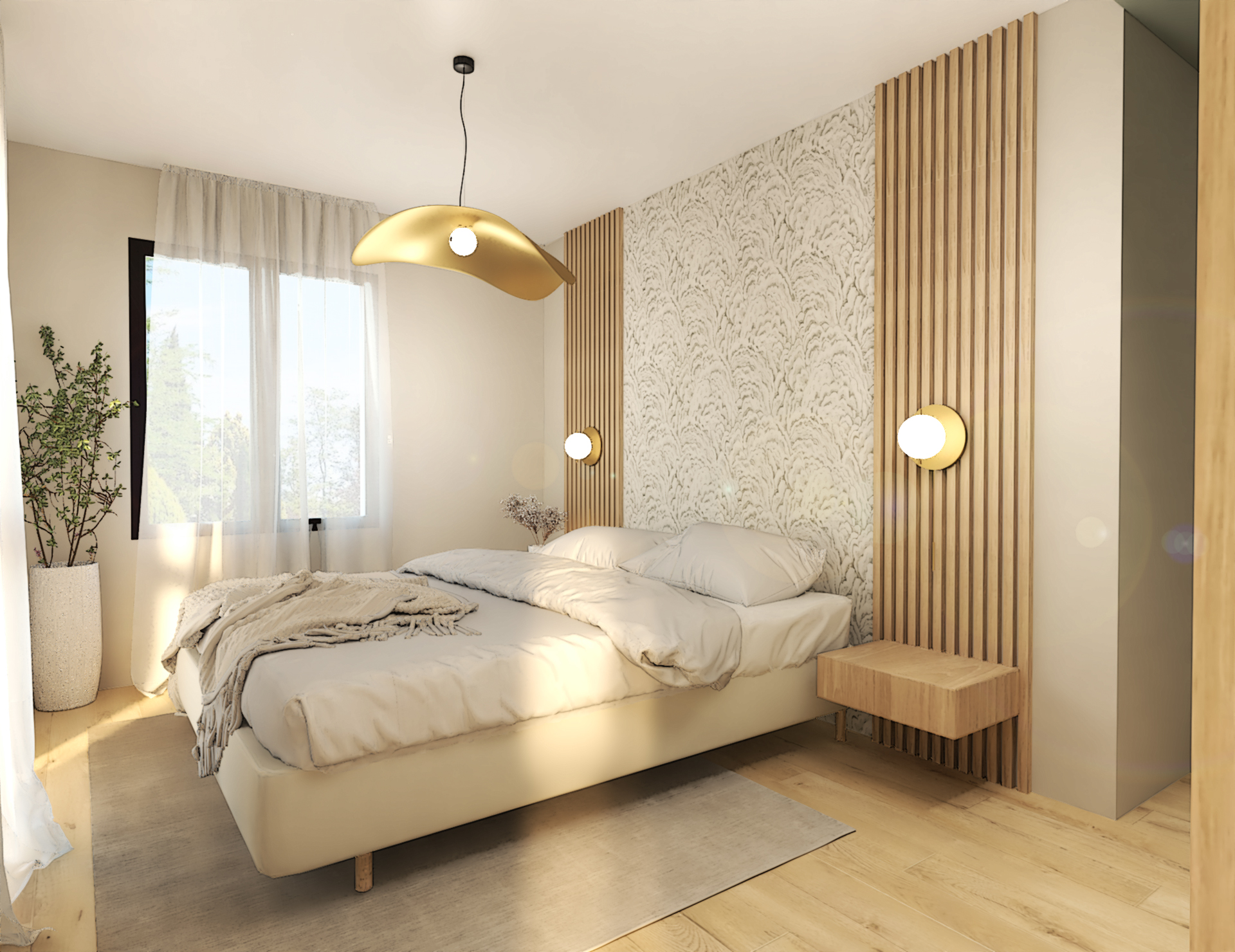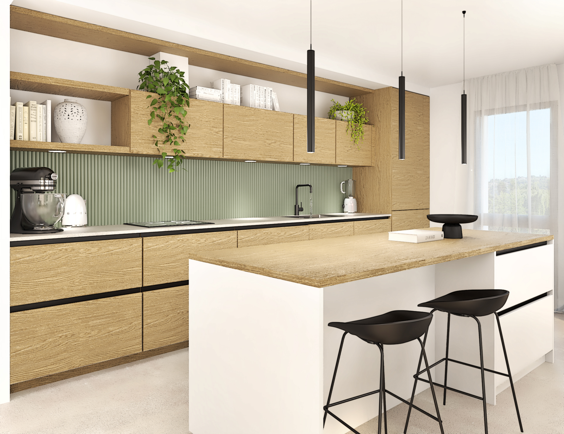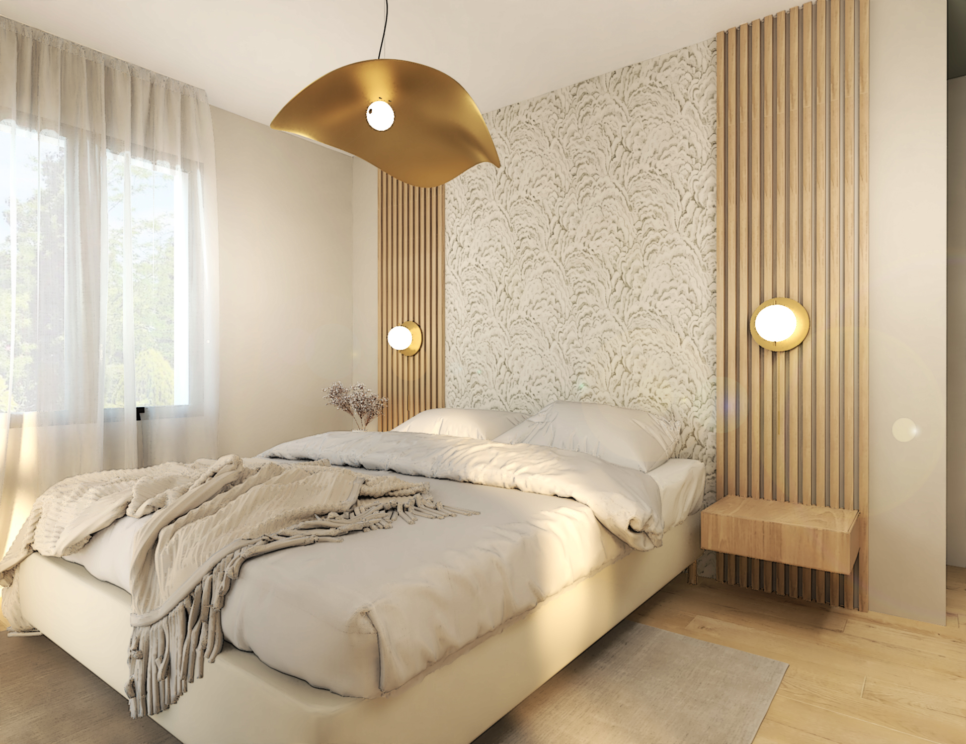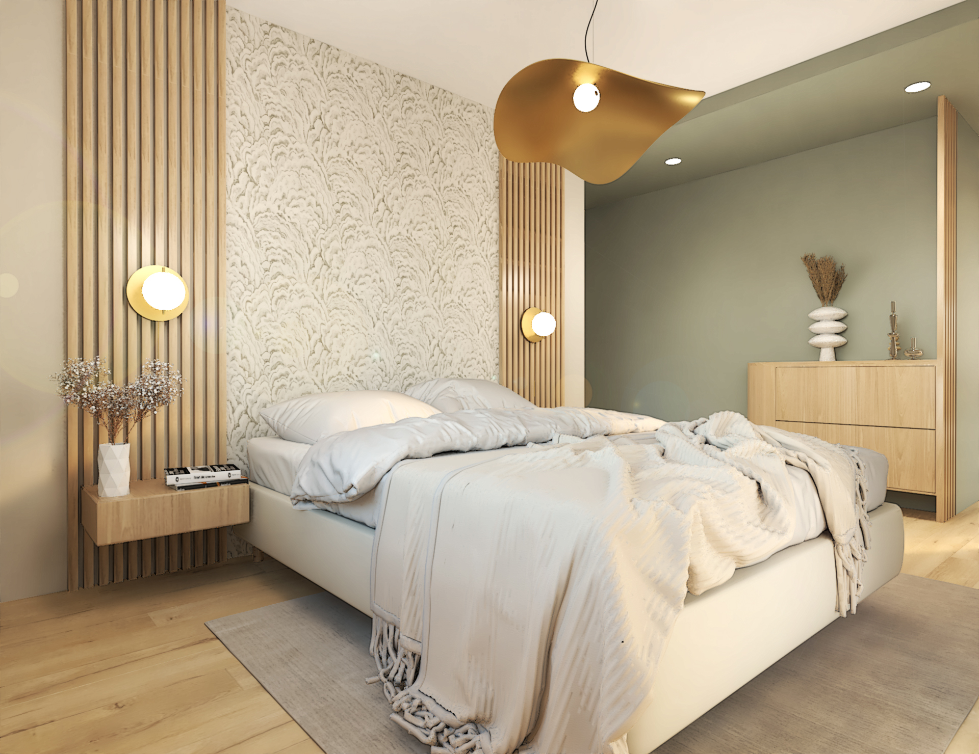 Ce projet de construction à Dardilly présente un salon au style contemporain et apaisant. Les couleurs douces (vert d’eau, blanc, beige) et les matières naturelles (bois, coton) créent une atmosphère paisible et invitante. La bibliothèque en bois et blanc offre de nombreux rangements et apporte une touche chaleureuse à la pièce. Les murs, le canapé et une partie des meubles sont blancs, ce qui agrandit visuellement l’espace et crée un effet de pureté. Ce séjour allie esthétisme et fonctionnalité, créant un espace de vie où il fait bon se détendre.