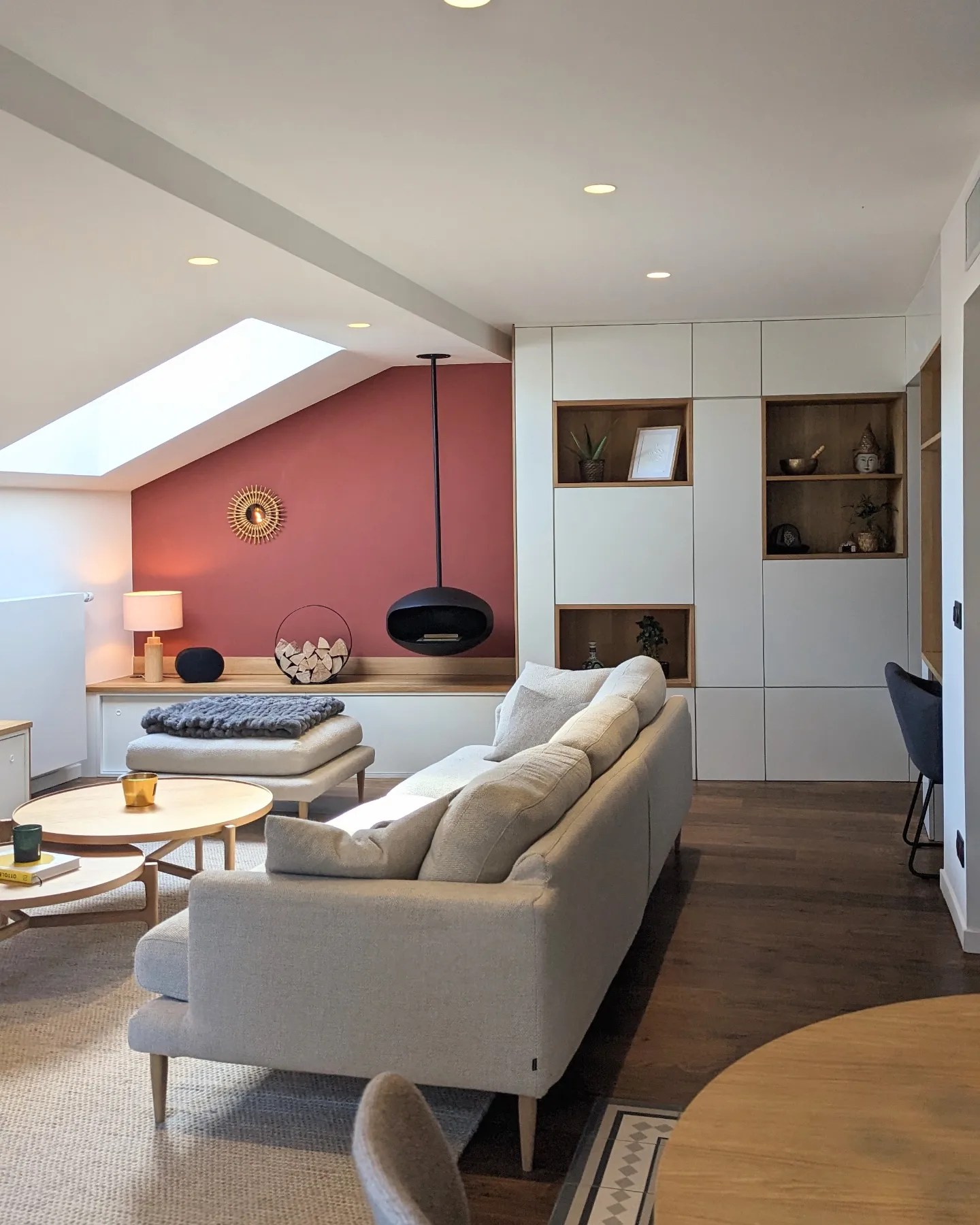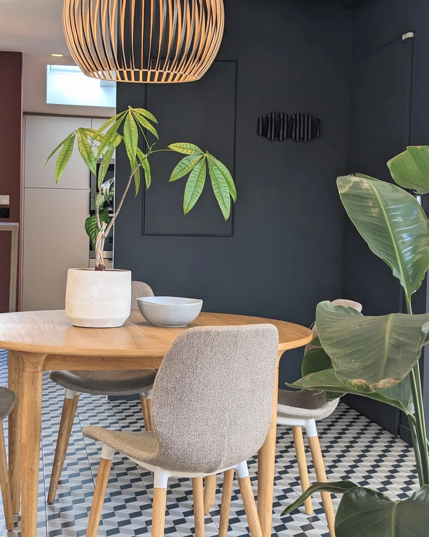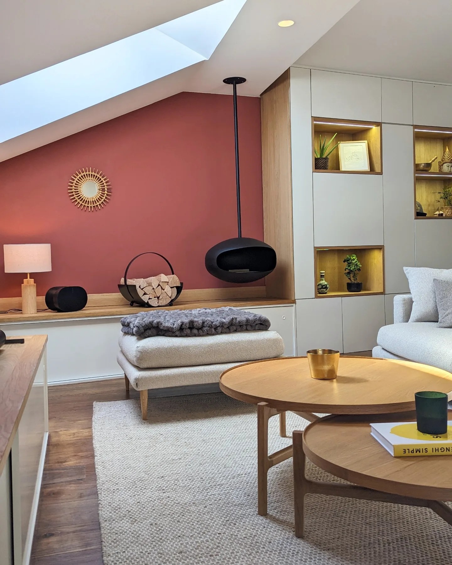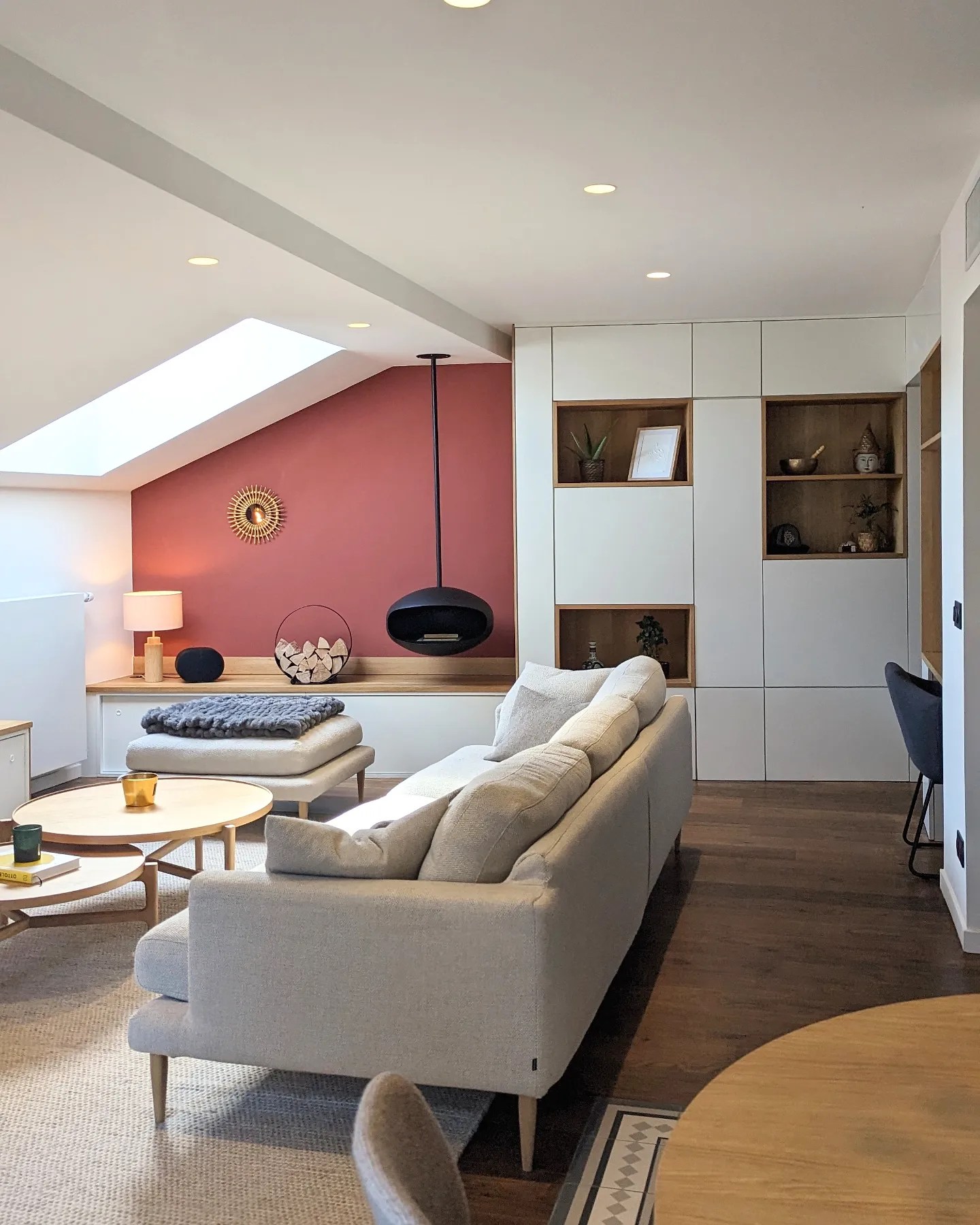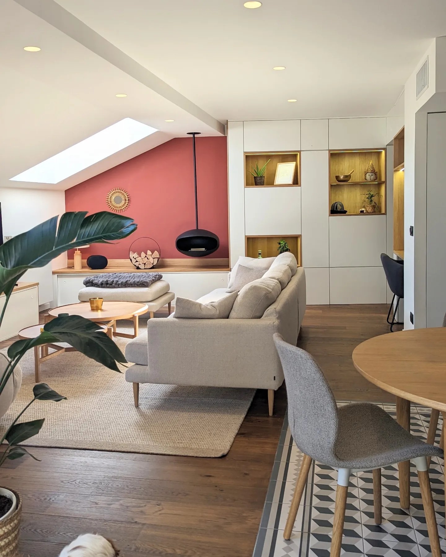 Rénovation d’un bel appartement à Lyon 3ème. Ce salon est le reflet d’une personnalité unique grâce au mélange de styles et à l’utilisation de couleurs et de matériaux variés. Alliant le contemporain avec des touches plus chaleureuses et naturelles. Le résultat est un intérieur vivant et personnalisé. Le choix de matériaux naturels (bois, plantes) et de mobilier confortable confère à l’espace une élégance décontractée, parfaite pour se détendre. Le mur terre de sienne apporte une touche de couleur et de caractère à la pièce. Il sert de point focal et crée une atmosphère chaleureuse. Quant à lui, le noir crée un contraste intéressant avec les autres éléments de la pièce et apporte une touche de profondeur.