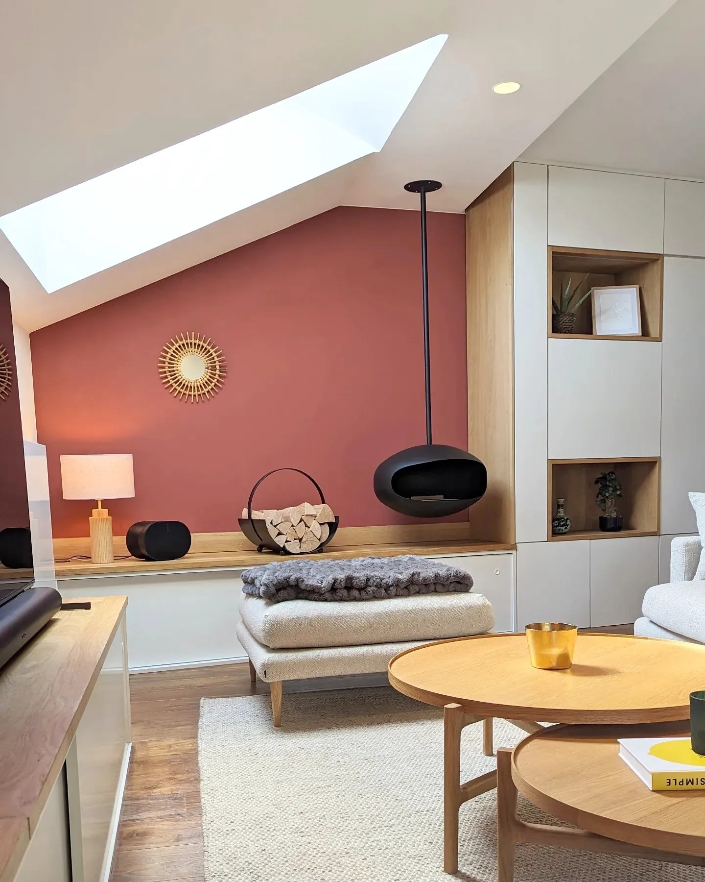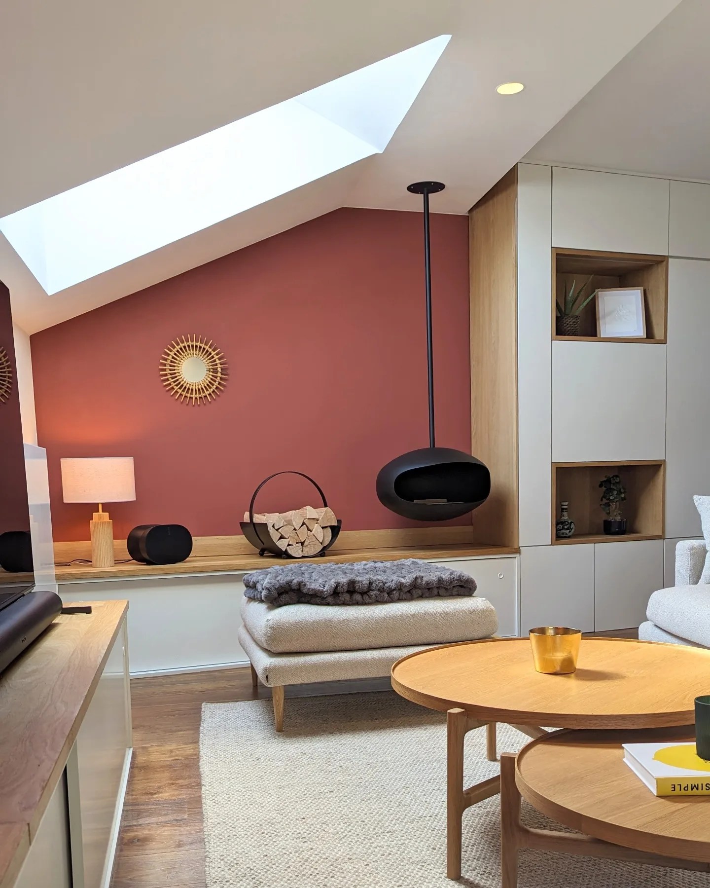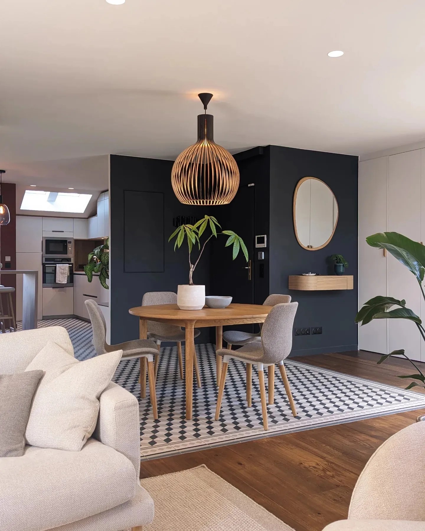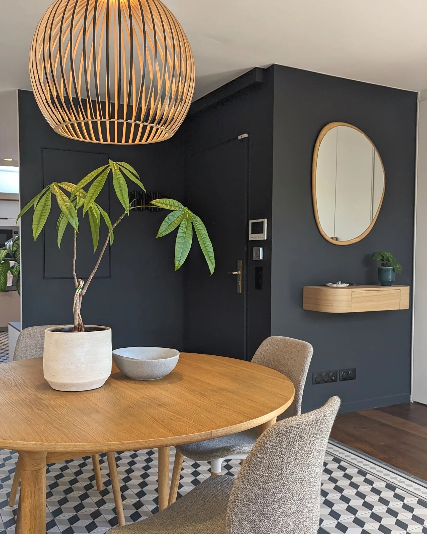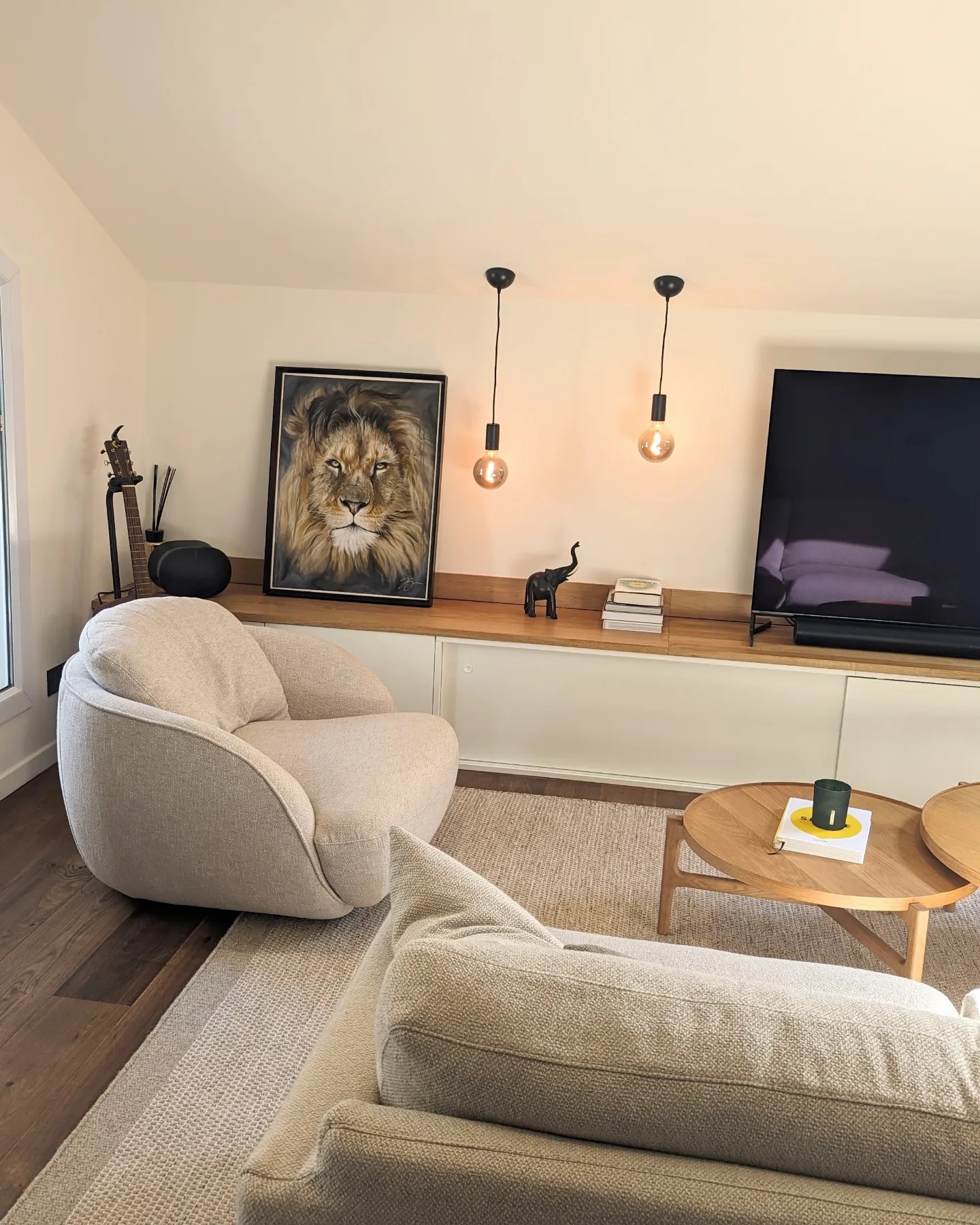 Rénovation d’un bel appartement à Lyon 3ème. Ce salon est le reflet d’une personnalité unique grâce au mélange de styles et à l’utilisation de couleurs et de matériaux variés. Alliant le contemporain avec des touches plus chaleureuses et naturelles. Le résultat est un intérieur vivant et personnalisé. Le choix de matériaux naturels (bois, plantes) et de mobilier confortable confère à l’espace une élégance décontractée, parfaite pour se détendre. Le mur terre de sienne apporte une touche de couleur et de caractère à la pièce. Il sert de point focal et crée une atmosphère chaleureuse. Quant à lui, le noir crée un contraste intéressant avec les autres éléments de la pièce et apporte une touche de profondeur.