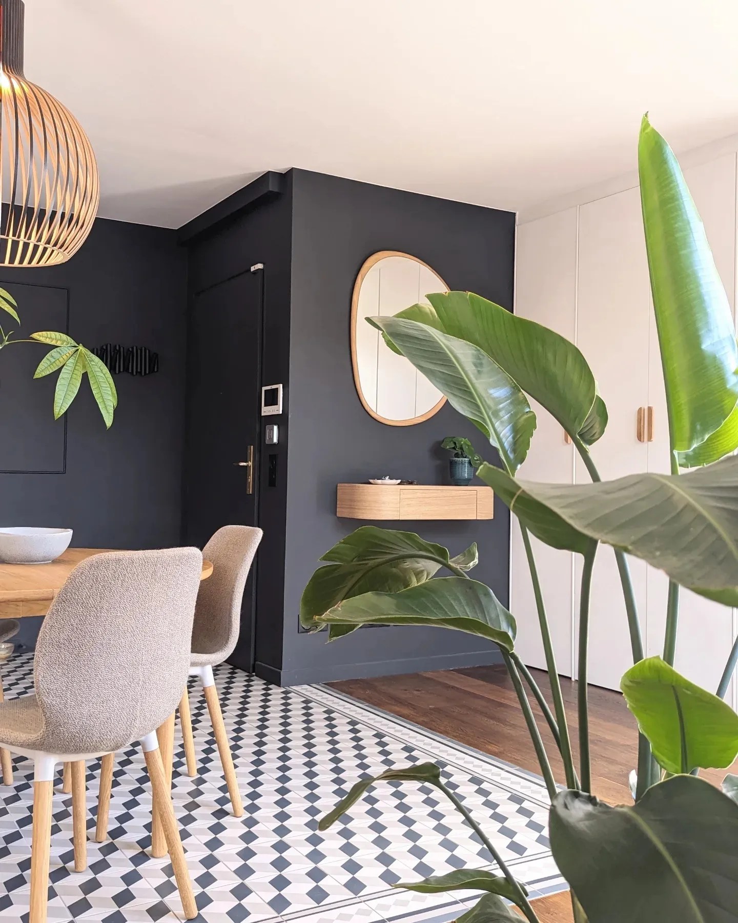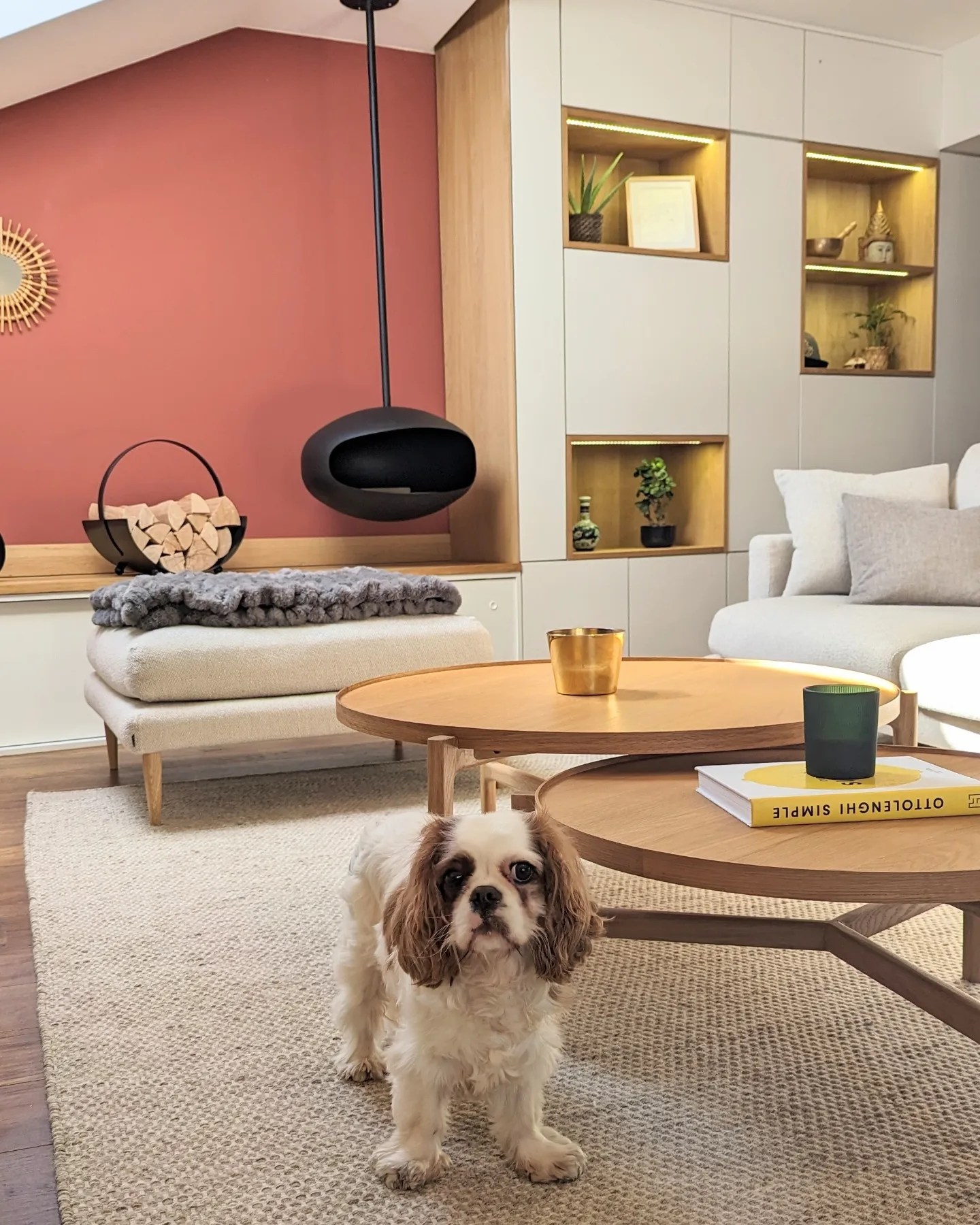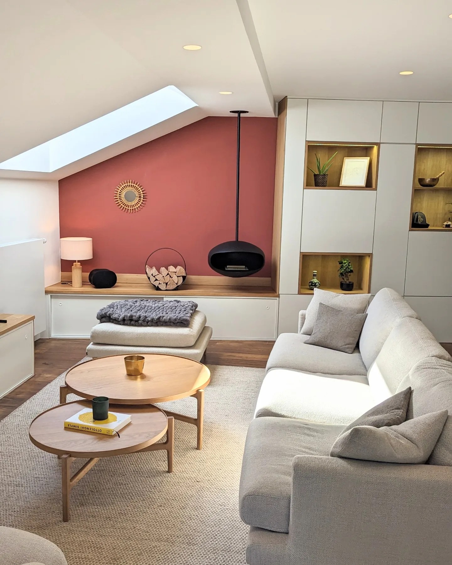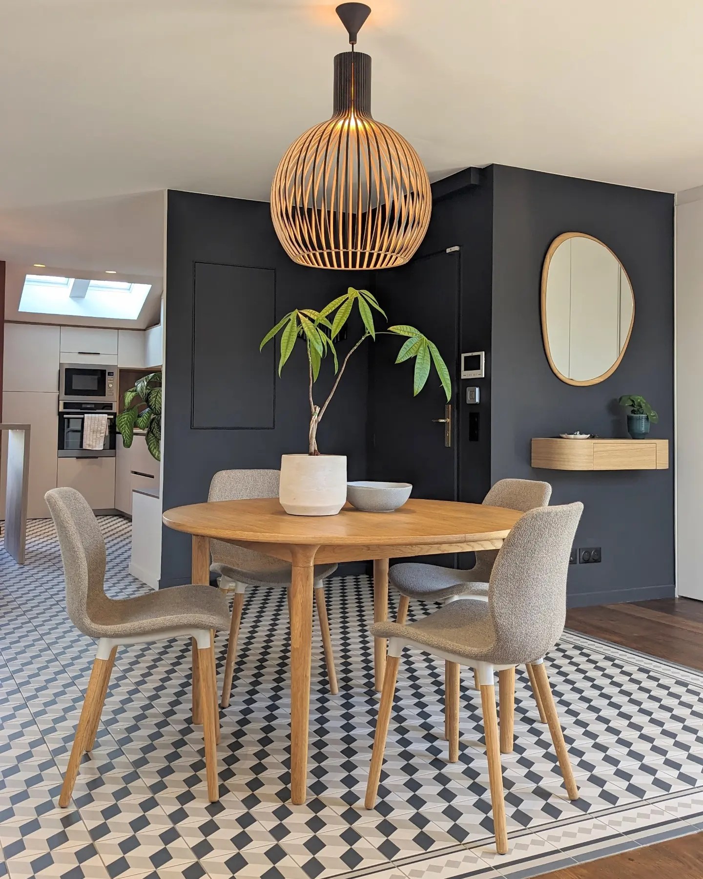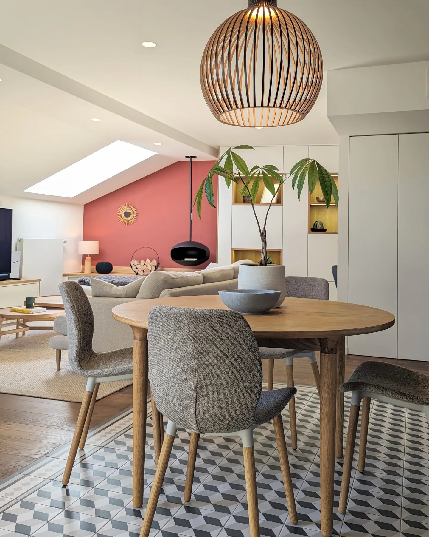 Rénovation d’un bel appartement à Lyon 3ème. Ce salon est le reflet d’une personnalité unique grâce au mélange de styles et à l’utilisation de couleurs et de matériaux variés. Alliant le contemporain avec des touches plus chaleureuses et naturelles. Le résultat est un intérieur vivant et personnalisé. Le choix de matériaux naturels (bois, plantes) et de mobilier confortable confère à l’espace une élégance décontractée, parfaite pour se détendre. Le mur terre de sienne apporte une touche de couleur et de caractère à la pièce. Il sert de point focal et crée une atmosphère chaleureuse. Quant à lui, le noir crée un contraste intéressant avec les autres éléments de la pièce et apporte une touche de profondeur.