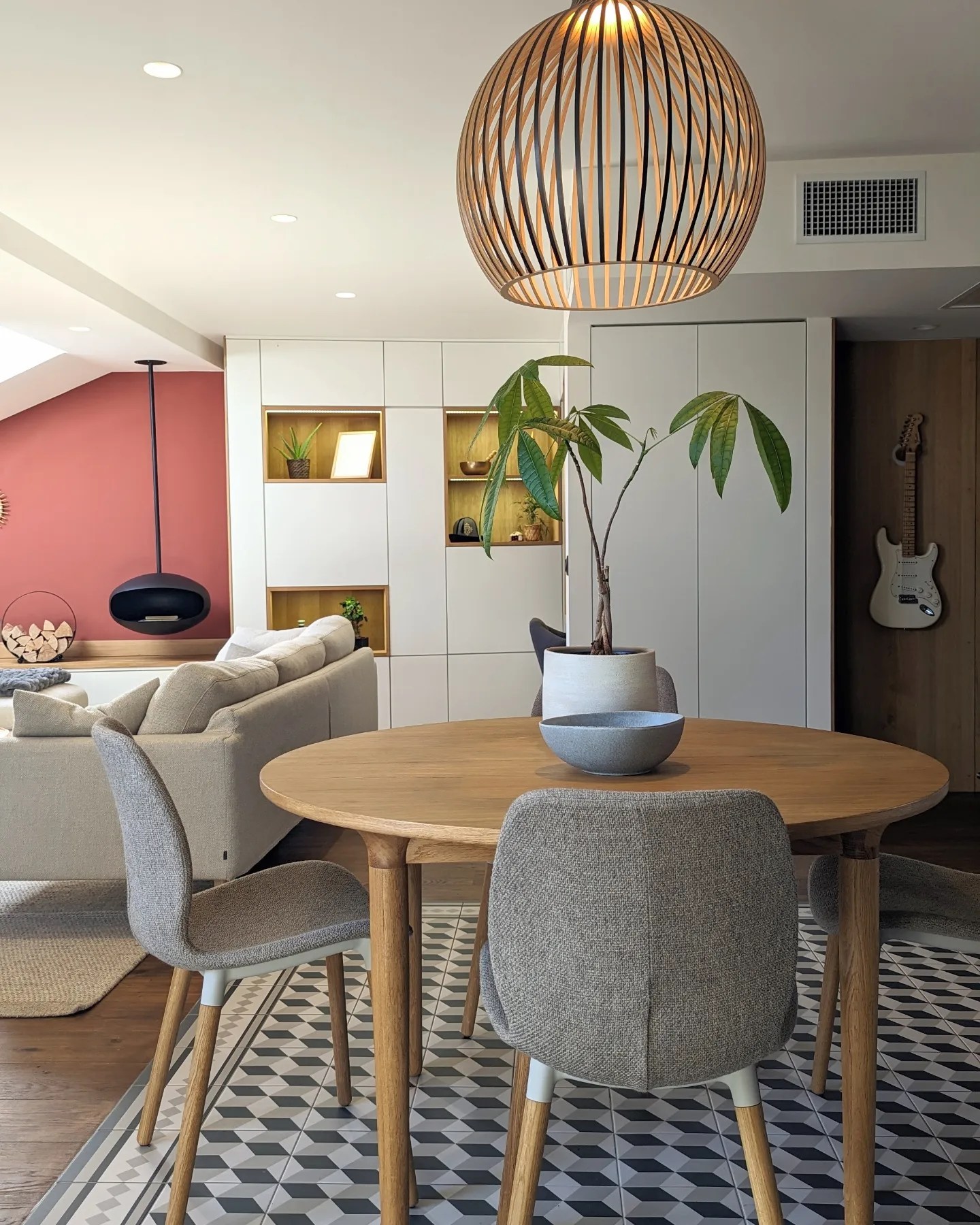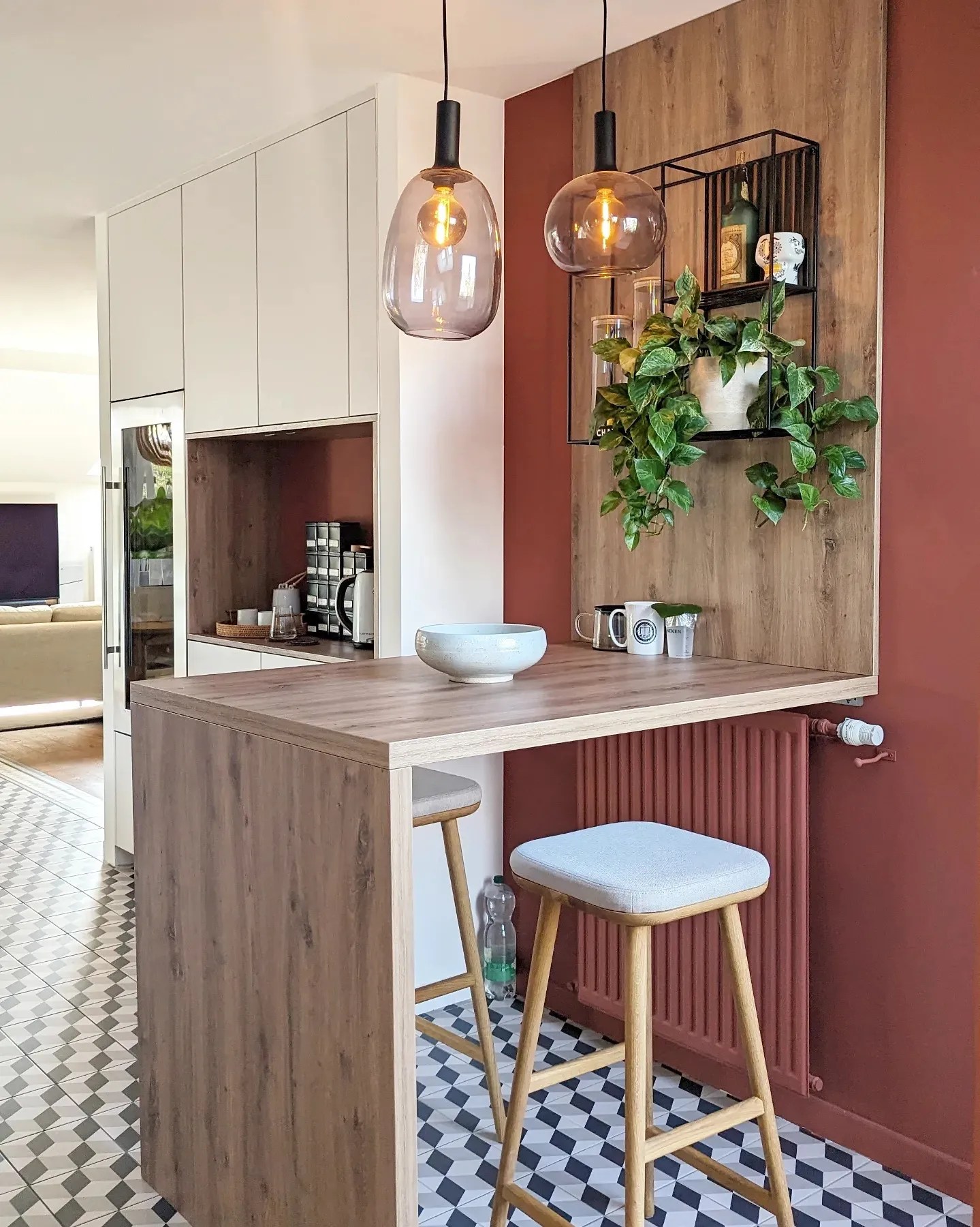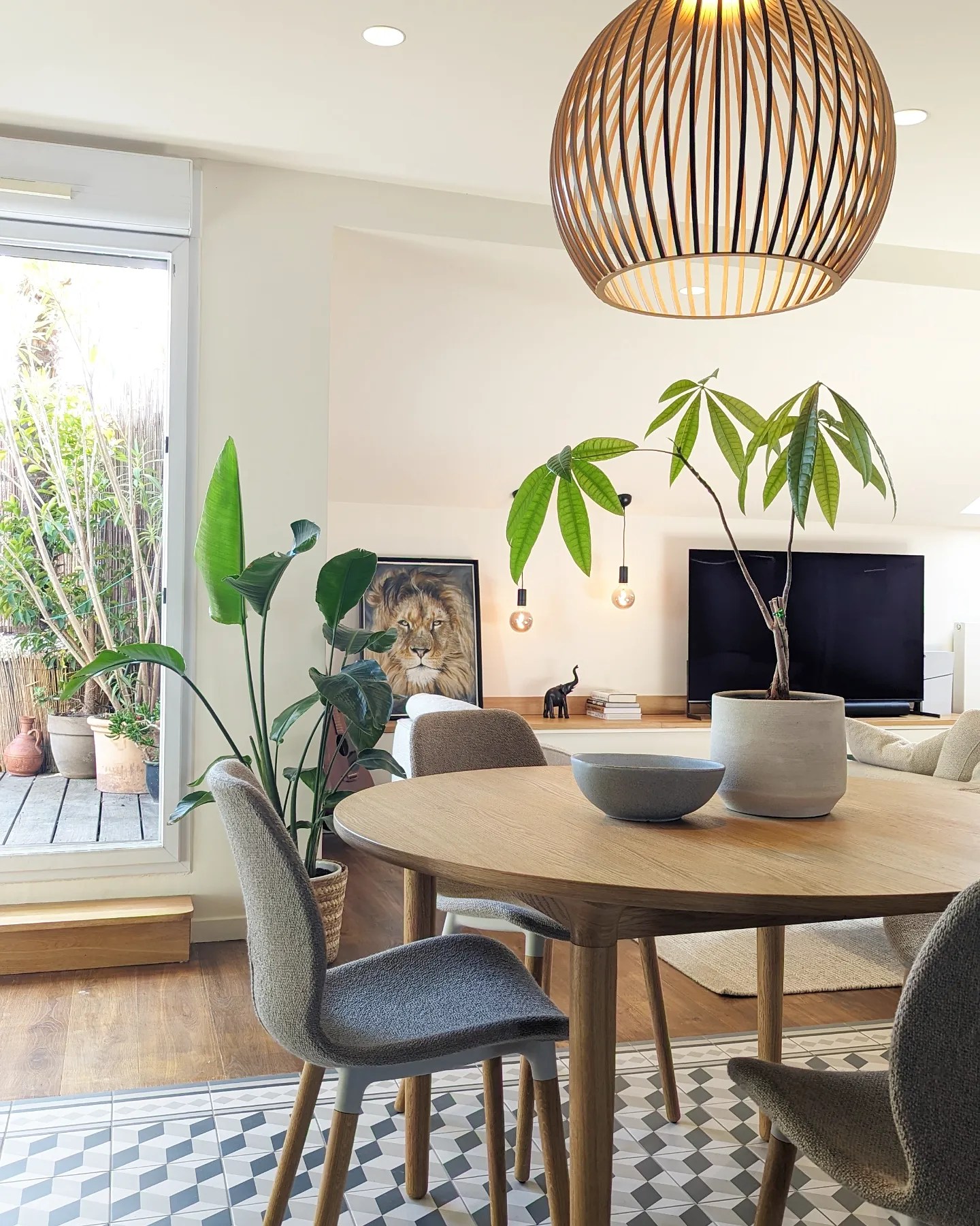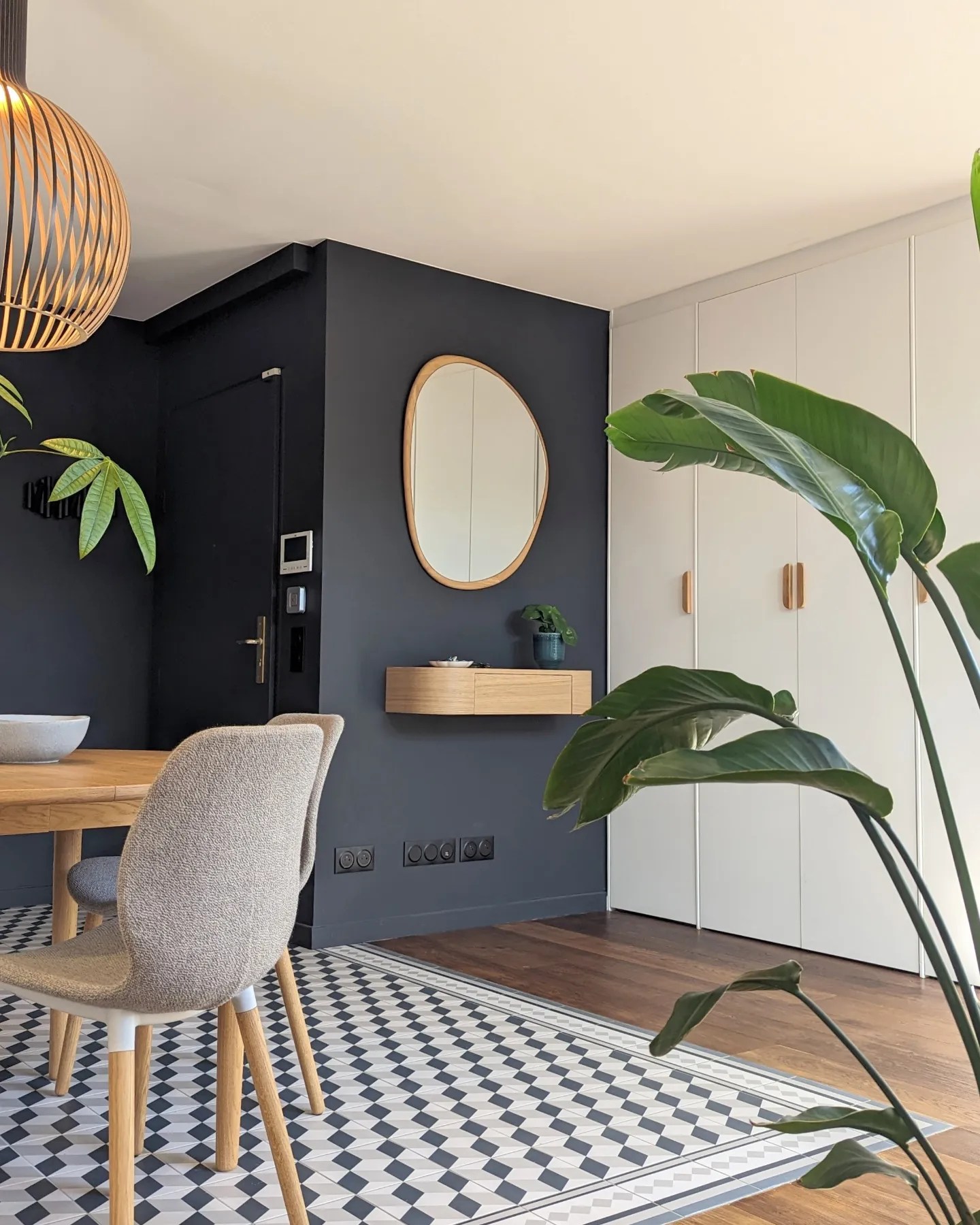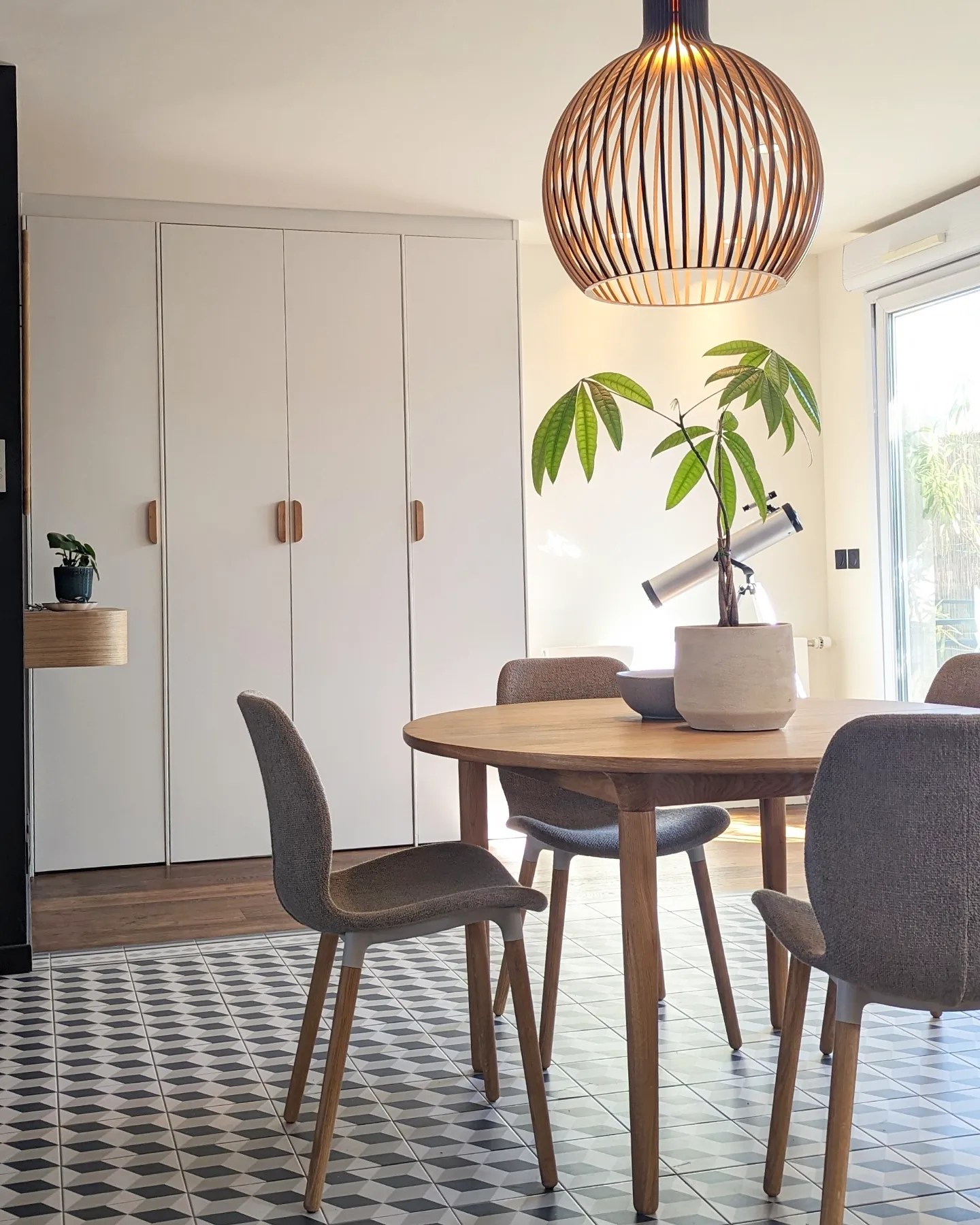 Rénovation d’un bel appartement à Lyon 3ème. Ce salon est le reflet d’une personnalité unique grâce au mélange de styles et à l’utilisation de couleurs et de matériaux variés. Alliant le contemporain avec des touches plus chaleureuses et naturelles. Le résultat est un intérieur vivant et personnalisé. Le choix de matériaux naturels (bois, plantes) et de mobilier confortable confère à l’espace une élégance décontractée, parfaite pour se détendre. Le mur terre de sienne apporte une touche de couleur et de caractère à la pièce. Il sert de point focal et crée une atmosphère chaleureuse. Quant à lui, le noir crée un contraste intéressant avec les autres éléments de la pièce et apporte une touche de profondeur.
