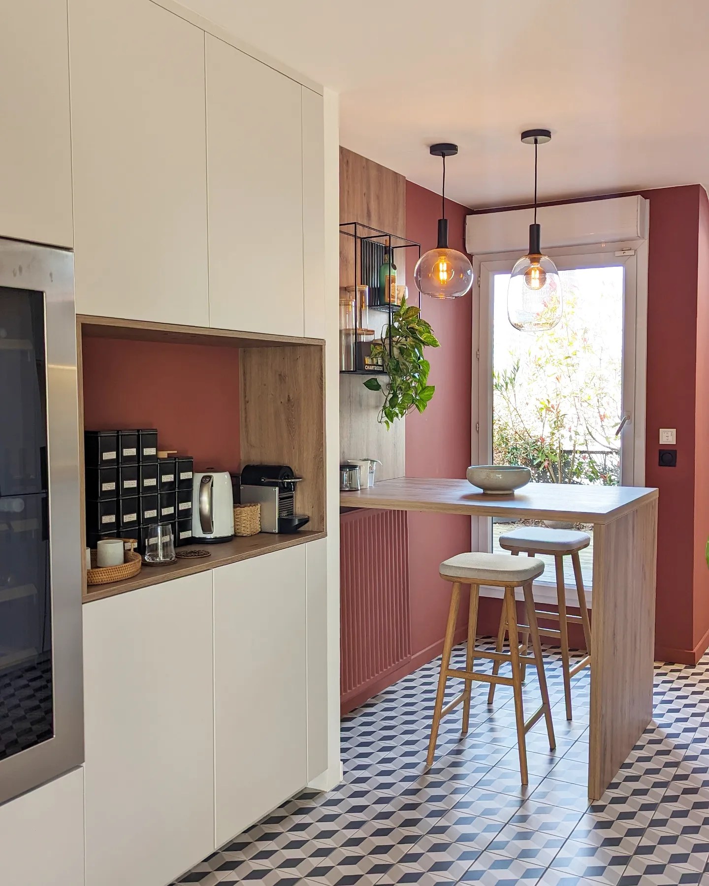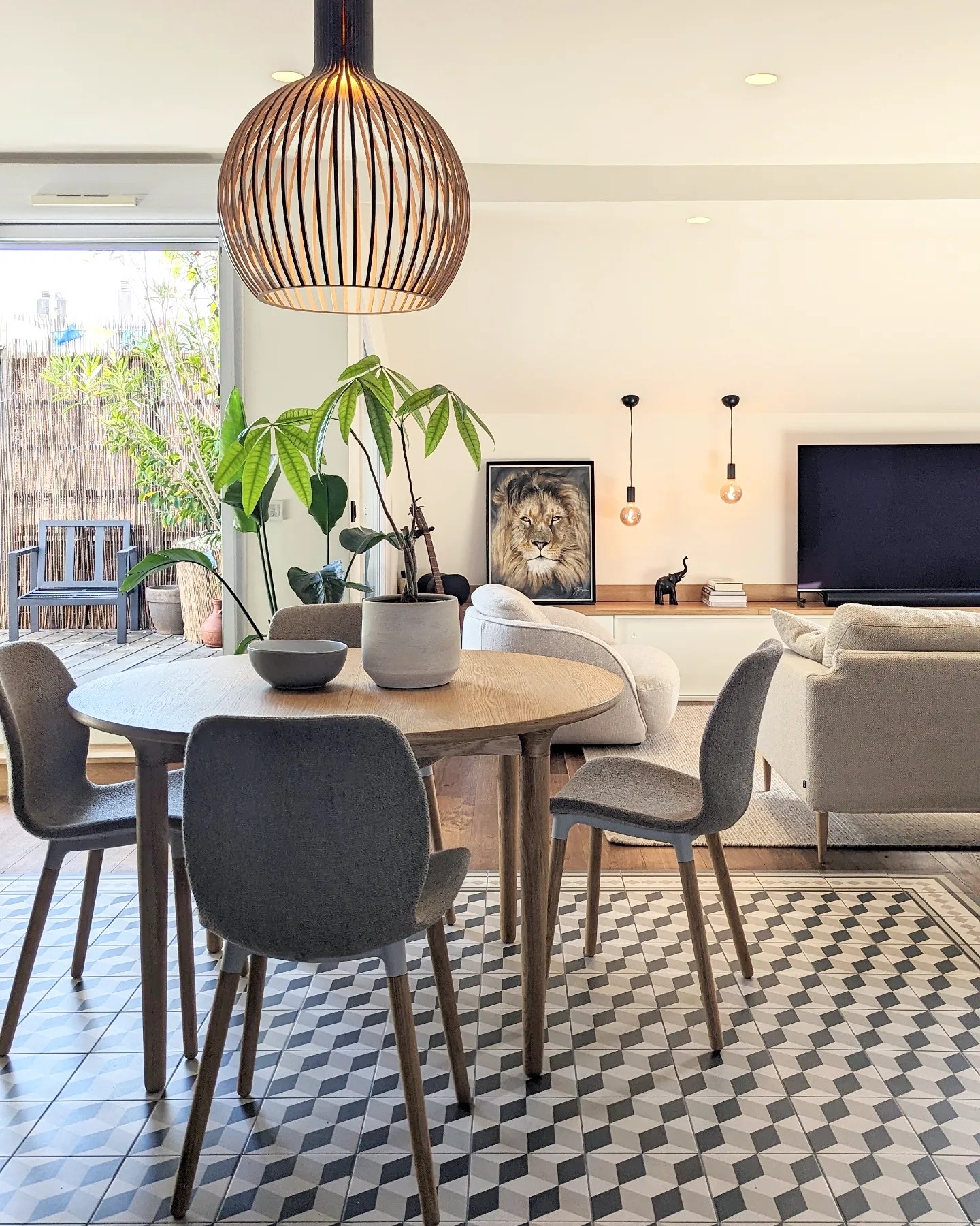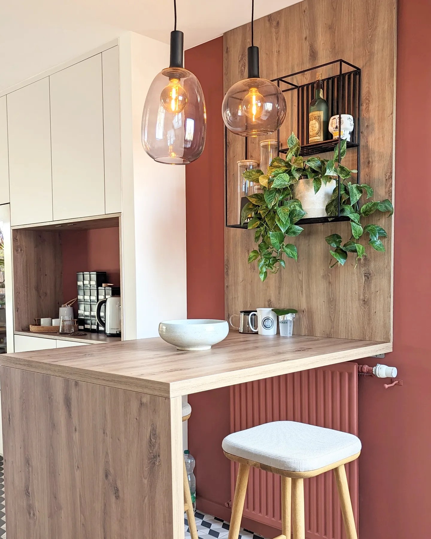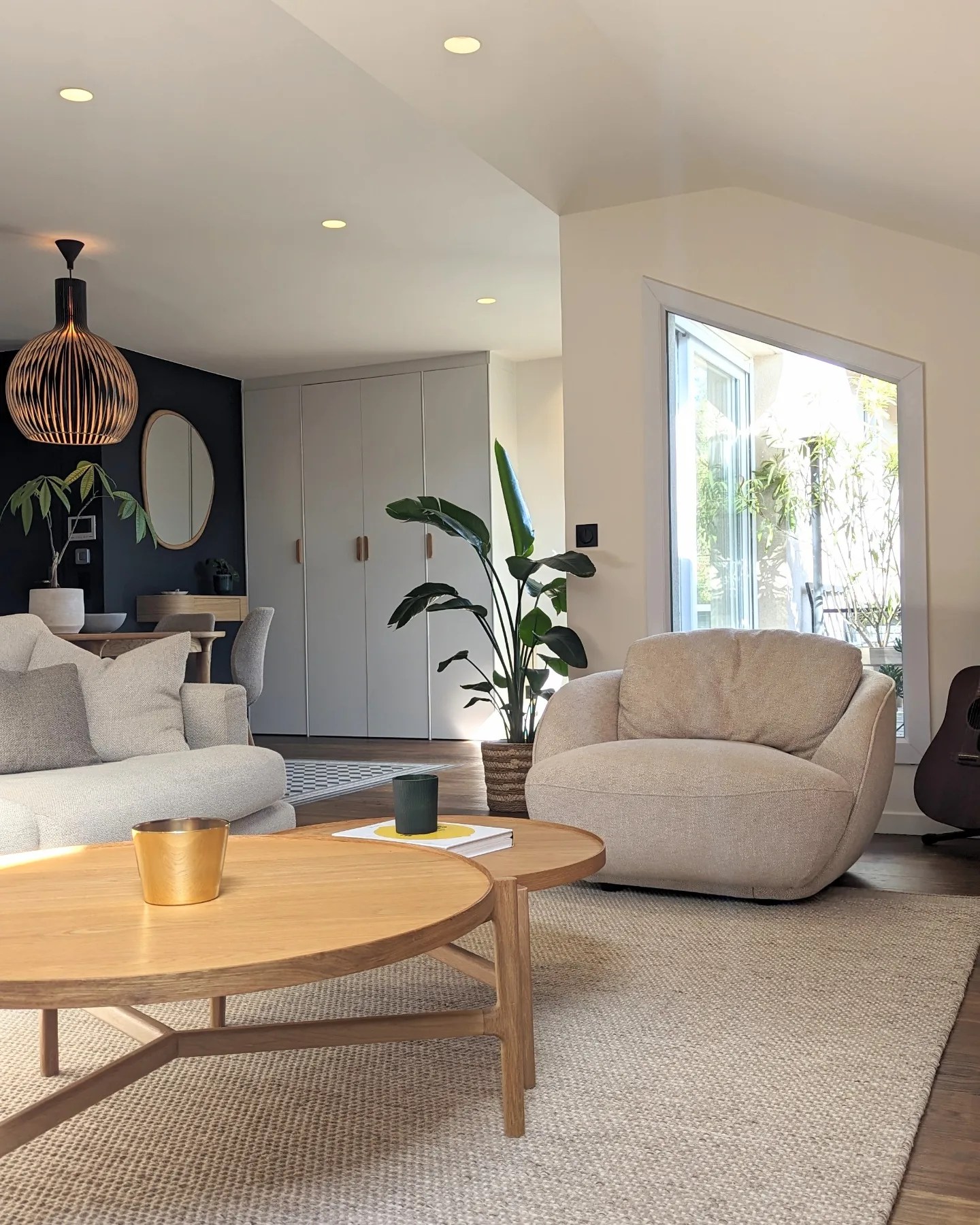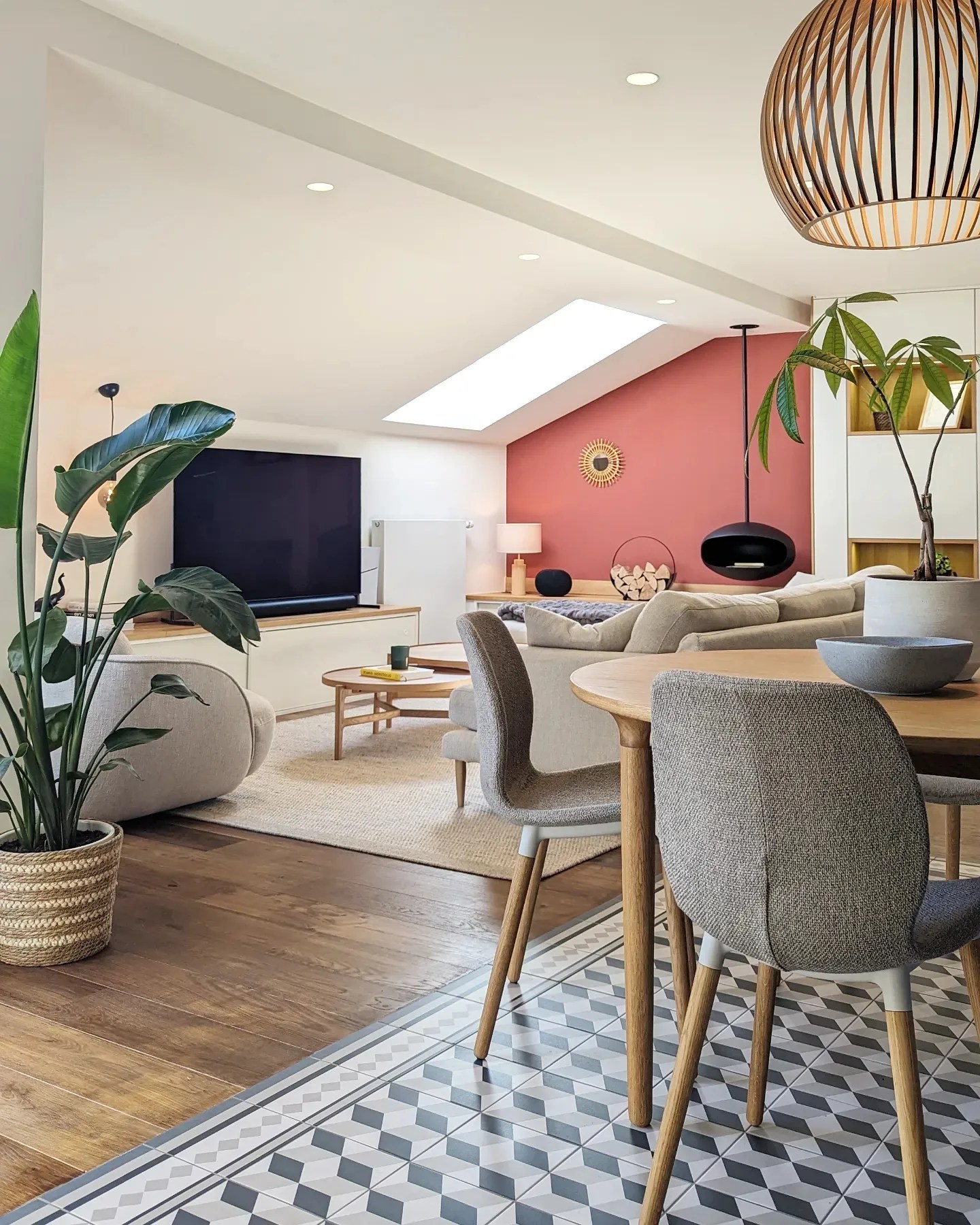 Rénovation d’un bel appartement à Lyon 3ème. Ce salon est le reflet d’une personnalité unique grâce au mélange de styles et à l’utilisation de couleurs et de matériaux variés. Alliant le contemporain avec des touches plus chaleureuses et naturelles. Le résultat est un intérieur vivant et personnalisé. Le choix de matériaux naturels (bois, plantes) et de mobilier confortable confère à l’espace une élégance décontractée, parfaite pour se détendre. Le mur terre de sienne apporte une touche de couleur et de caractère à la pièce. Il sert de point focal et crée une atmosphère chaleureuse. Quant à lui, le noir crée un contraste intéressant avec les autres éléments de la pièce et apporte une touche de profondeur.
