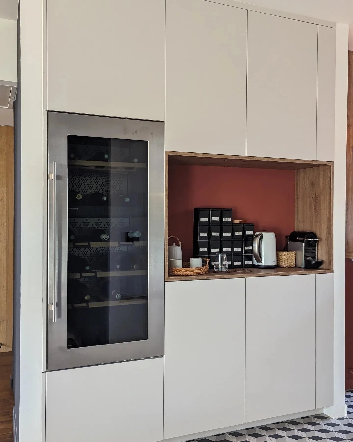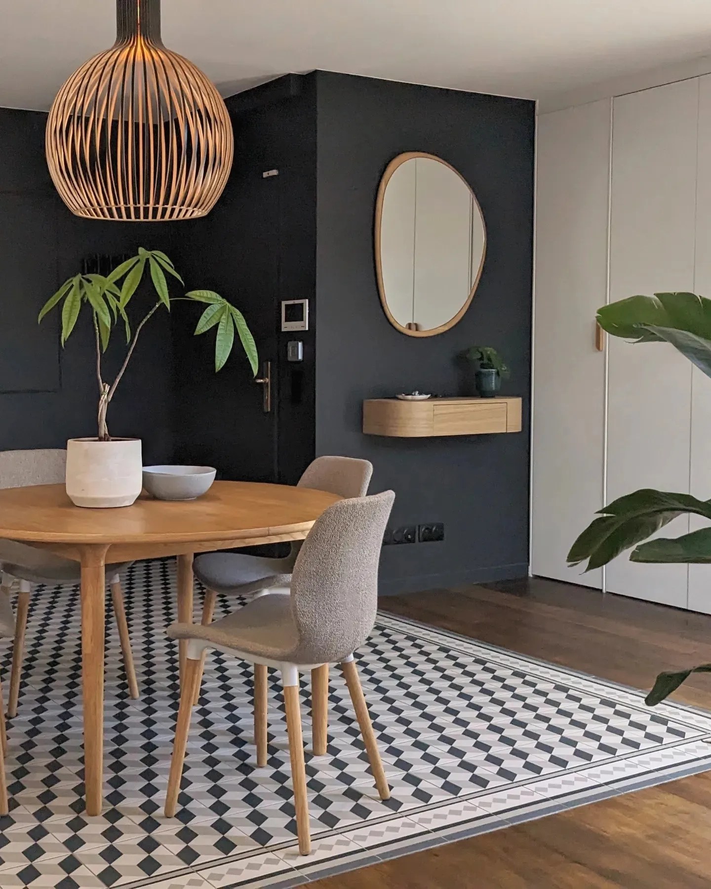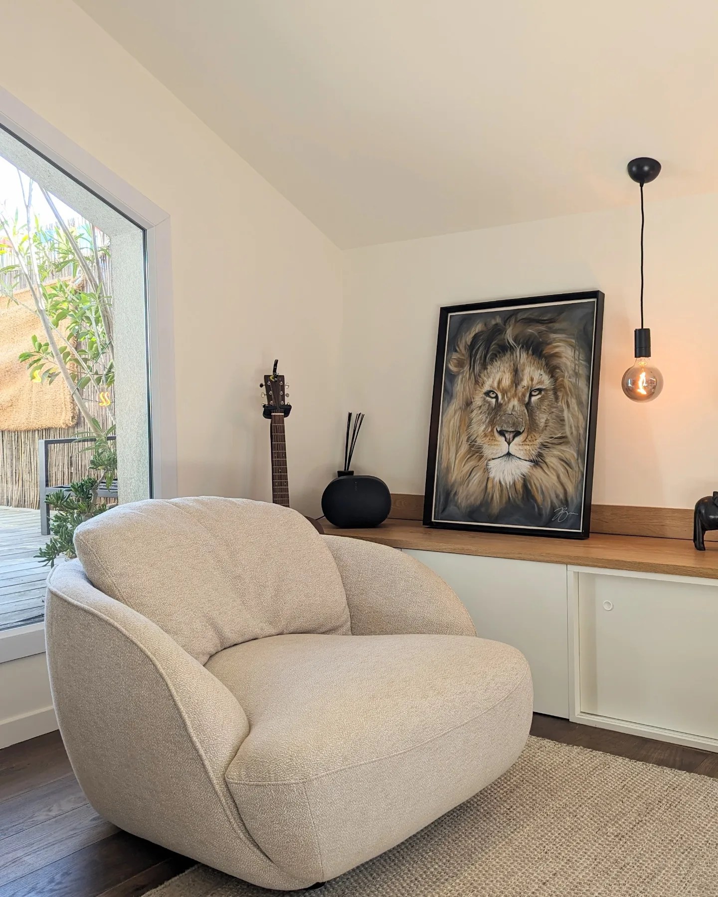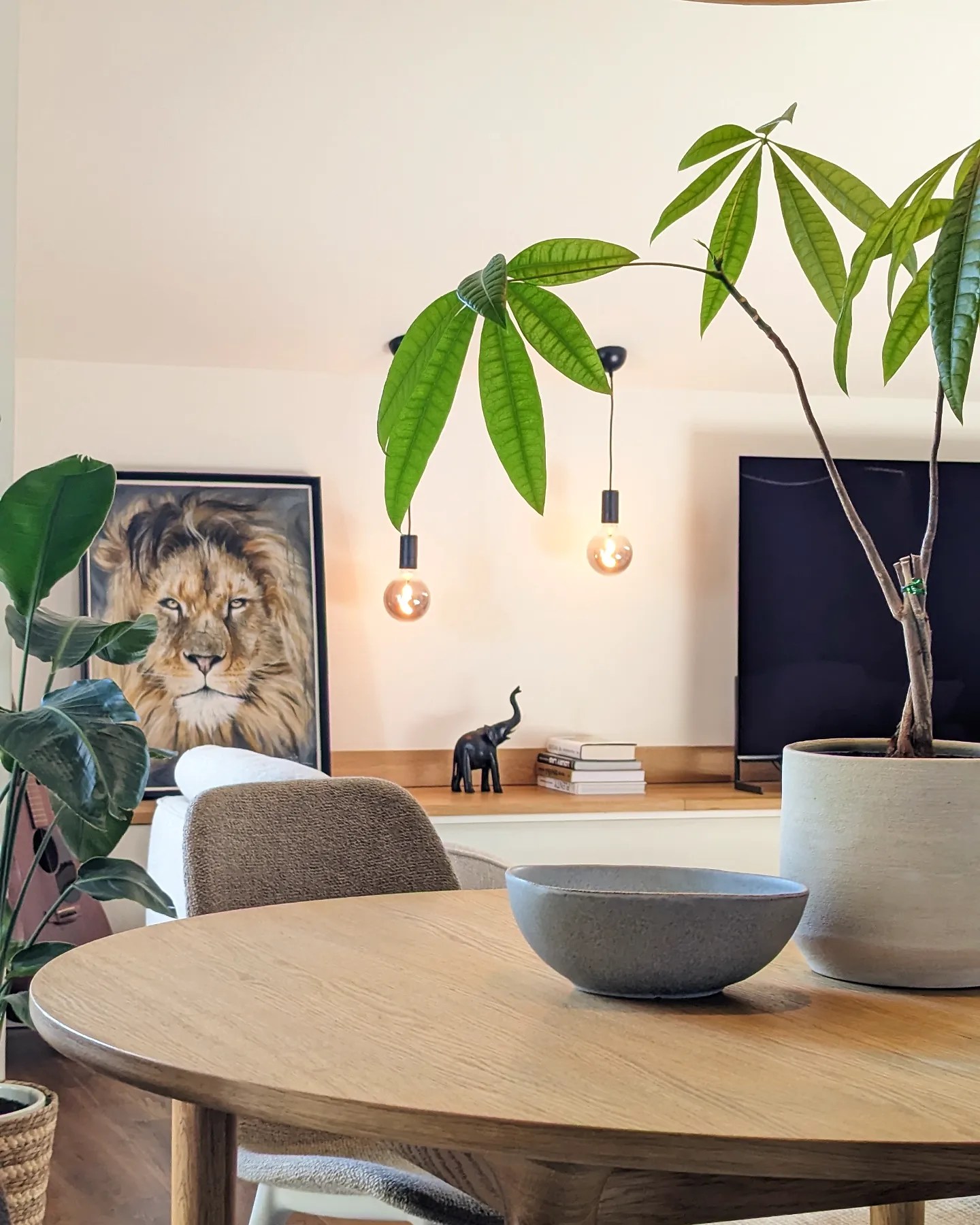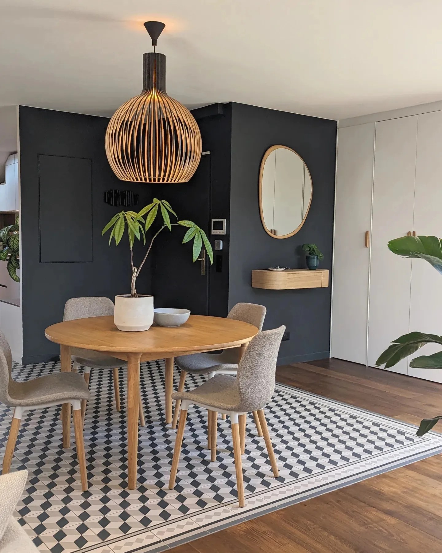 Rénovation d’un bel appartement à Lyon 3ème. Ce salon est le reflet d’une personnalité unique grâce au mélange de styles et à l’utilisation de couleurs et de matériaux variés. Alliant le contemporain avec des touches plus chaleureuses et naturelles. Le résultat est un intérieur vivant et personnalisé. Le choix de matériaux naturels (bois, plantes) et de mobilier confortable confère à l’espace une élégance décontractée, parfaite pour se détendre. Le mur terre de sienne apporte une touche de couleur et de caractère à la pièce. Il sert de point focal et crée une atmosphère chaleureuse. Quant à lui, le noir crée un contraste intéressant avec les autres éléments de la pièce et apporte une touche de profondeur.
