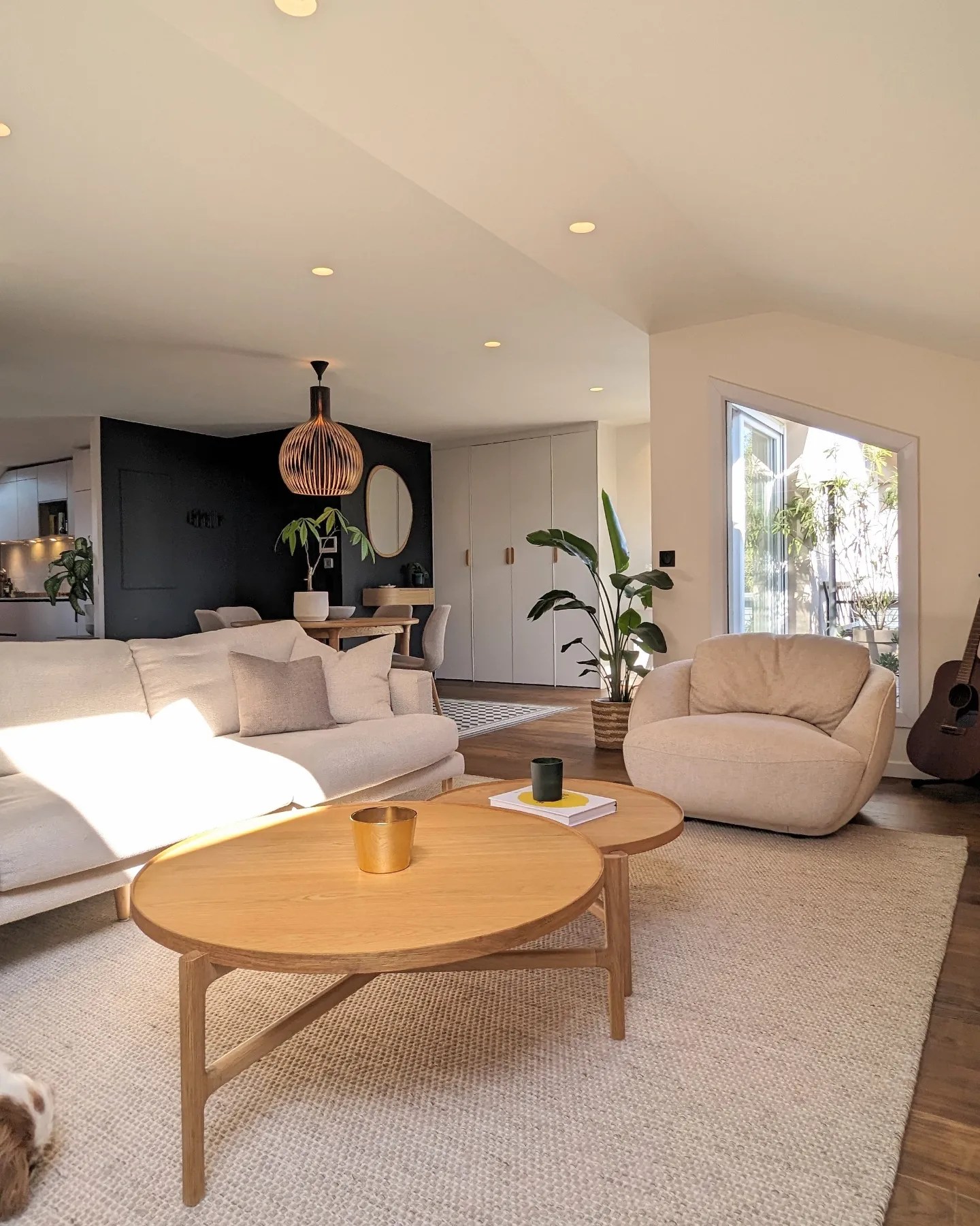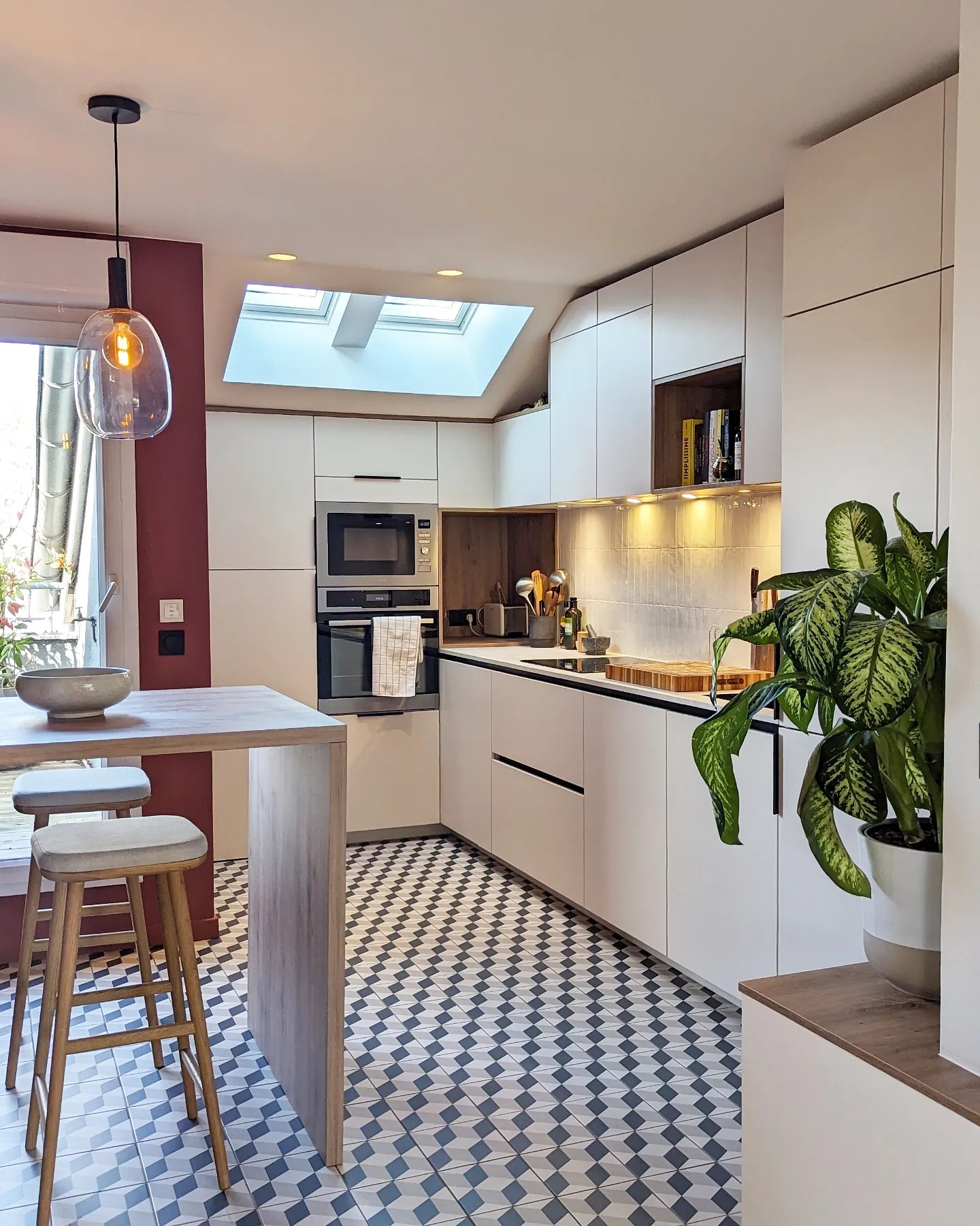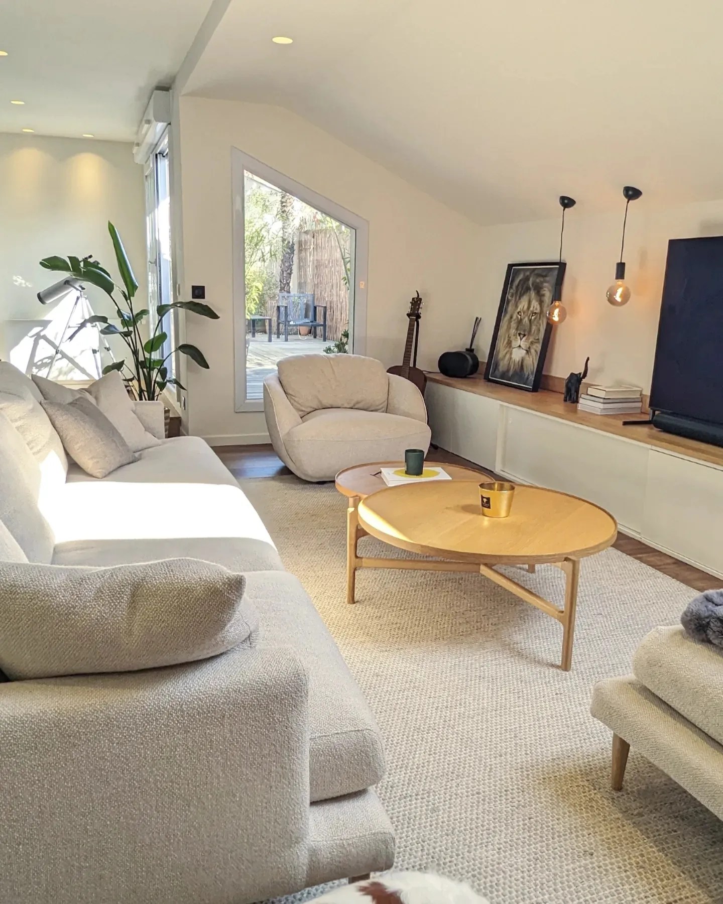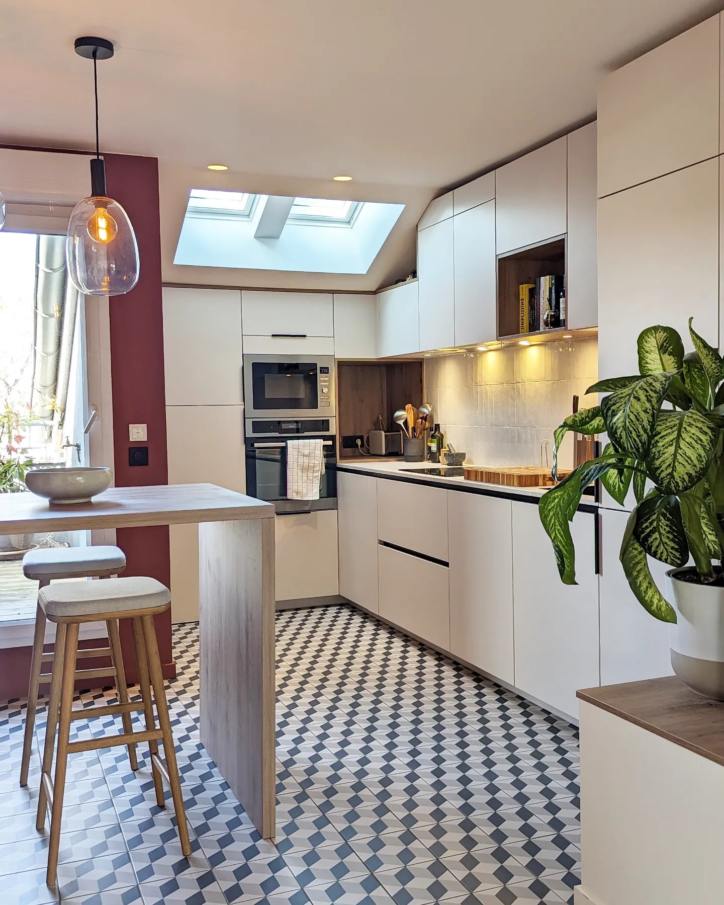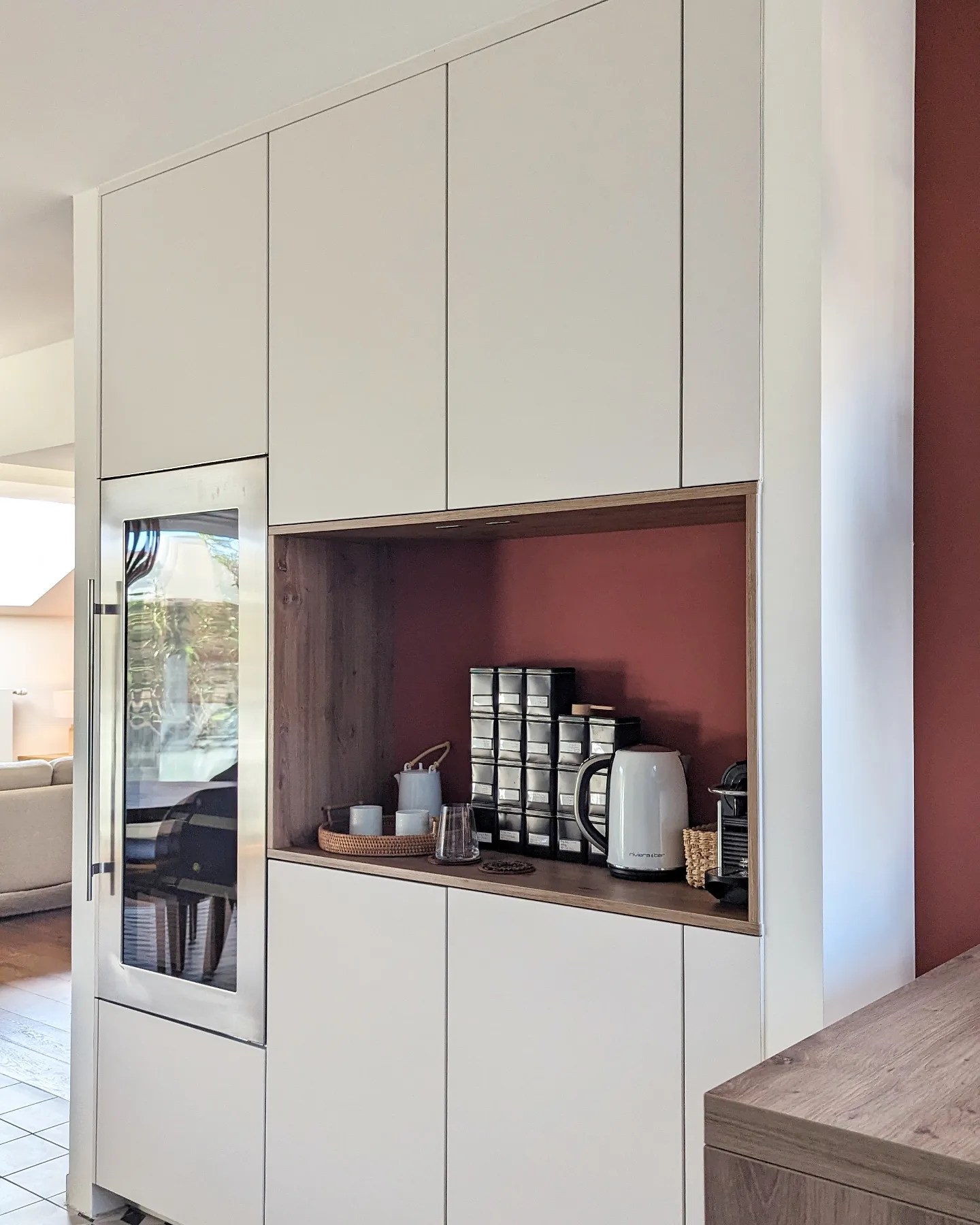 Rénovation d’un bel appartement à Lyon 3ème. Ce salon est le reflet d’une personnalité unique grâce au mélange de styles et à l’utilisation de couleurs et de matériaux variés. Alliant le contemporain avec des touches plus chaleureuses et naturelles. Le résultat est un intérieur vivant et personnalisé. Le choix de matériaux naturels (bois, plantes) et de mobilier confortable confère à l’espace une élégance décontractée, parfaite pour se détendre. Le mur terre de sienne apporte une touche de couleur et de caractère à la pièce. Il sert de point focal et crée une atmosphère chaleureuse. Quant à lui, le noir crée un contraste intéressant avec les autres éléments de la pièce et apporte une touche de profondeur.