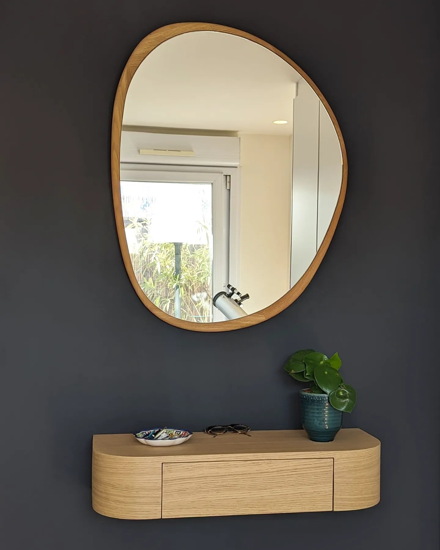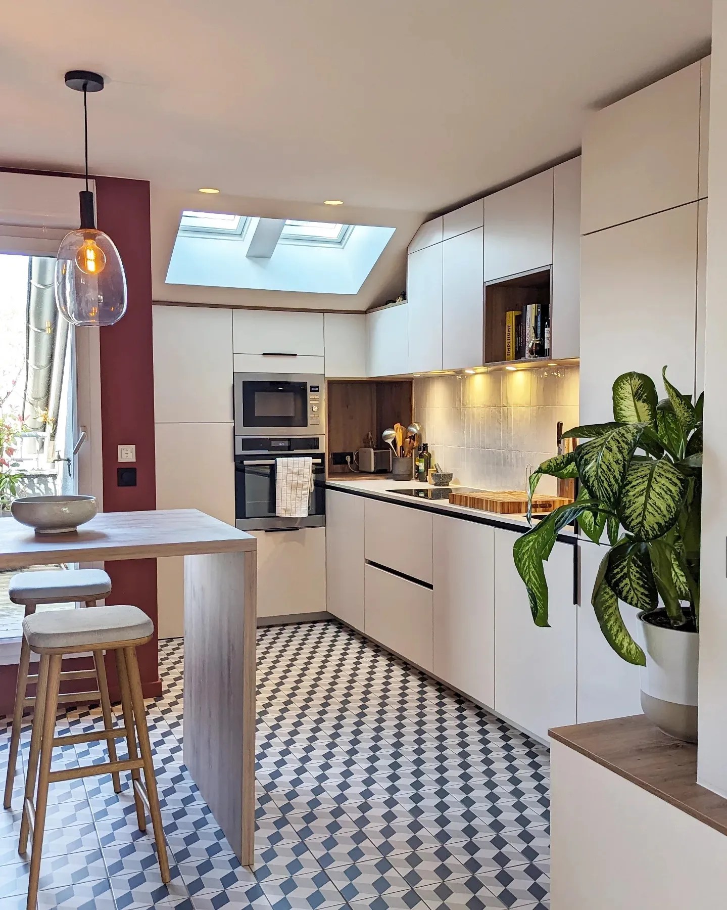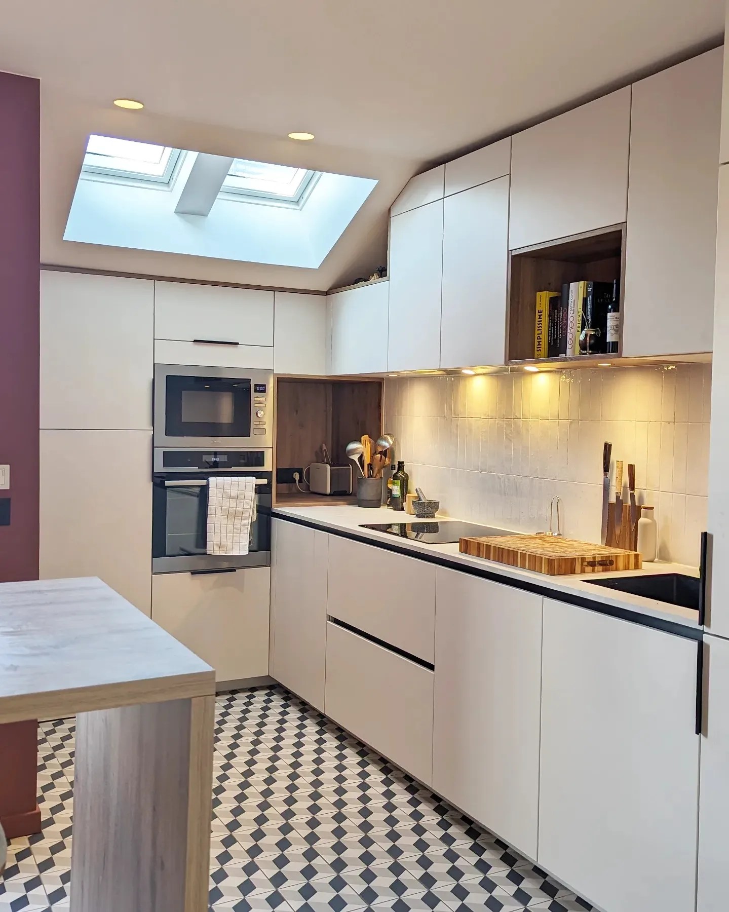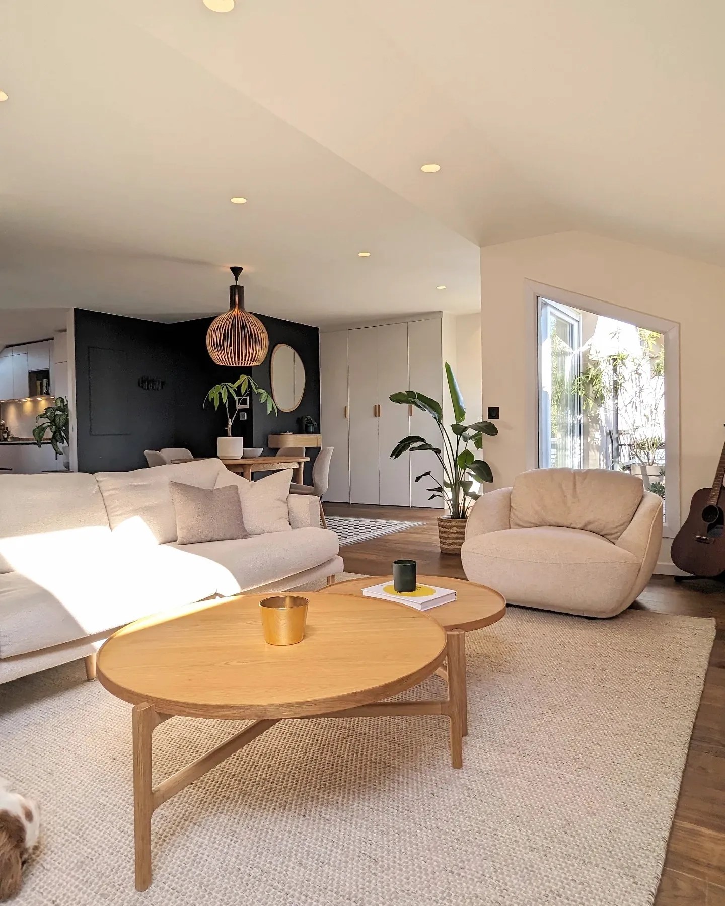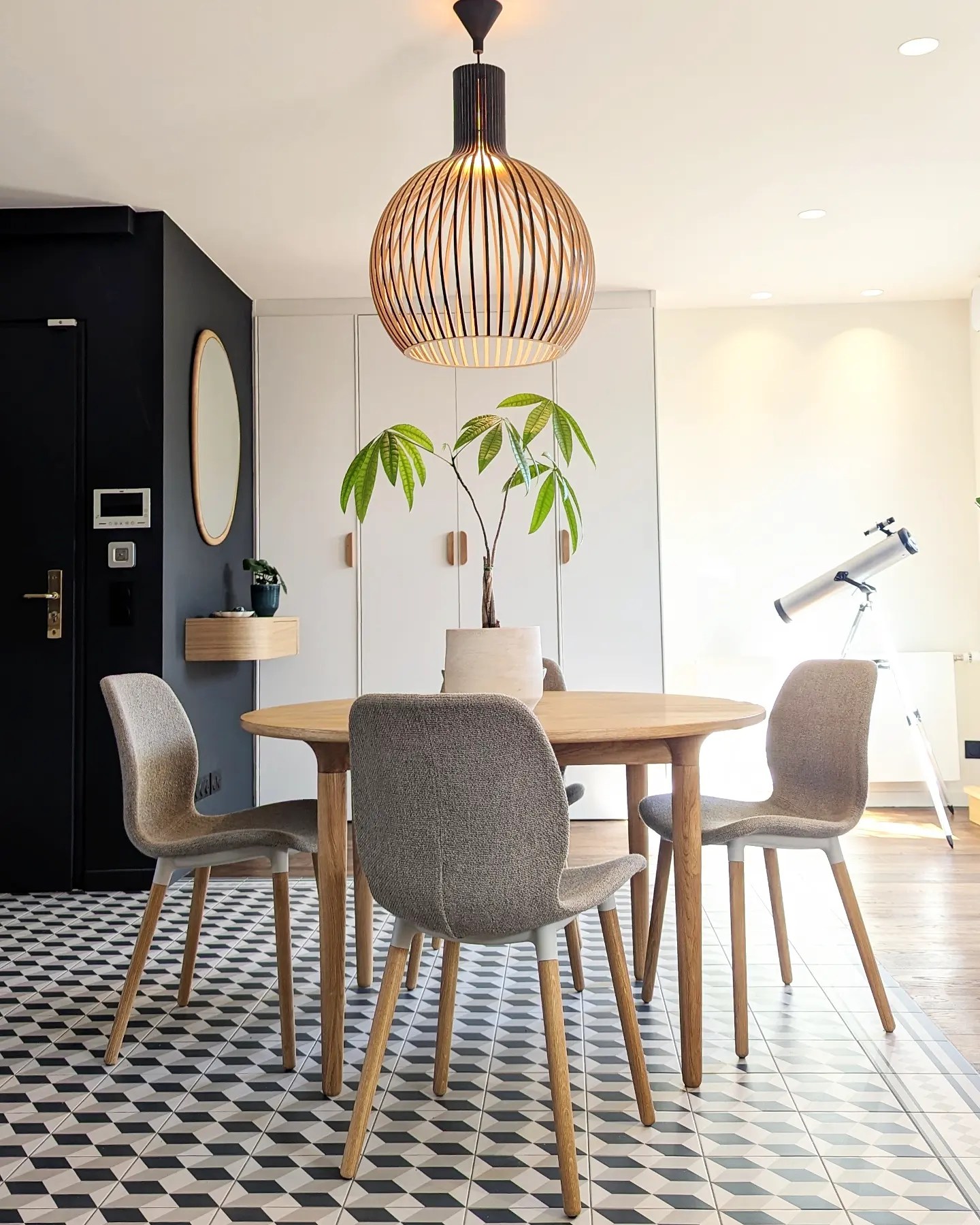 Rénovation d’un bel appartement à Lyon 3ème. Ce salon est le reflet d’une personnalité unique grâce au mélange de styles et à l’utilisation de couleurs et de matériaux variés. Alliant le contemporain avec des touches plus chaleureuses et naturelles. Le résultat est un intérieur vivant et personnalisé. Le choix de matériaux naturels (bois, plantes) et de mobilier confortable confère à l’espace une élégance décontractée, parfaite pour se détendre. Le mur terre de sienne apporte une touche de couleur et de caractère à la pièce. Il sert de point focal et crée une atmosphère chaleureuse. Quant à lui, le noir crée un contraste intéressant avec les autres éléments de la pièce et apporte une touche de profondeur.