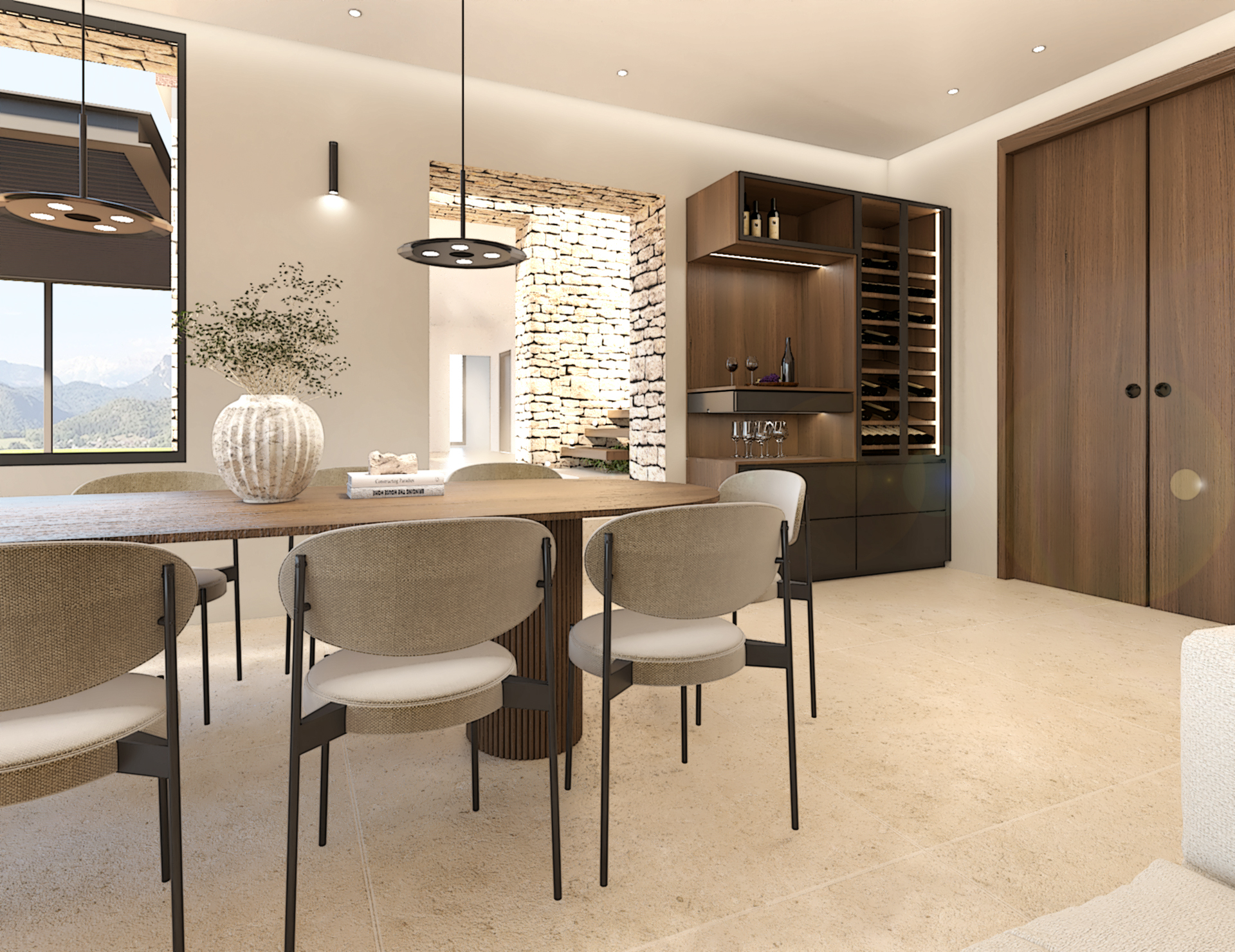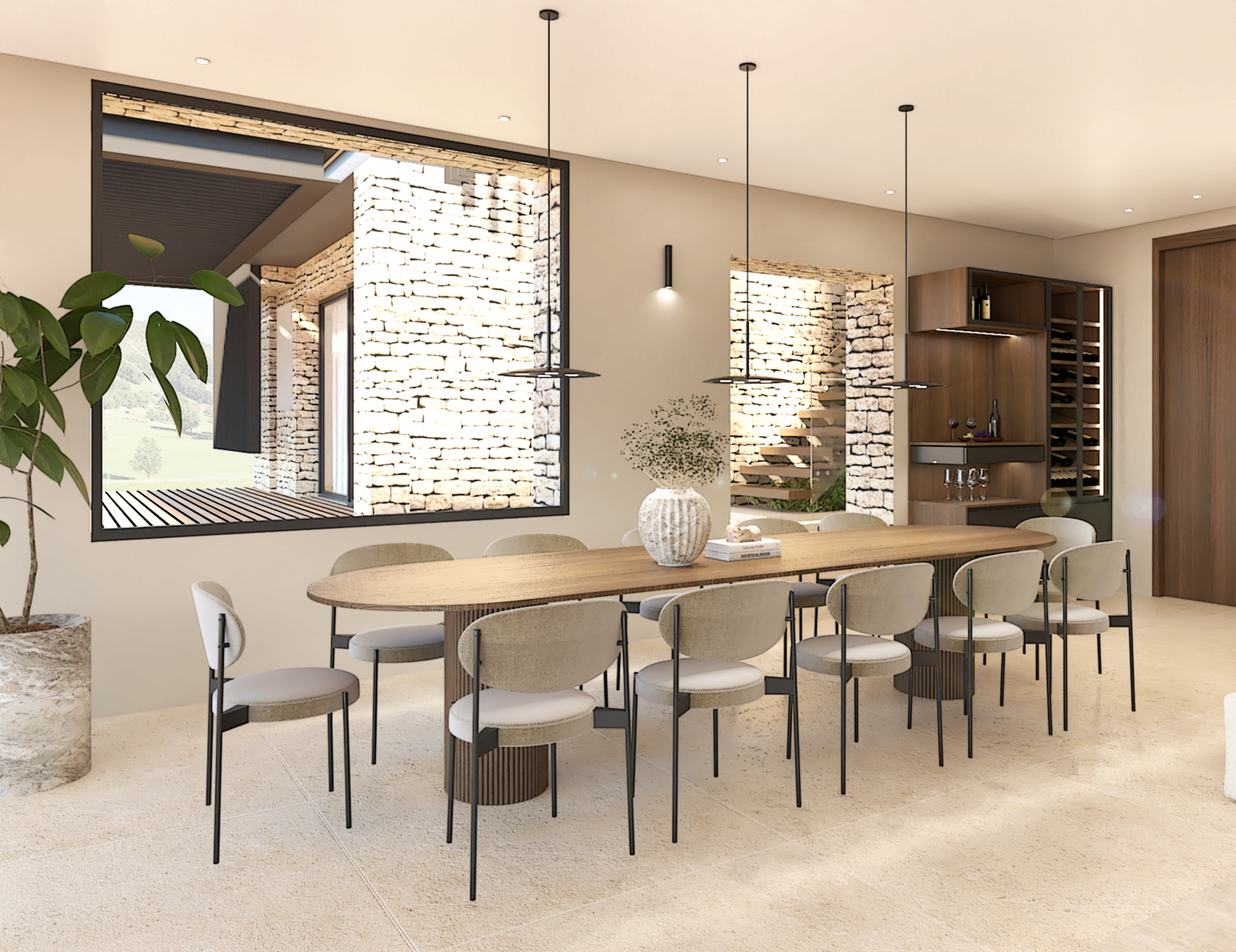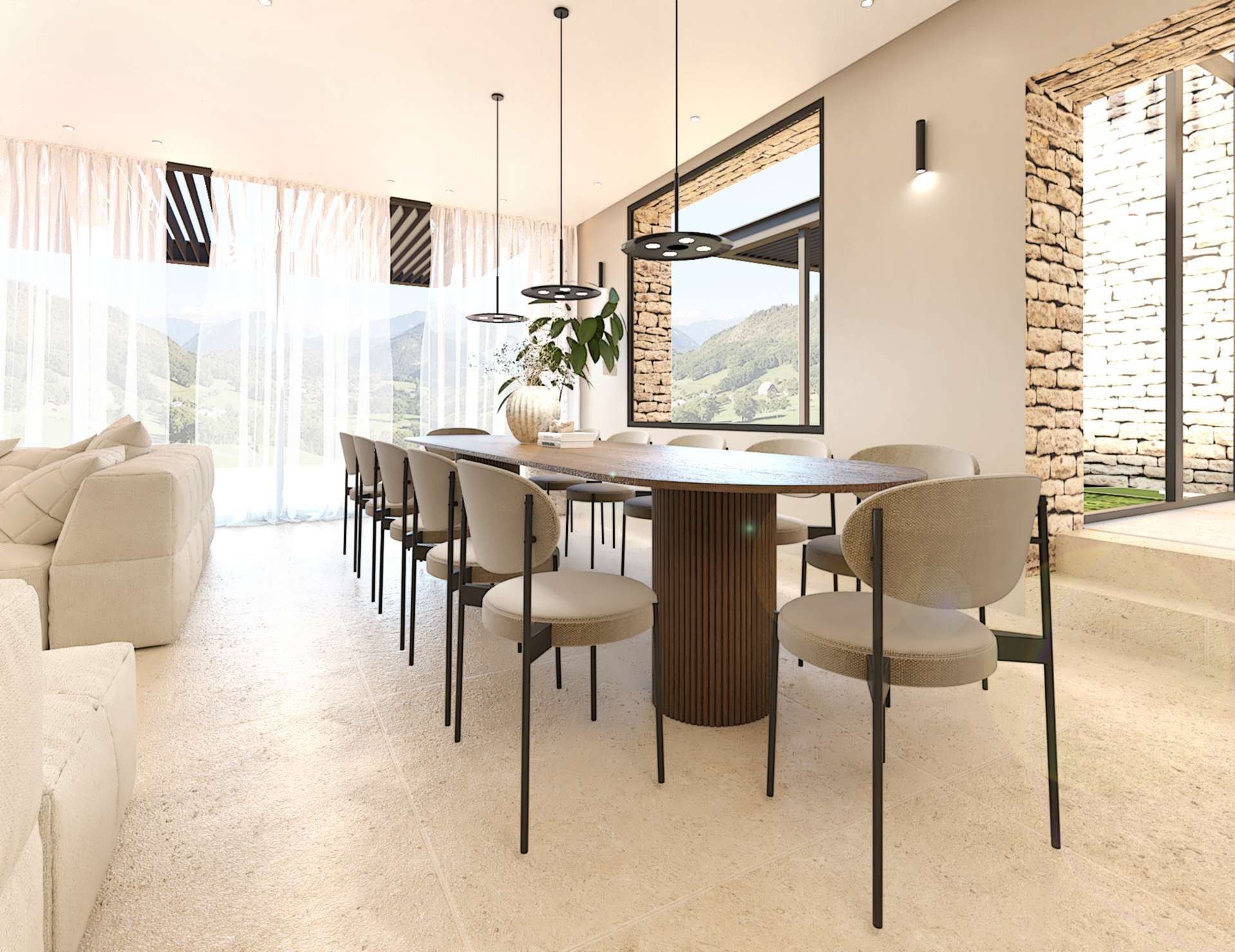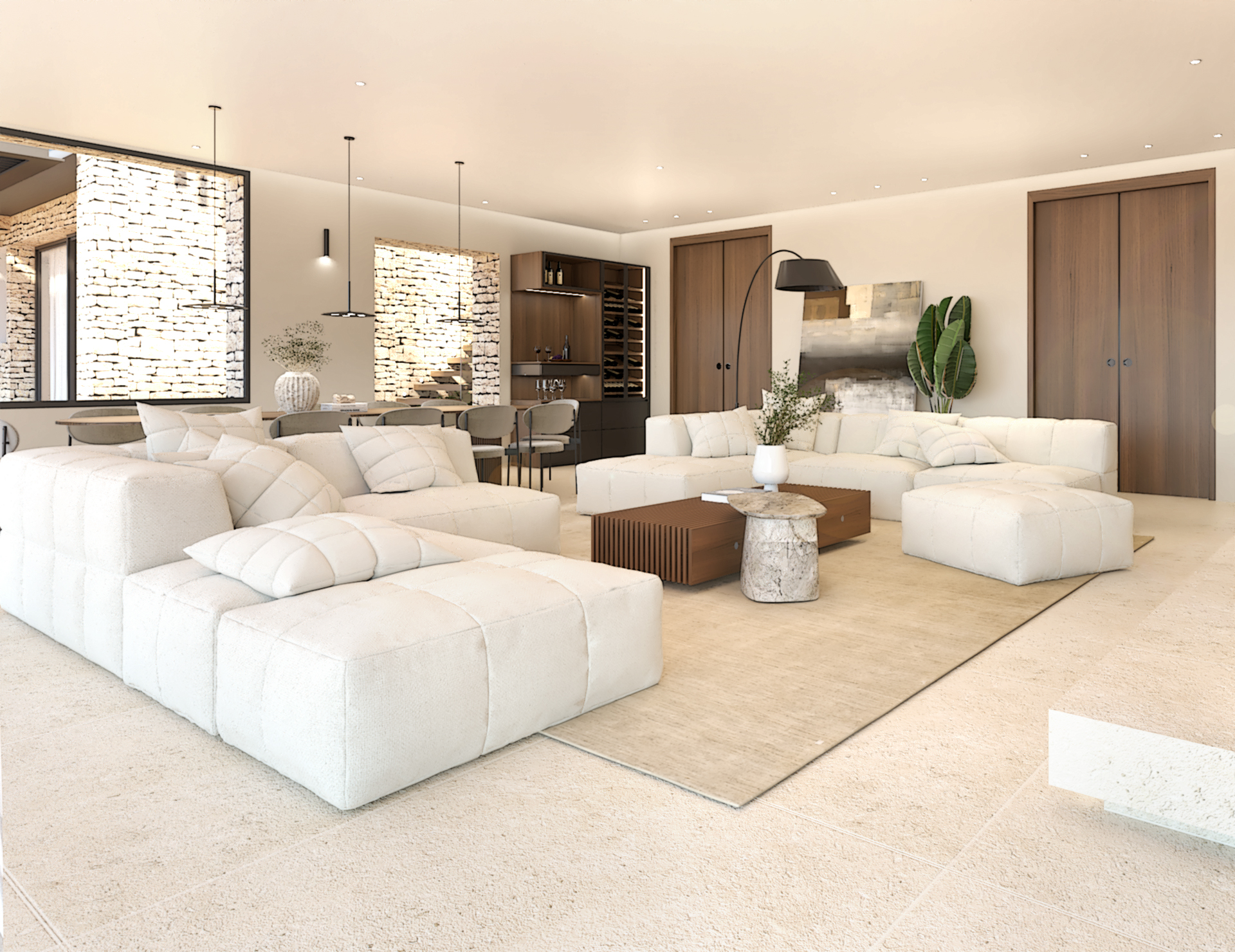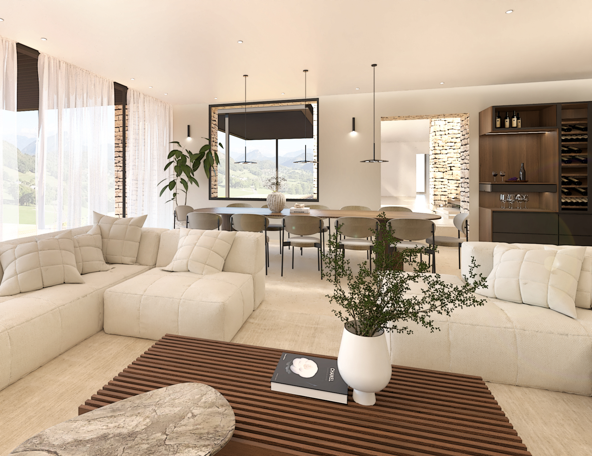 Décoration et villa d’une maison en construction de 300m2. Les lignes sont simples et épurées, avec peu d’éléments décoratifs. L’objectif est de créer un espace aéré et fonctionnel. Les matériaux utilisés sont principalement naturels : bois, pierre naturelle (mur en pierre apparente), et textiles naturels. Cela apporte une sensation de chaleur et de bien-être. Les matériaux nobles utilisés, comme le bois et la pierre naturelle, confèrent à l’espace une atmosphère de luxe et de raffinement. L’ensemble dégage une atmosphère calme et sereine, propice à la détente et à la convivialité.