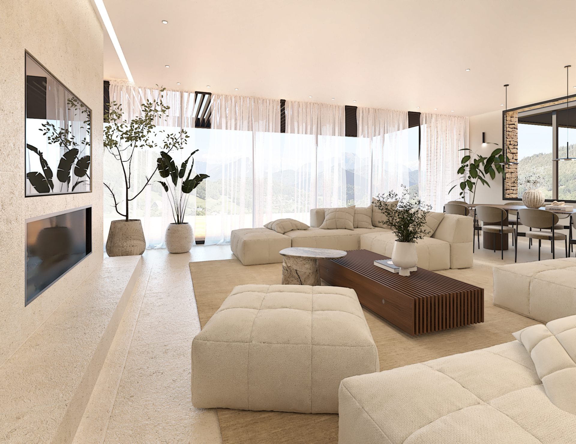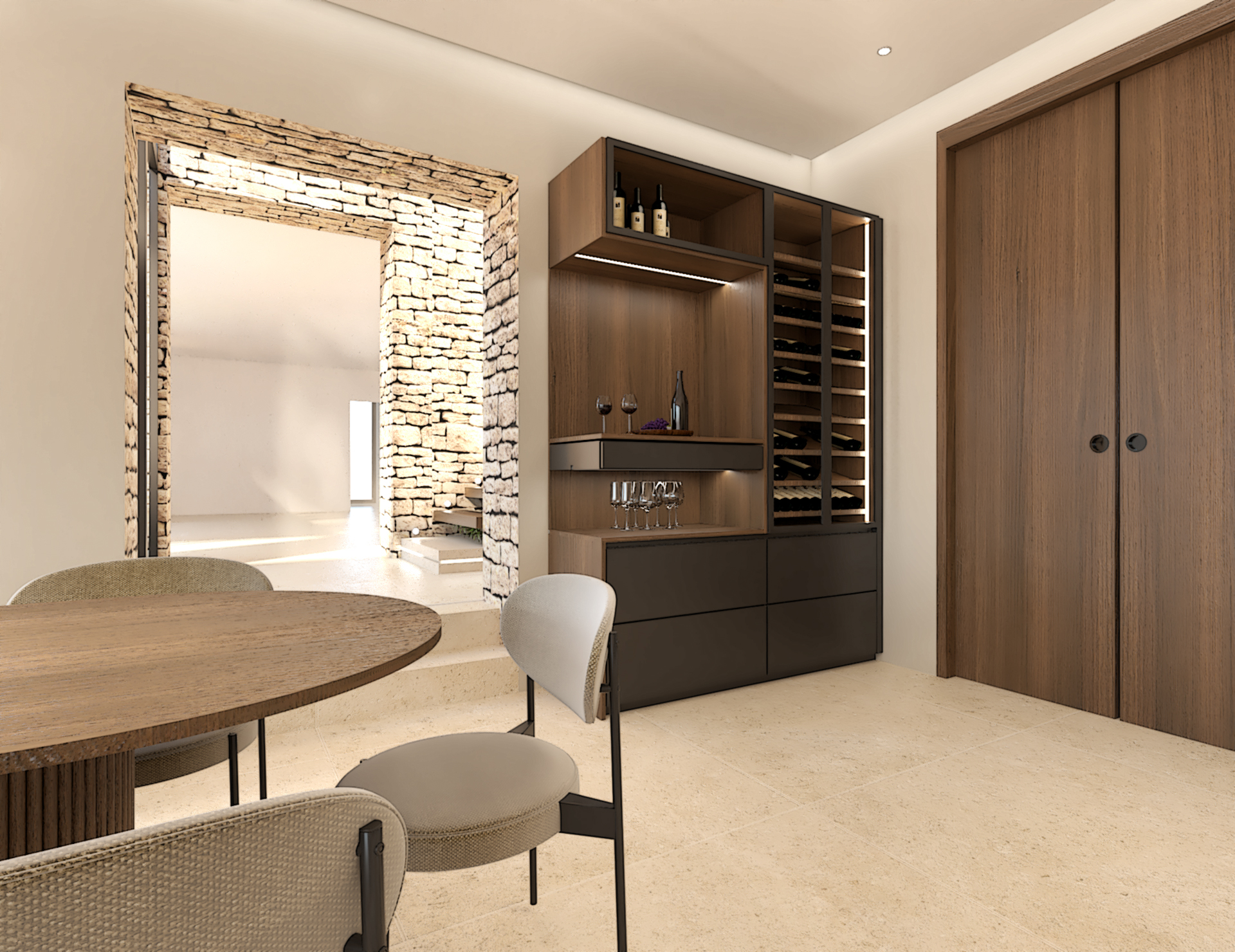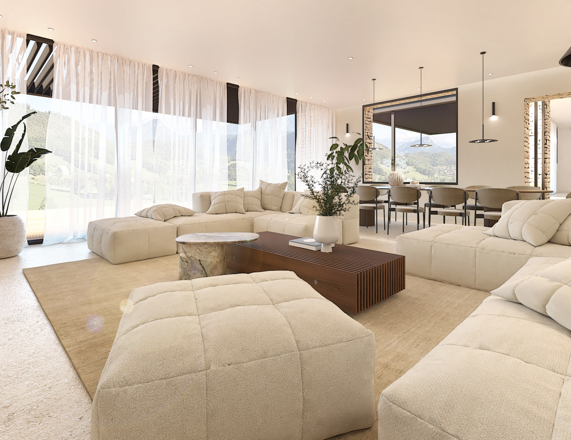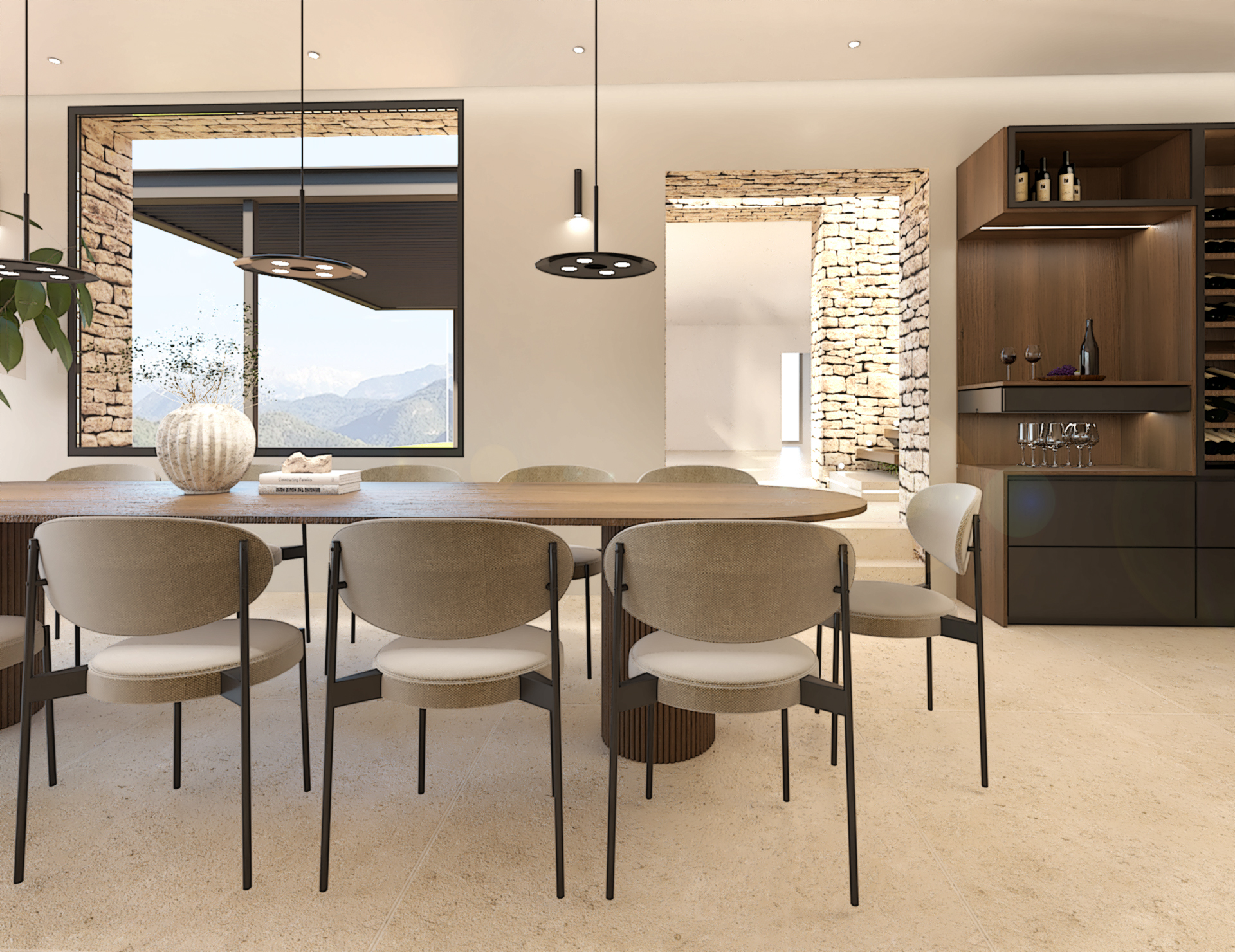 Décoration et villa d’une maison en construction de 300m2. Les lignes sont simples et épurées, avec peu d’éléments décoratifs. L’objectif est de créer un espace aéré et fonctionnel. Les matériaux utilisés sont principalement naturels : bois, pierre naturelle (mur en pierre apparente), et textiles naturels. Cela apporte une sensation de chaleur et de bien-être. Les matériaux nobles utilisés, comme le bois et la pierre naturelle, confèrent à l’espace une atmosphère de luxe et de raffinement. L’ensemble dégage une atmosphère calme et sereine, propice à la détente et à la convivialité.