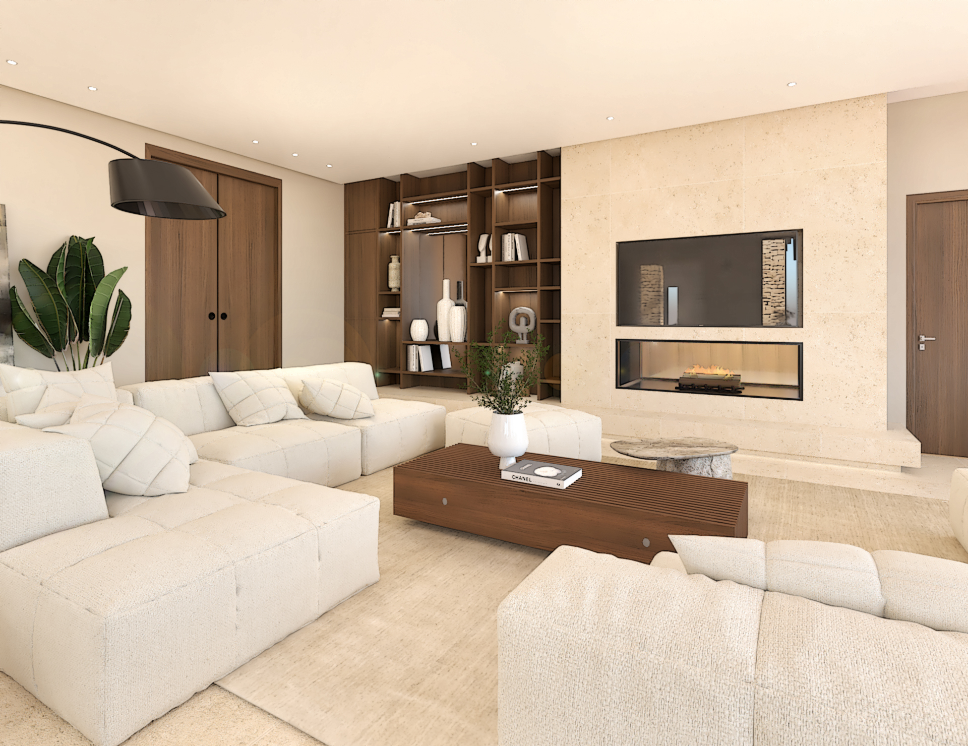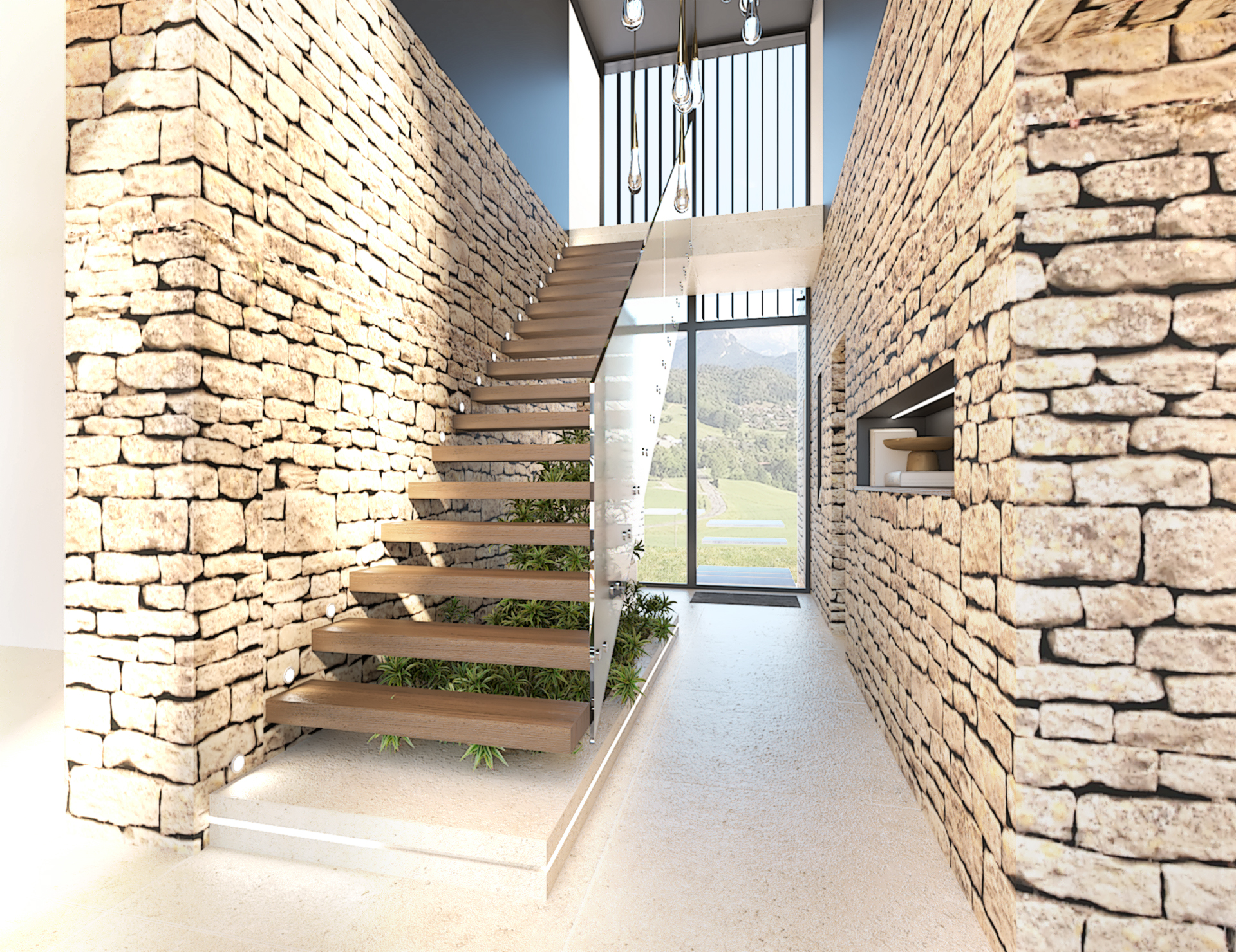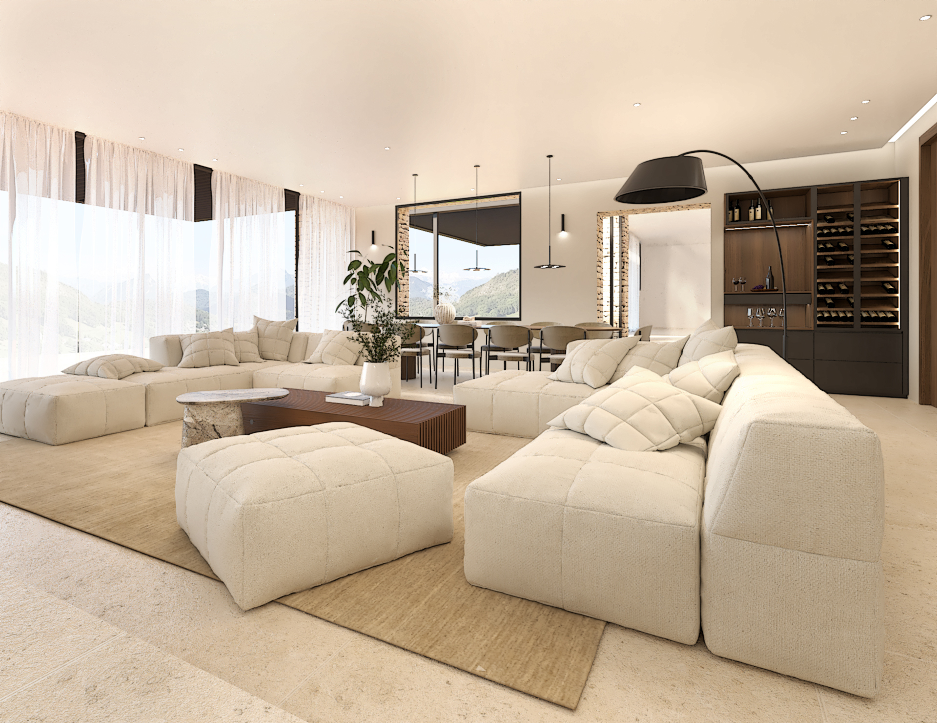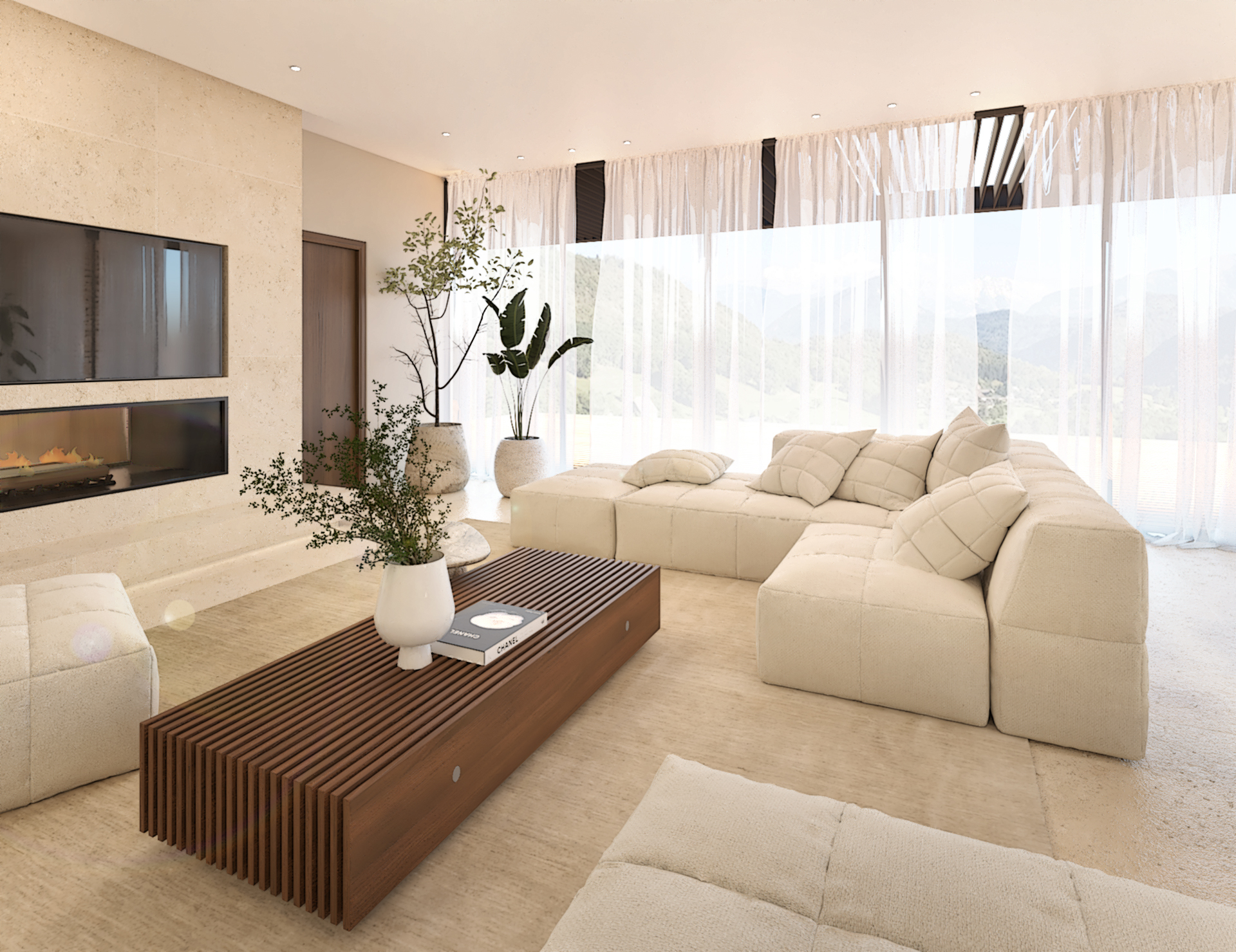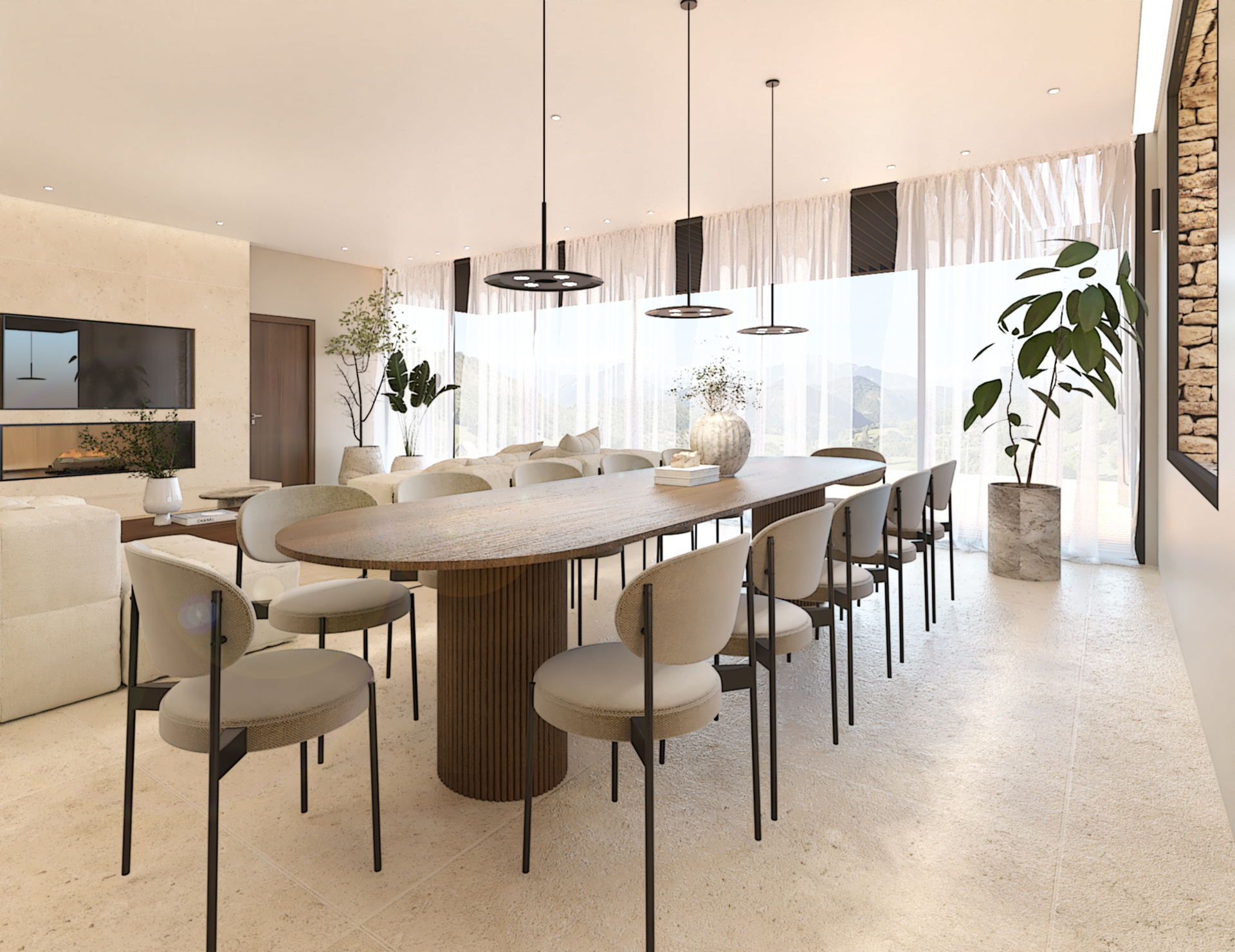 Décoration et villa d’une maison en construction de 300m2. Les lignes sont simples et épurées, avec peu d’éléments décoratifs. L’objectif est de créer un espace aéré et fonctionnel. Les matériaux utilisés sont principalement naturels : bois, pierre naturelle (mur en pierre apparente), et textiles naturels. Cela apporte une sensation de chaleur et de bien-être. Les matériaux nobles utilisés, comme le bois et la pierre naturelle, confèrent à l’espace une atmosphère de luxe et de raffinement. L’ensemble dégage une atmosphère calme et sereine, propice à la détente et à la convivialité.