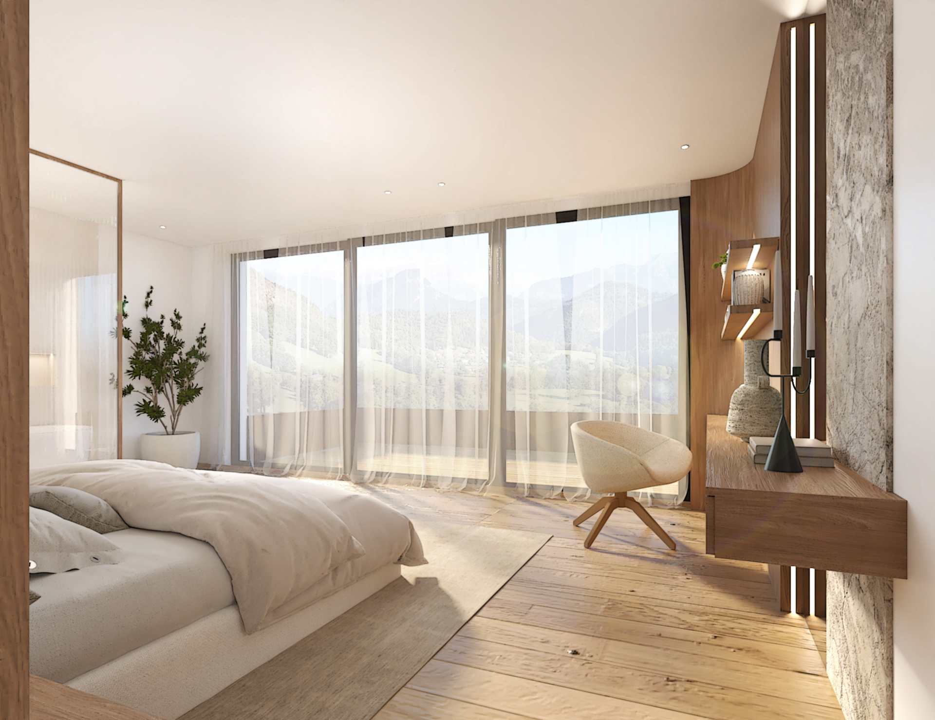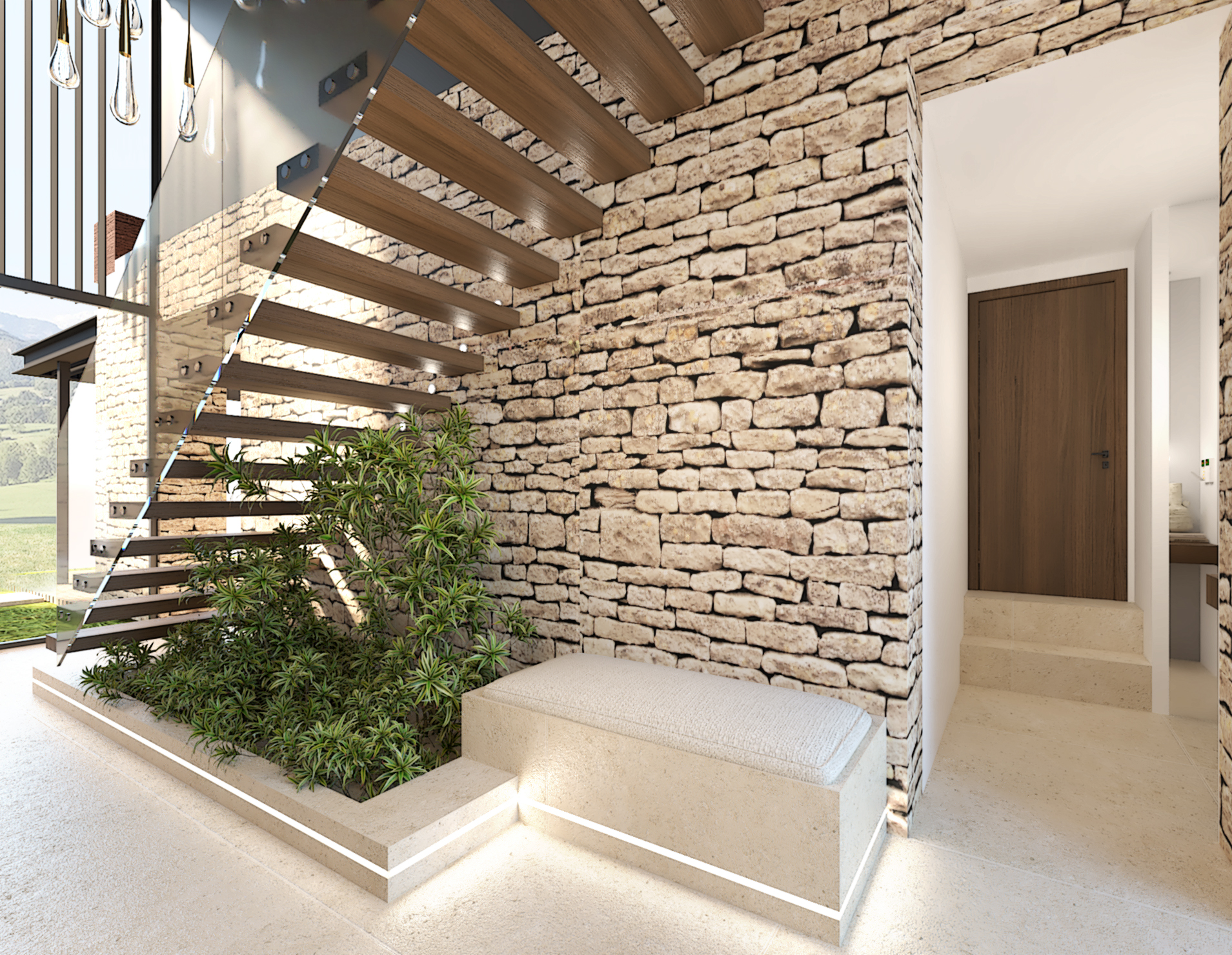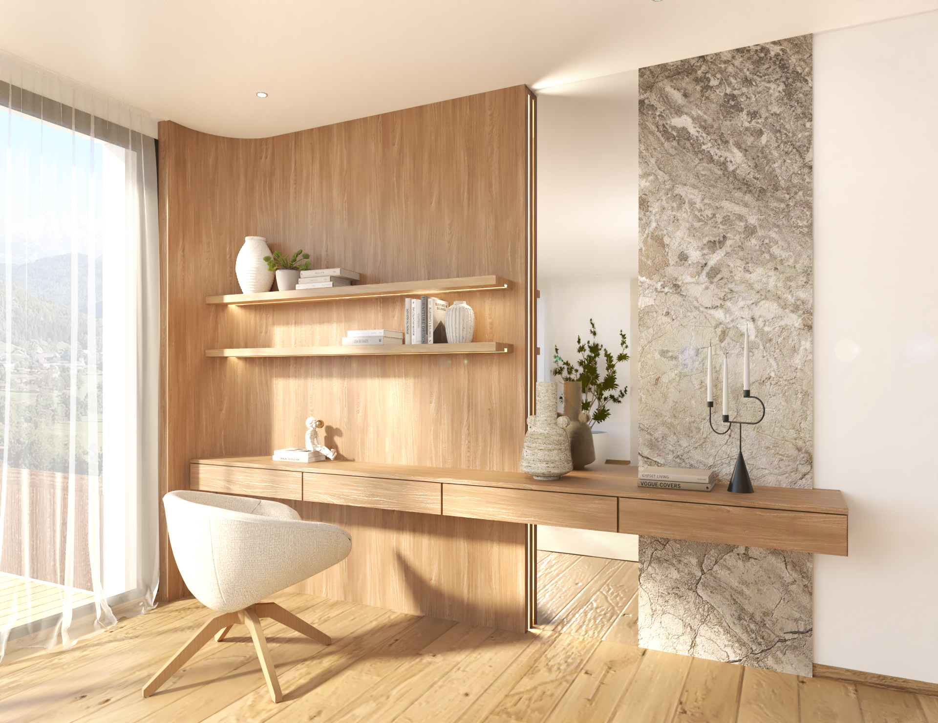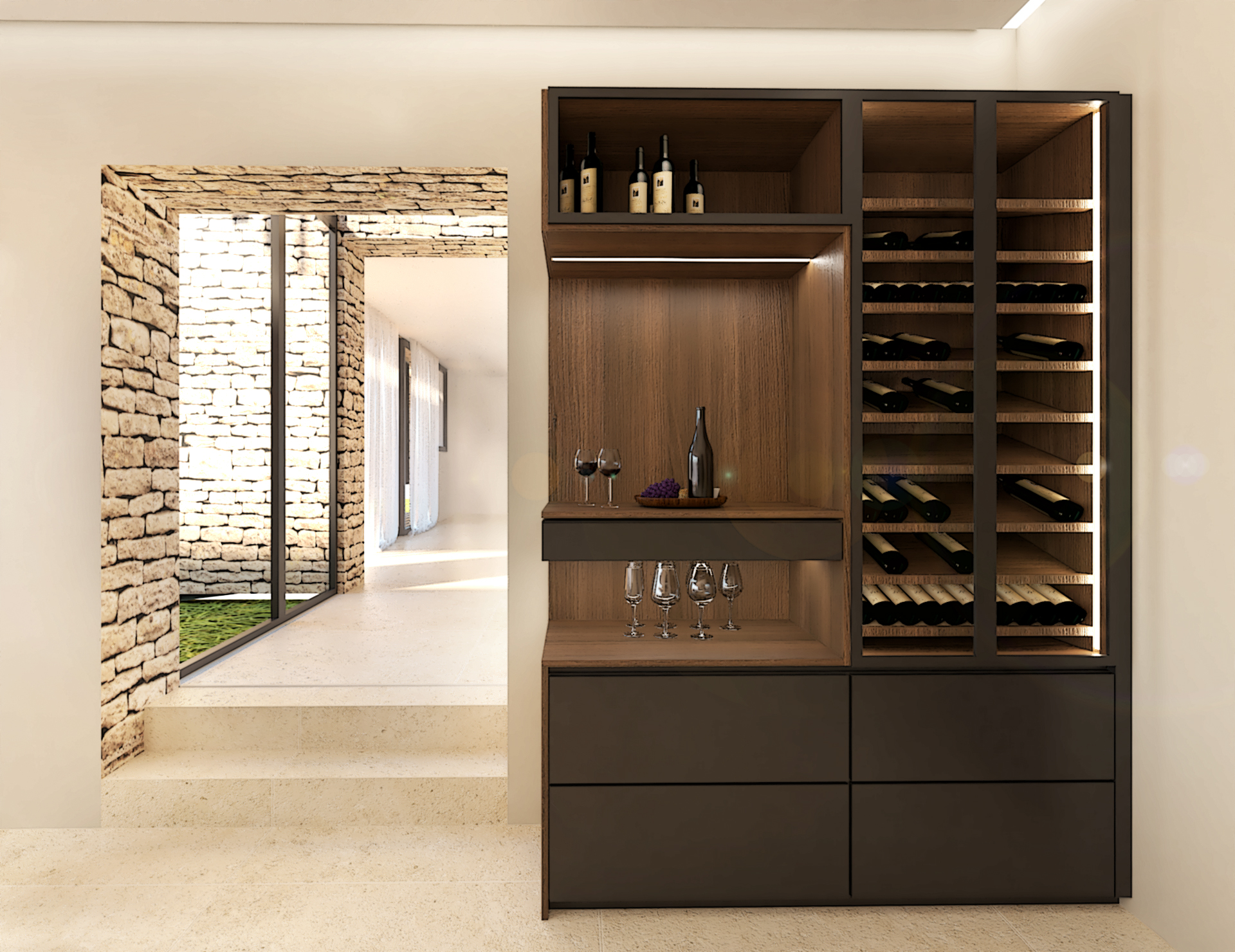 Décoration et villa d’une maison en construction de 300m2. Les lignes sont simples et épurées, avec peu d’éléments décoratifs. L’objectif est de créer un espace aéré et fonctionnel. Les matériaux utilisés sont principalement naturels : bois, pierre naturelle (mur en pierre apparente), et textiles naturels. Cela apporte une sensation de chaleur et de bien-être. Les matériaux nobles utilisés, comme le bois et la pierre naturelle, confèrent à l’espace une atmosphère de luxe et de raffinement. L’ensemble dégage une atmosphère calme et sereine, propice à la détente et à la convivialité.